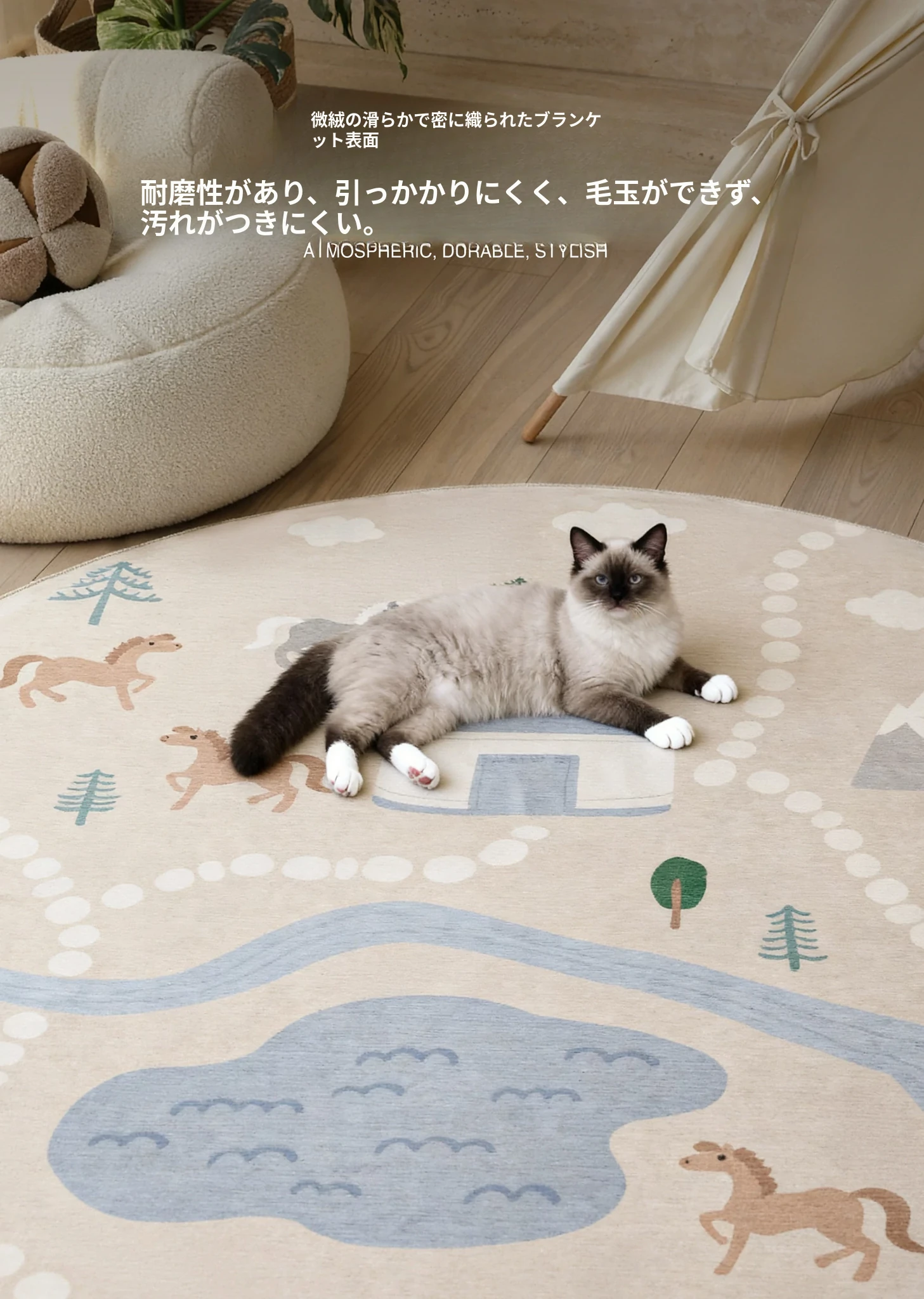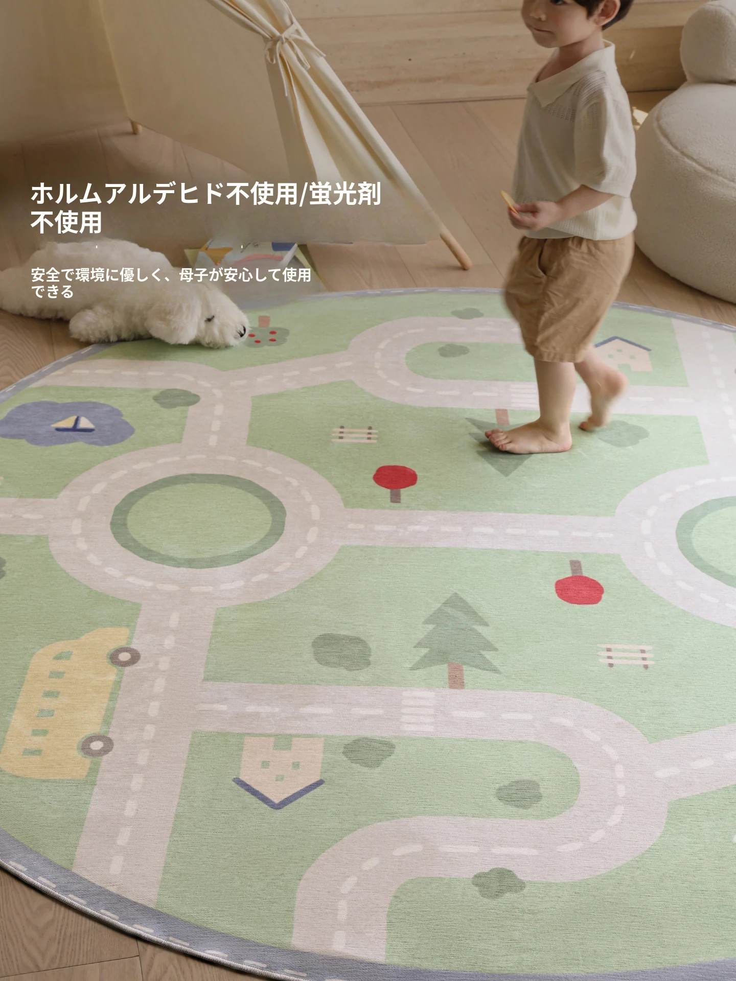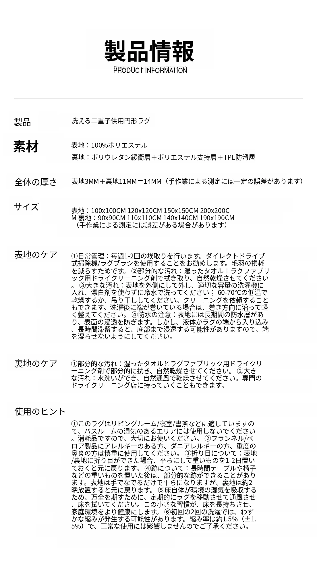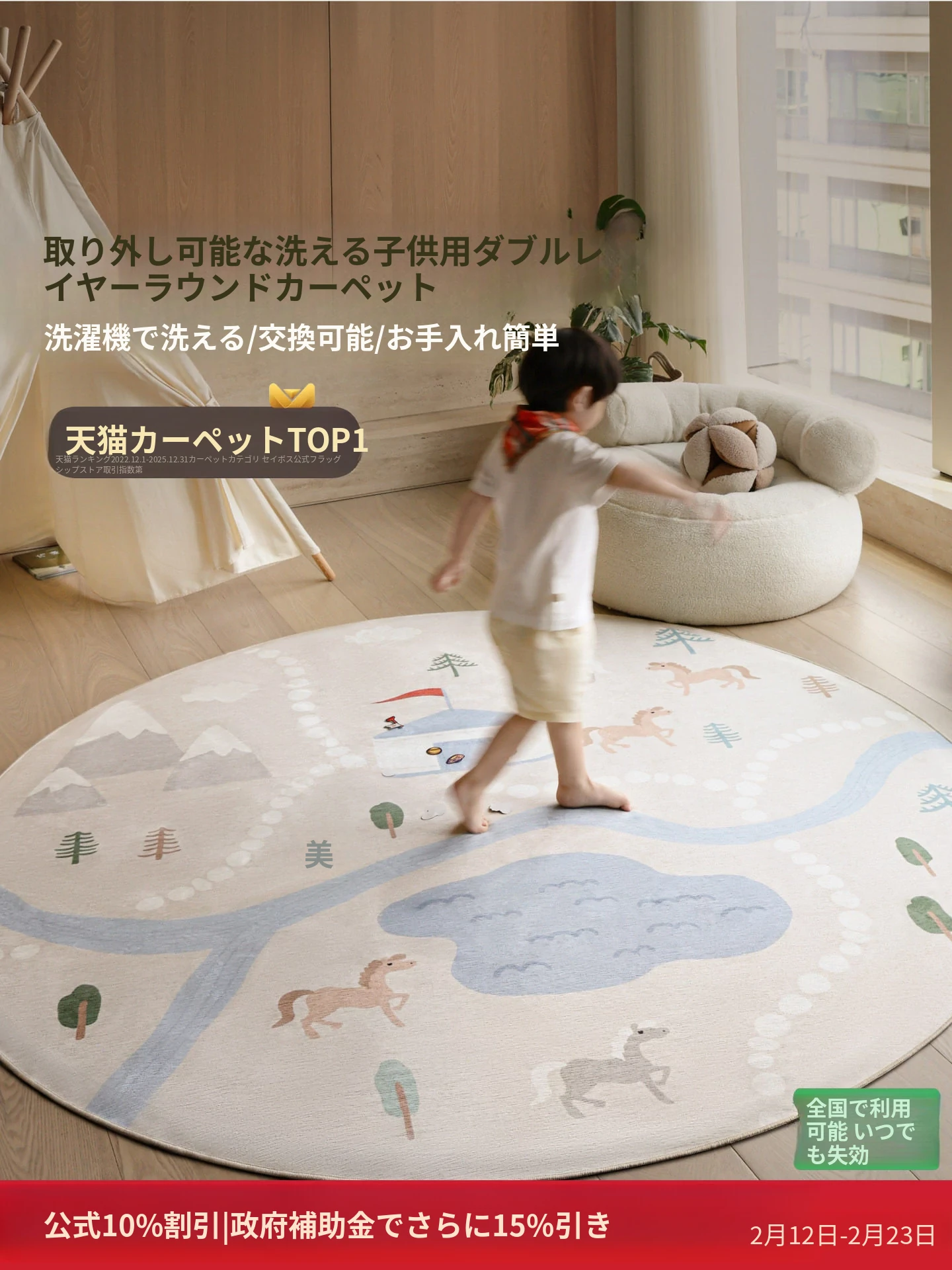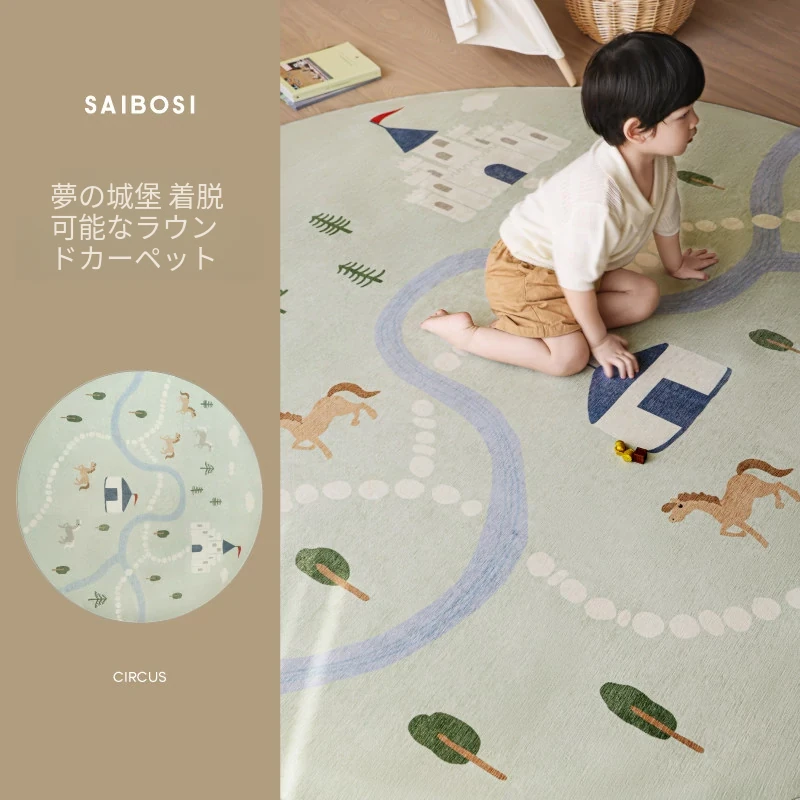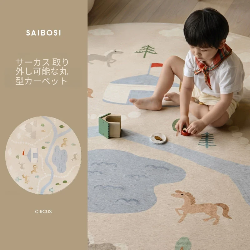 サイボスサーカスの洗える二重層ラグカーペット、子供部屋や寝室にぴったり!おしゃれで高級感溢れる円形マット、洗濯機で簡単お手入れ、赤ちゃんのハイハイにも最適です!