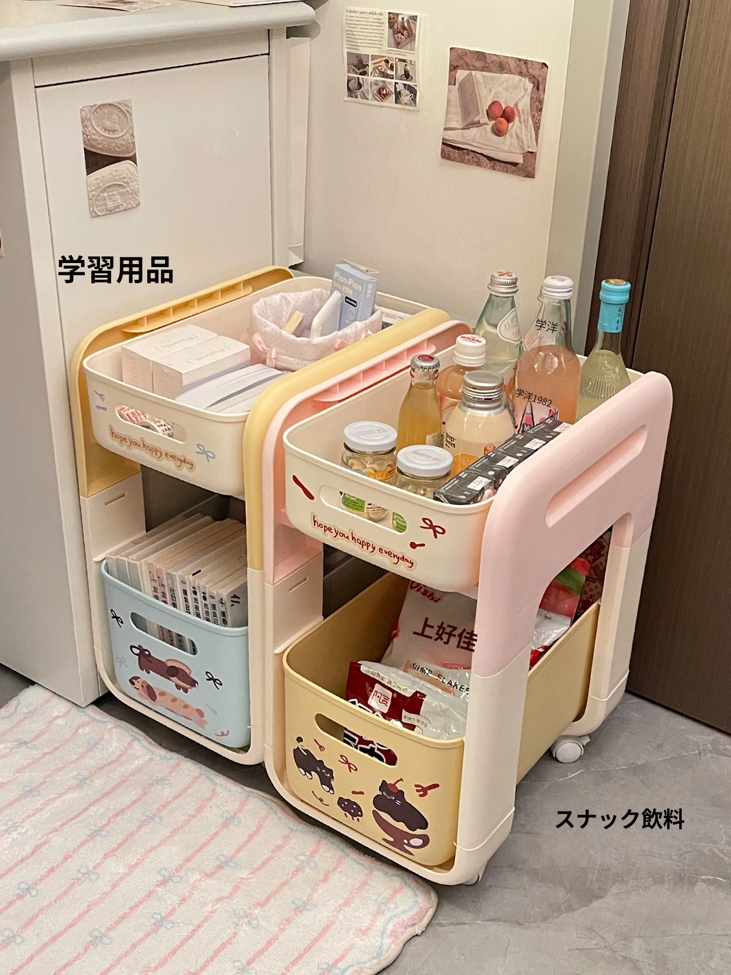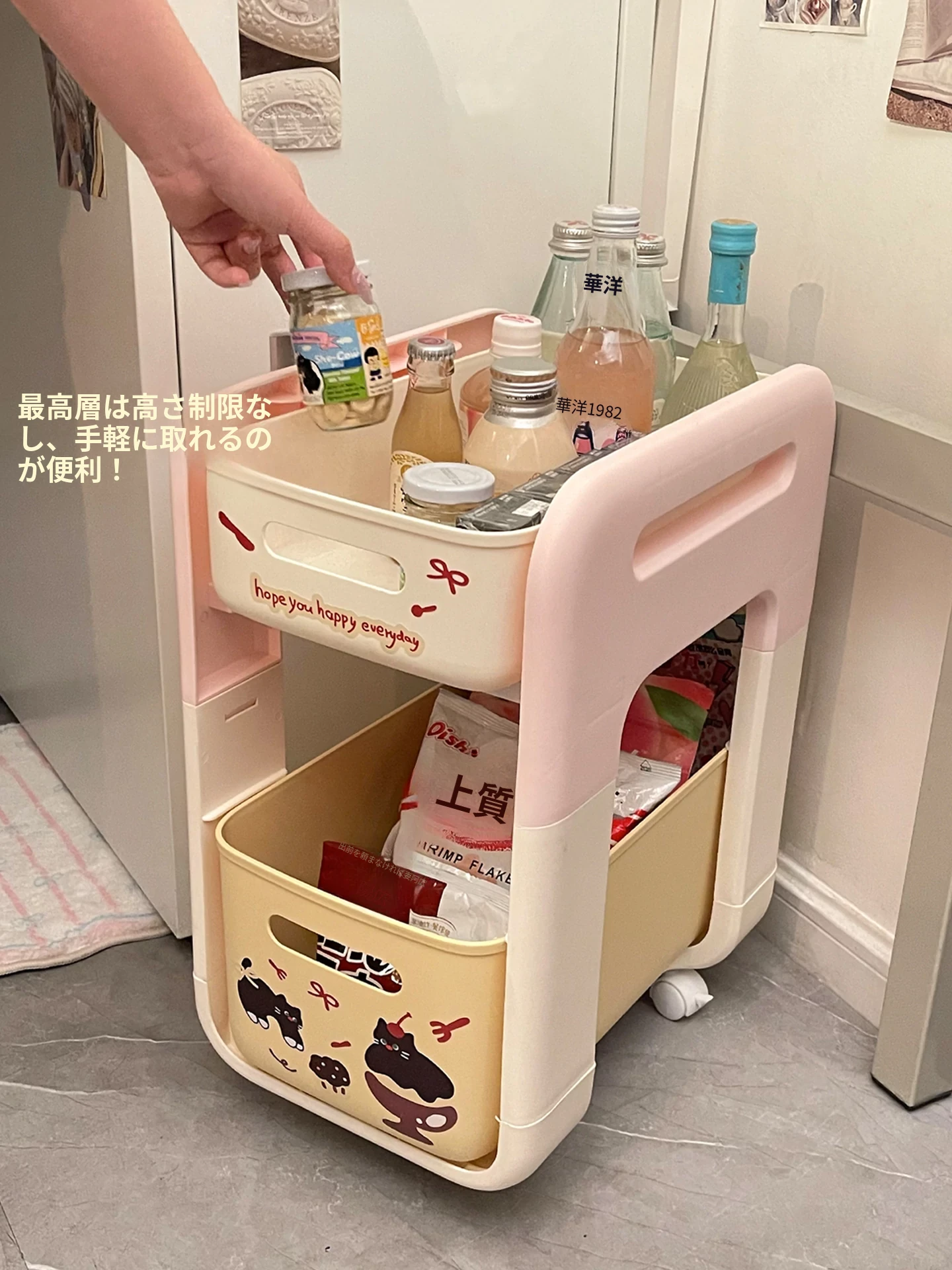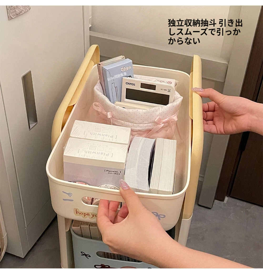 クリームピンク厚手-二重キャスター付き【スムーズな引き出し/安定して揺れない】ステッカー付き