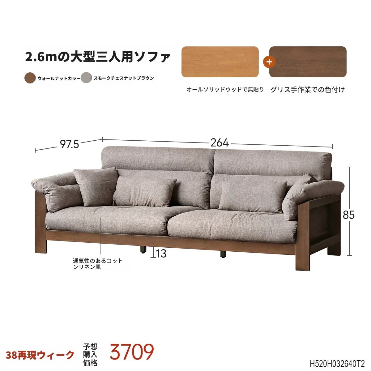 (ウォールナットカラー)2.64m大型三人掛けソファ【スモークチェスナットブラウン】(2640*975*850MM)