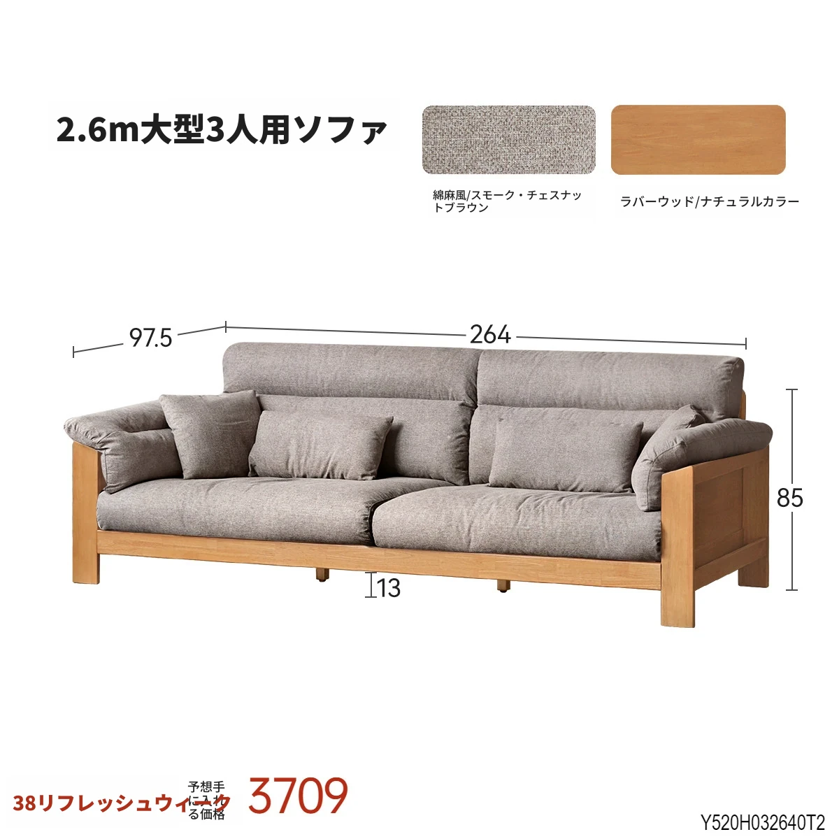 (ナチュラルカラー)2.64m大型三人掛けソファ【スモークチェスナットブラウン】(2640*975*850MM)