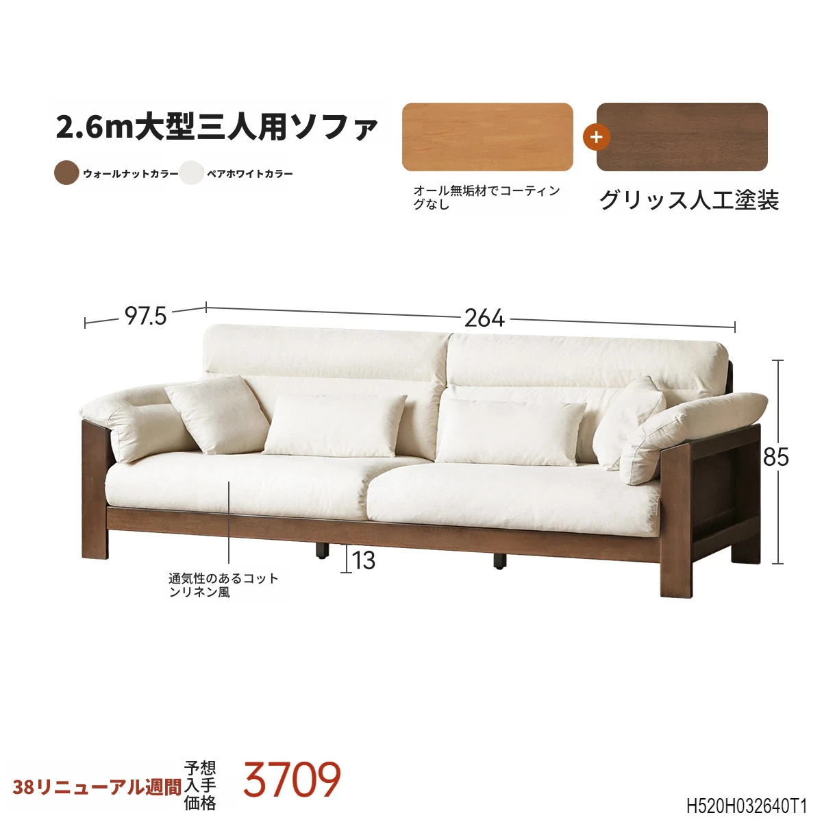 (ウォールナットカラー)2.64m大型三人掛けソファ【ペアホワイト】(2640*975*850MM)