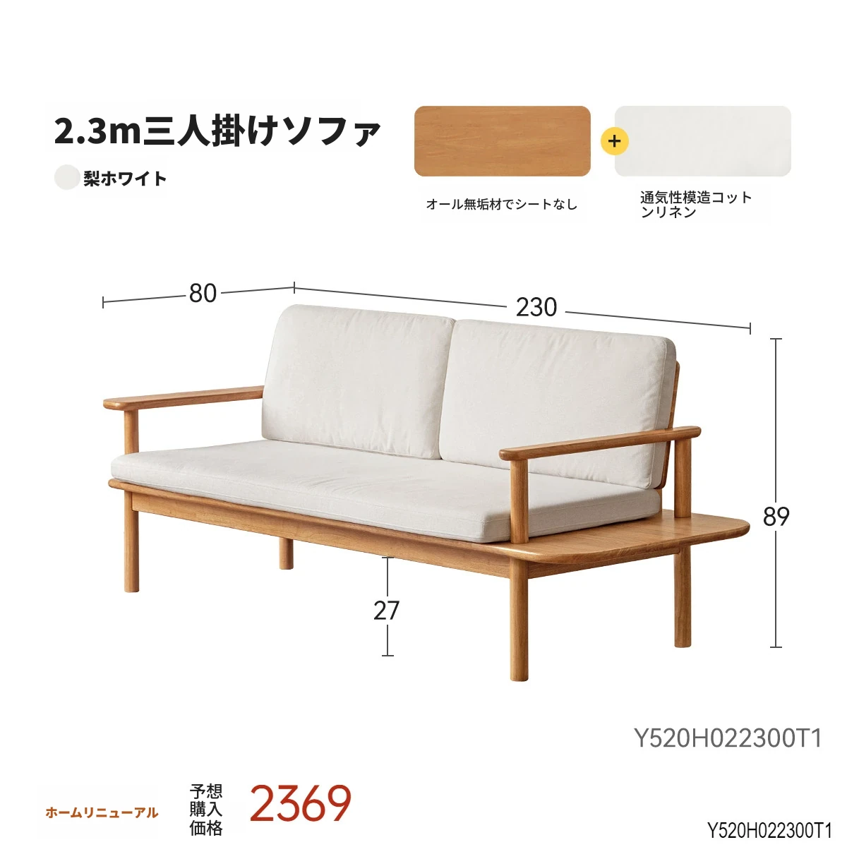 2.3m 三人掛けソファ【梨白】(2300*800*829MM)