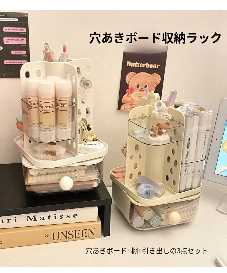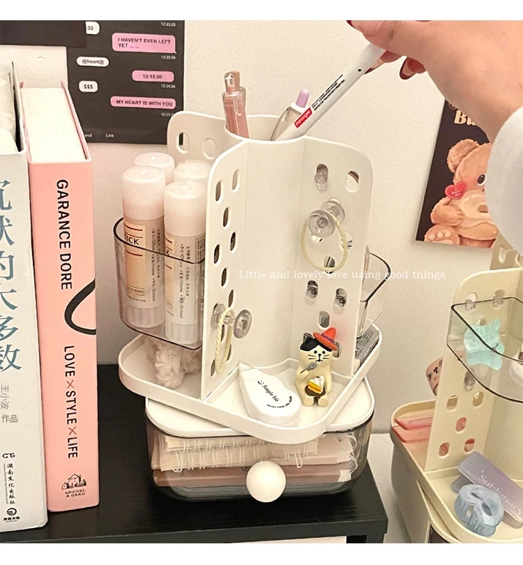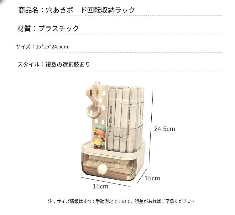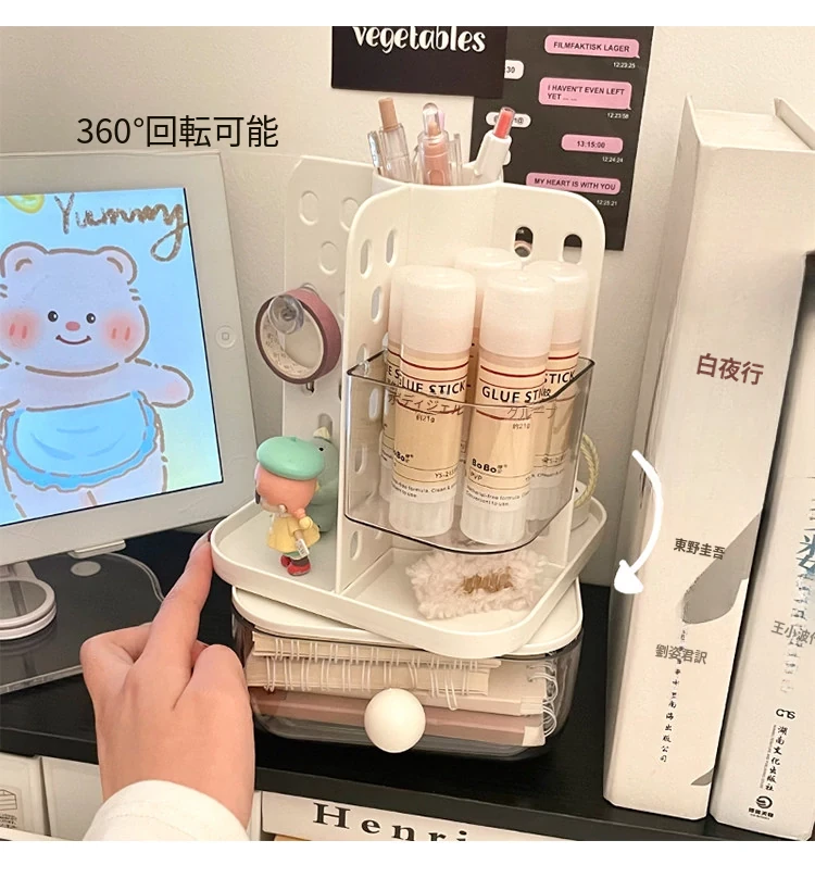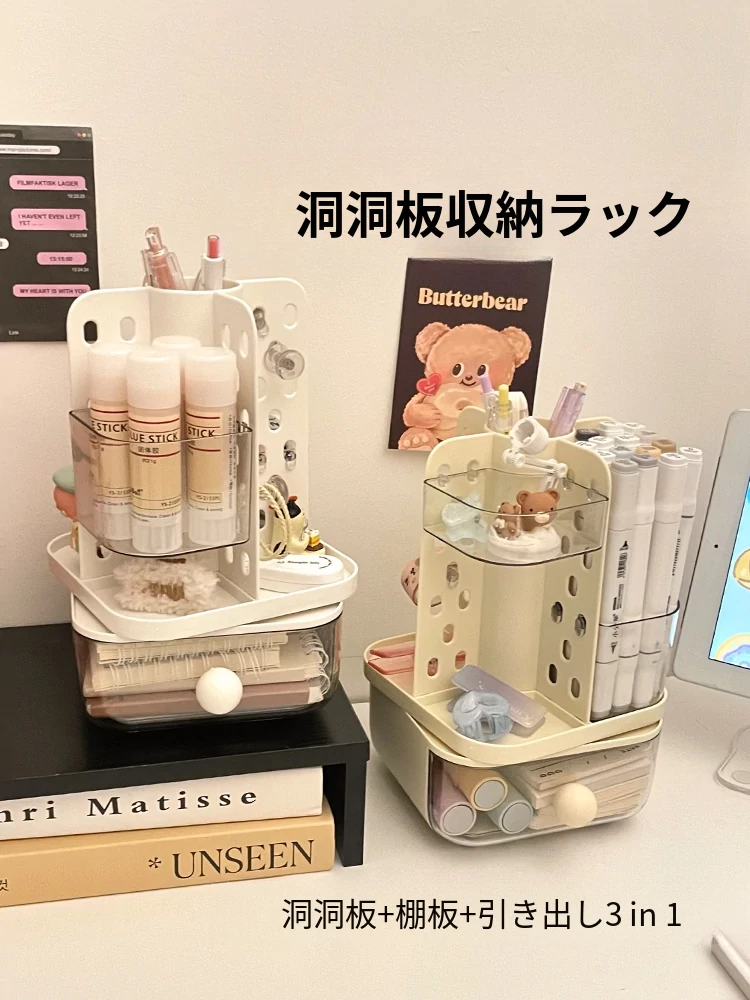 インスタ風デスク用回転収納ボックス - おしゃれな穴あきボード付き、文房具や雑貨をスッキリ整理!学生寮や書斎に最適な便利アイテム!