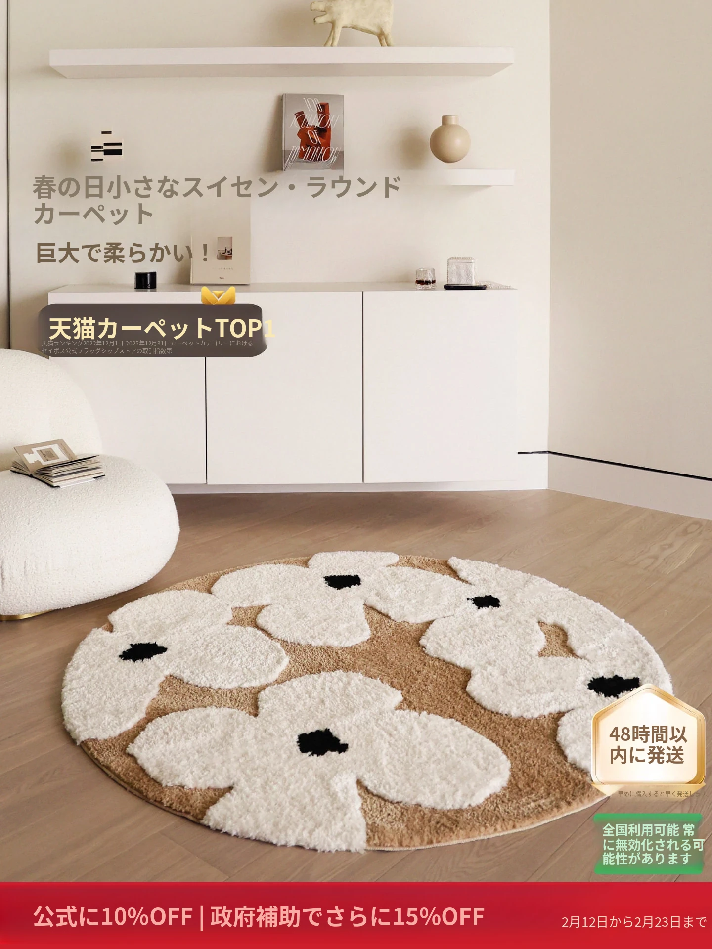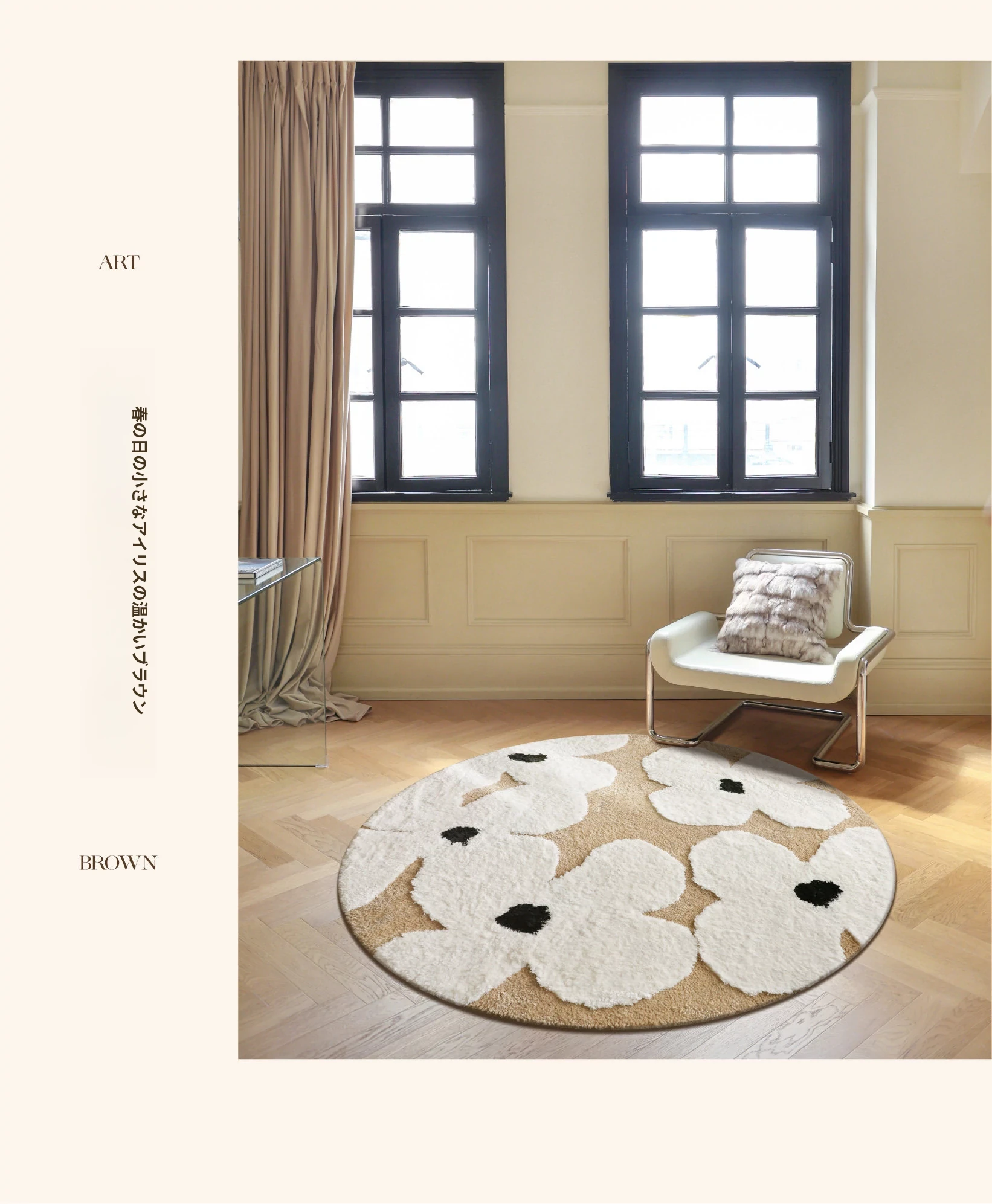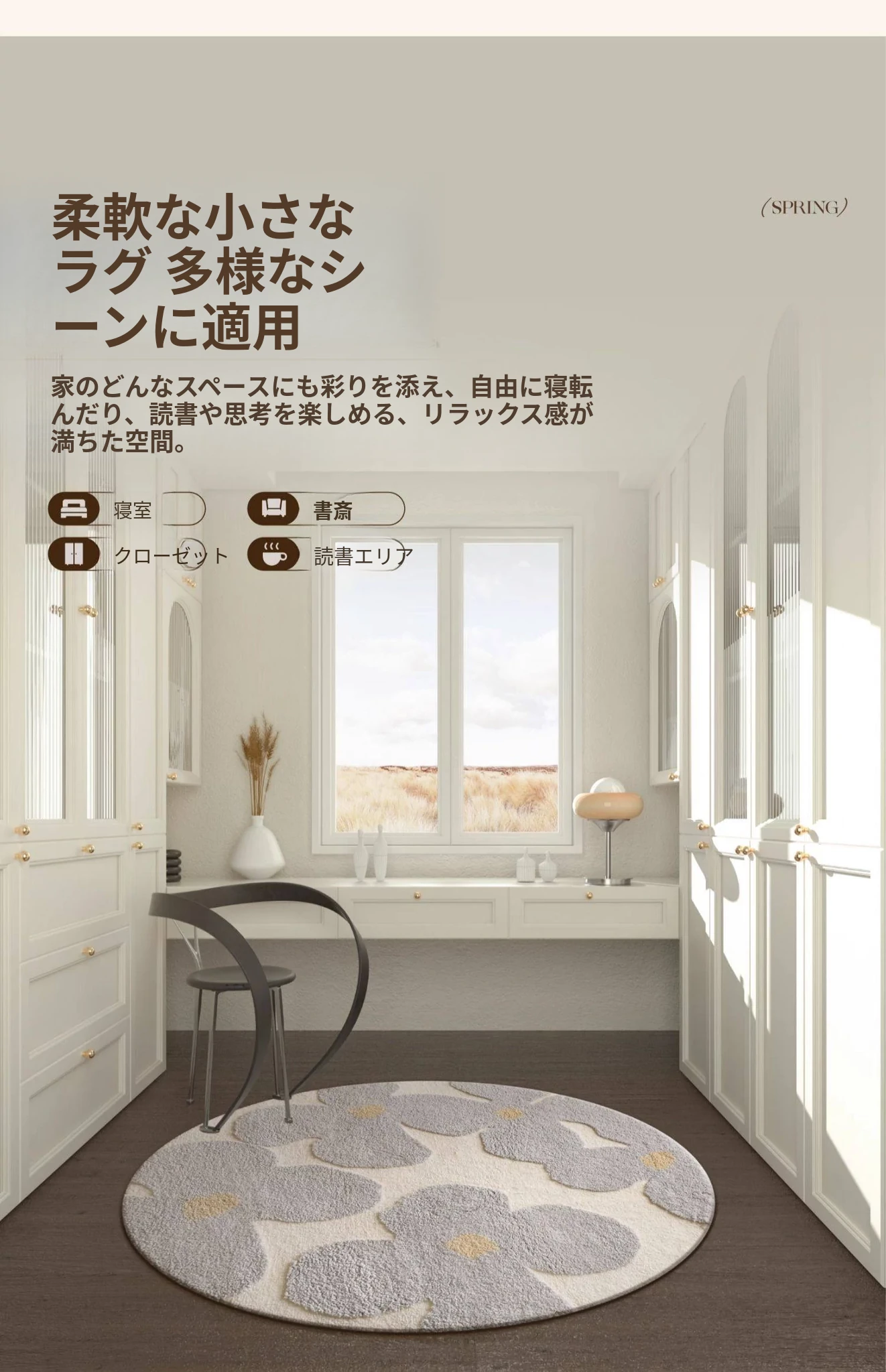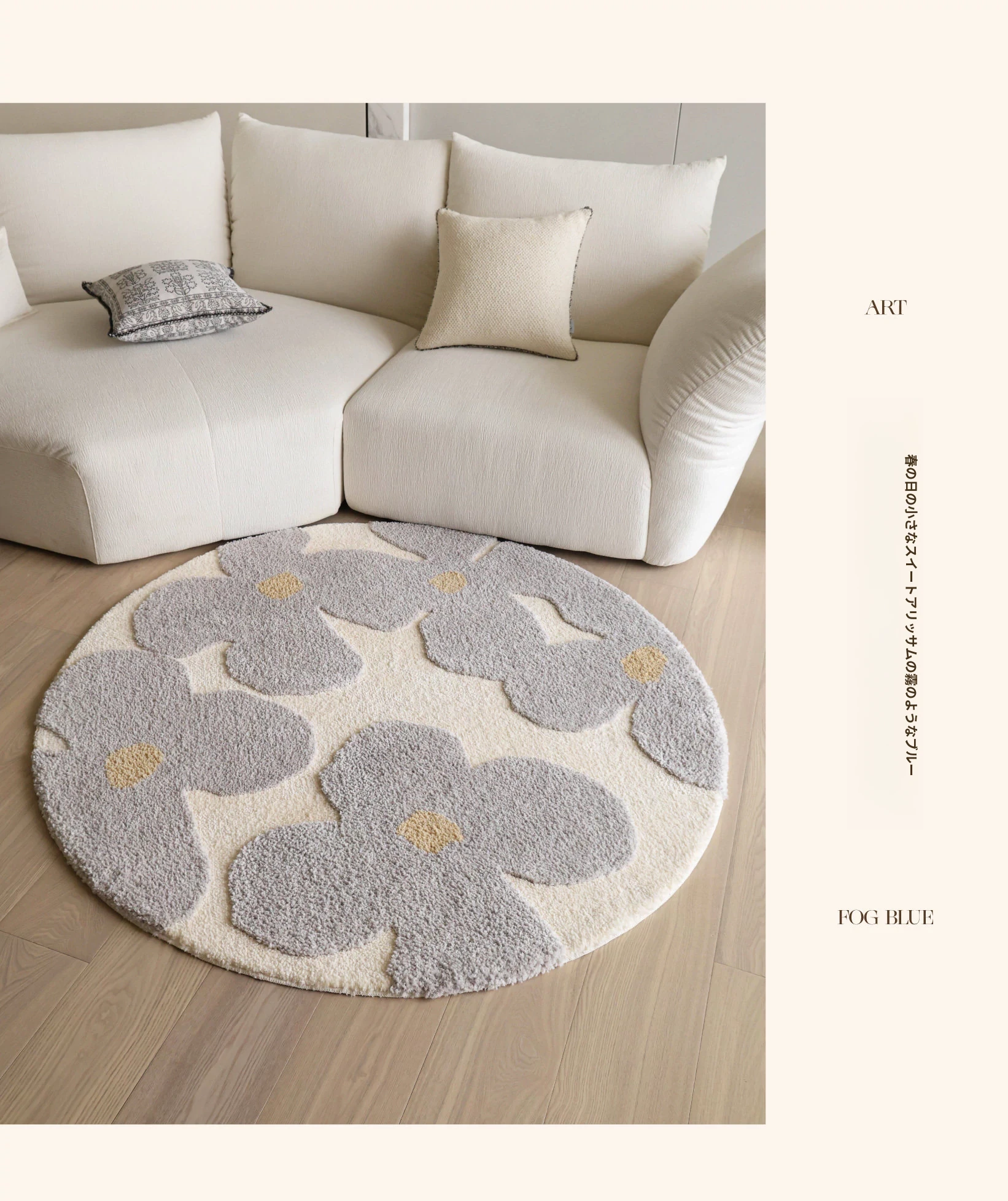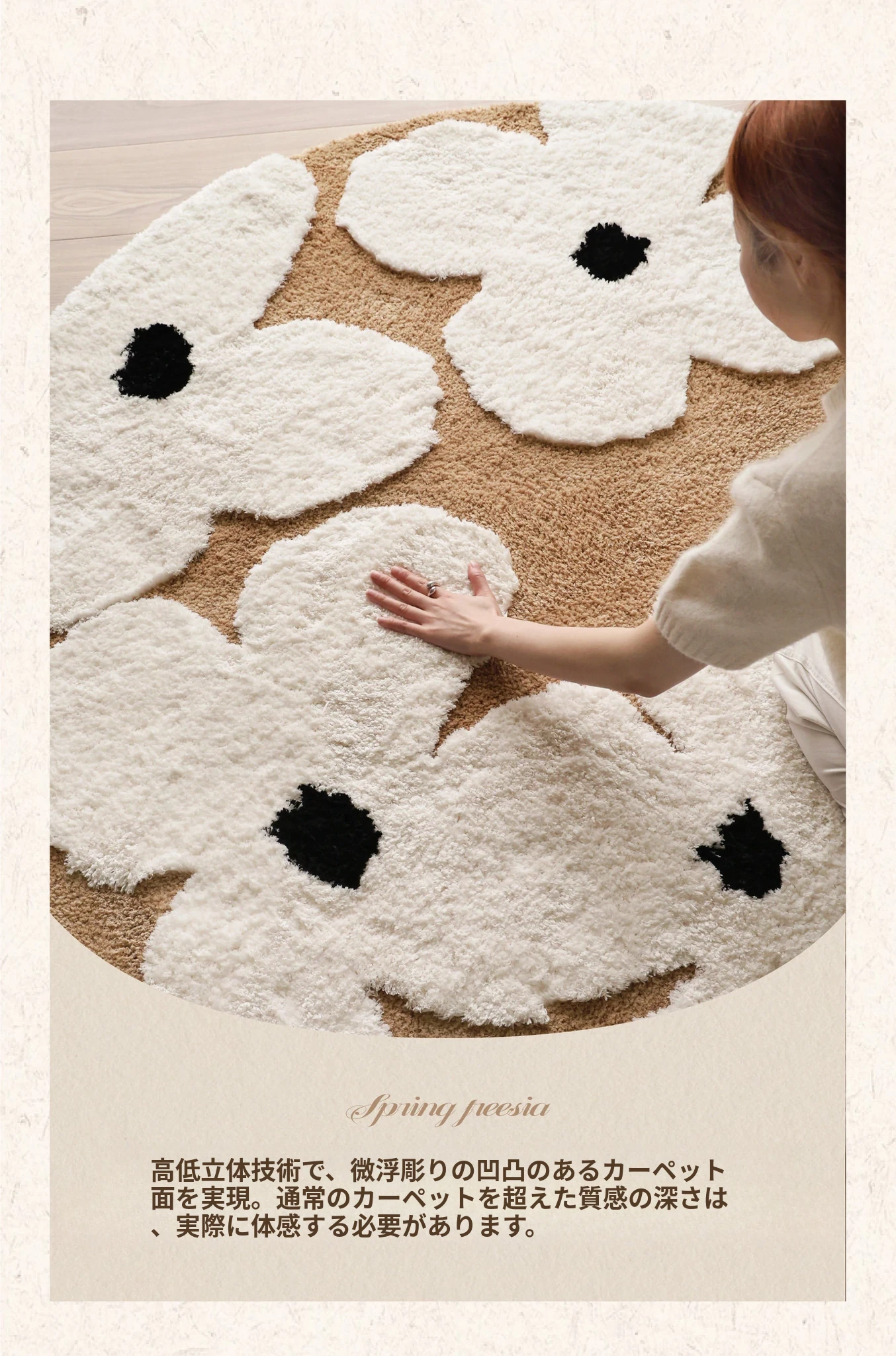 セイボス・スイートアフリカン・カーペットラウンド・フレンチスタイルの高級クリームソフト・ベッドルーム・リビングルーム・クローゼットにぴったりの青山美宿!心地よい柔らかさで、あなたの空間を華やかに演出します!