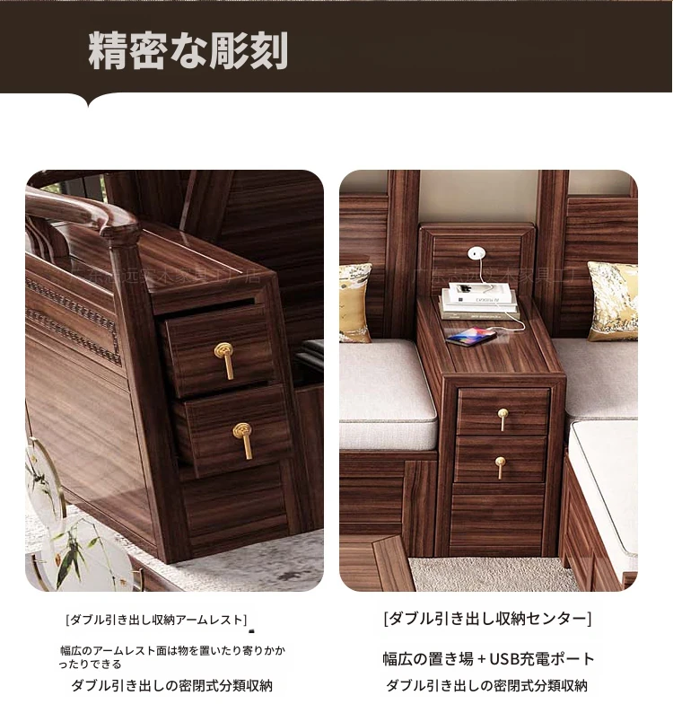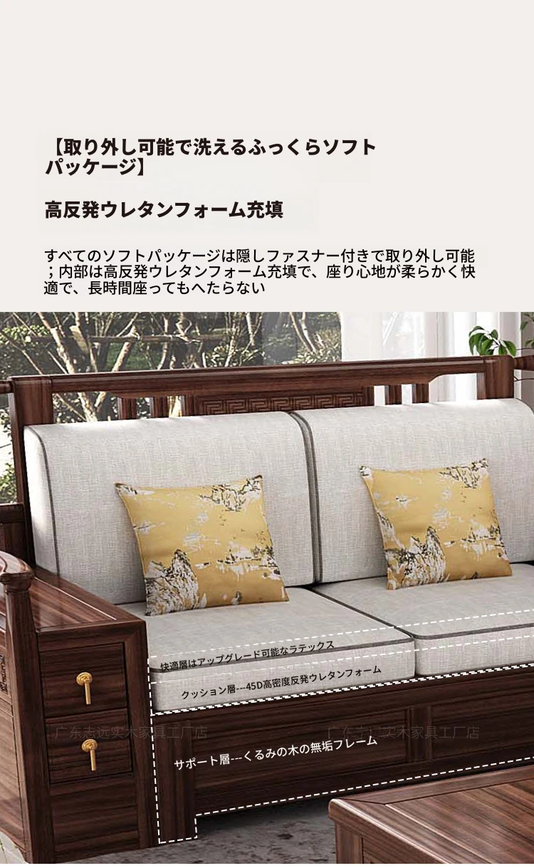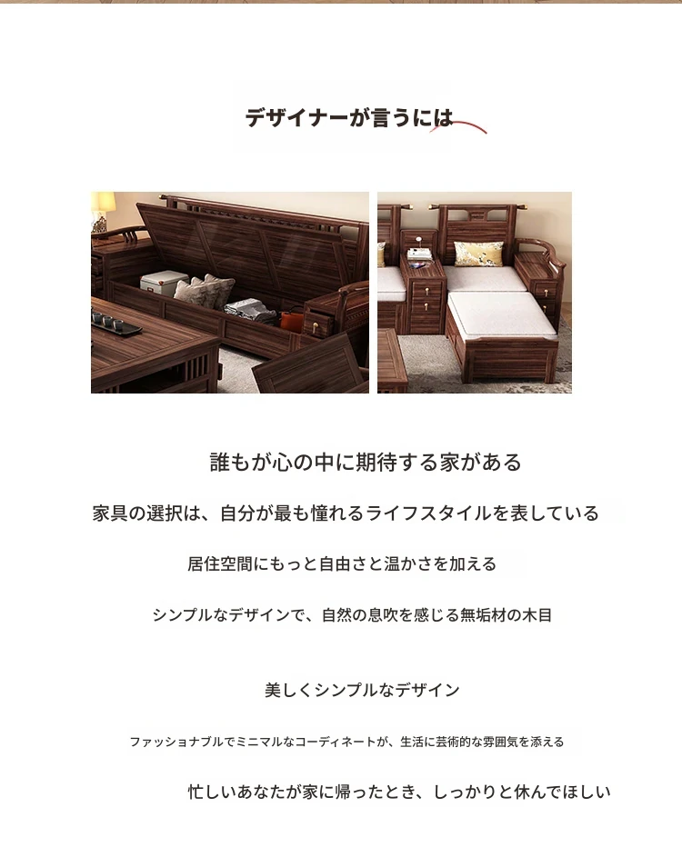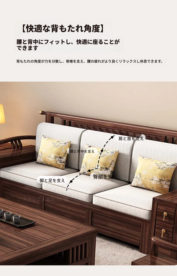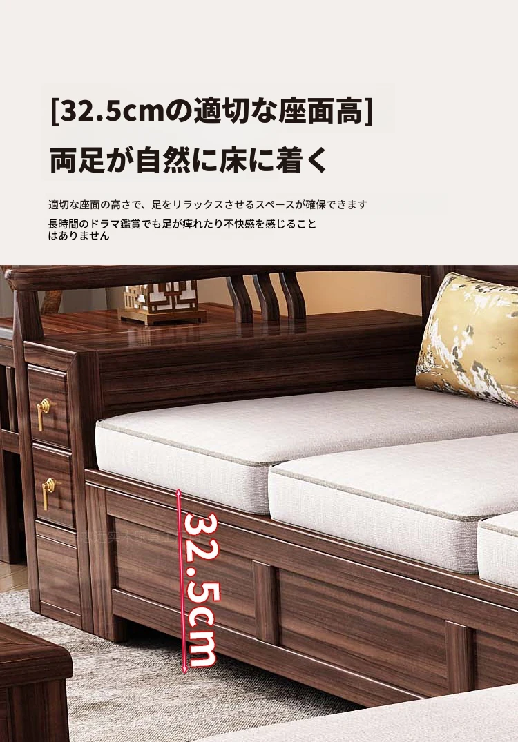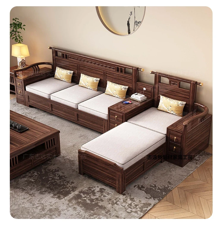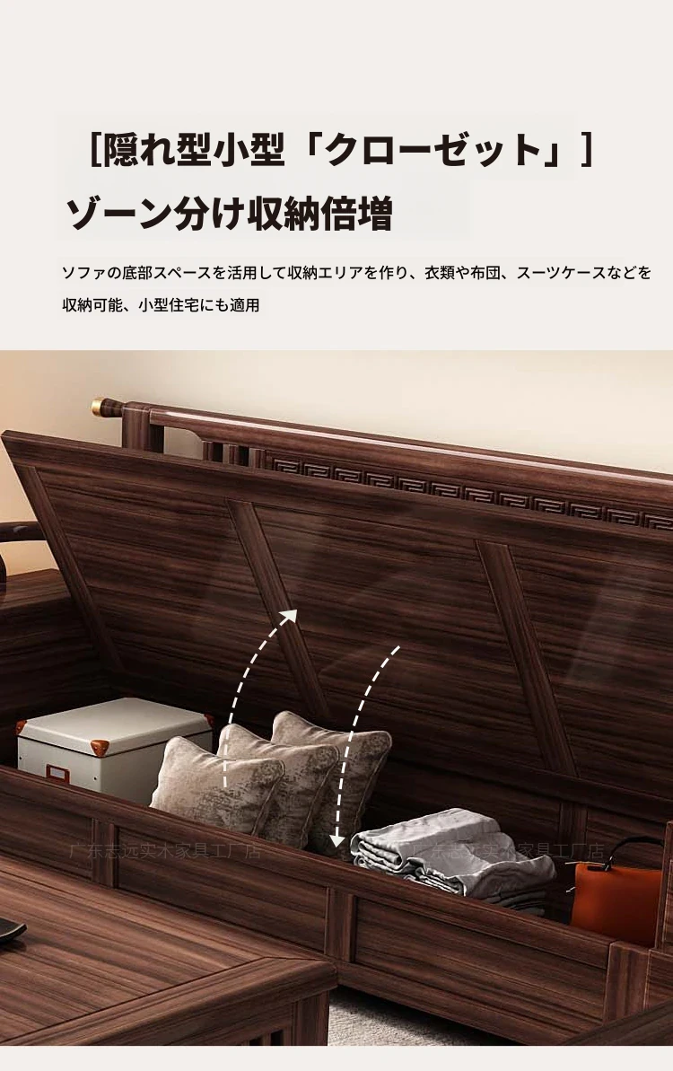 新中式天然木製黒胡桃コーナーソファー、収納付きのモダンシンプルデザイン!小さな部屋にもぴったりなコンパクトサイズで、心地よいリビング空間を演出します。