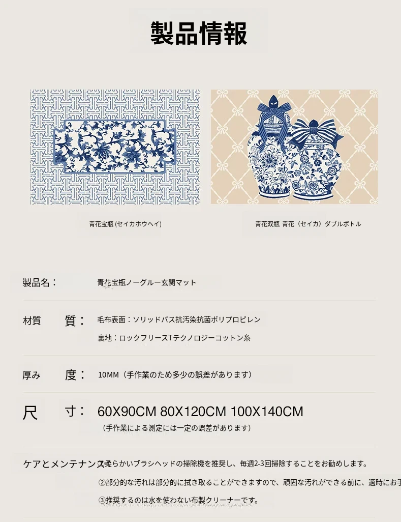 セイボス・オリエンタル青花瓶|高級感あふれる無接着剤の玄関マット、平安をもたらす入室用カーペット。おしゃれで快適な足元を演出!