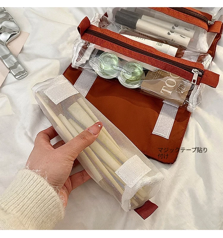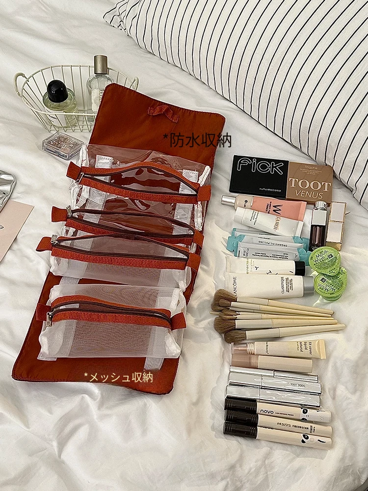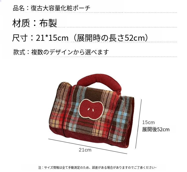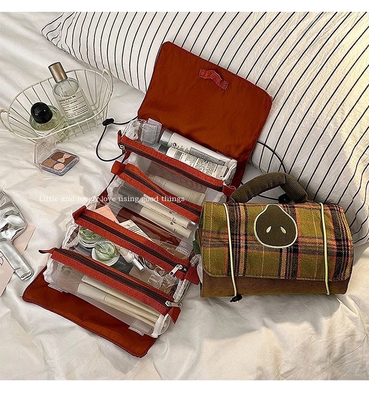 チェック柄メイクポーチ - 旅行や出張に最適な便利な分区収納バッグ!折りたたみ可能で、スキンケア用品や洗面用具をしっかり整理できる、持ち運びに便利なアイテムです。