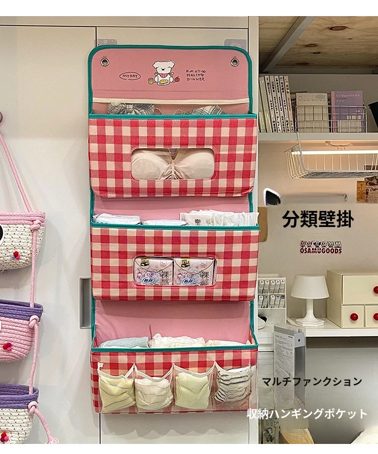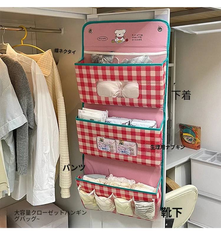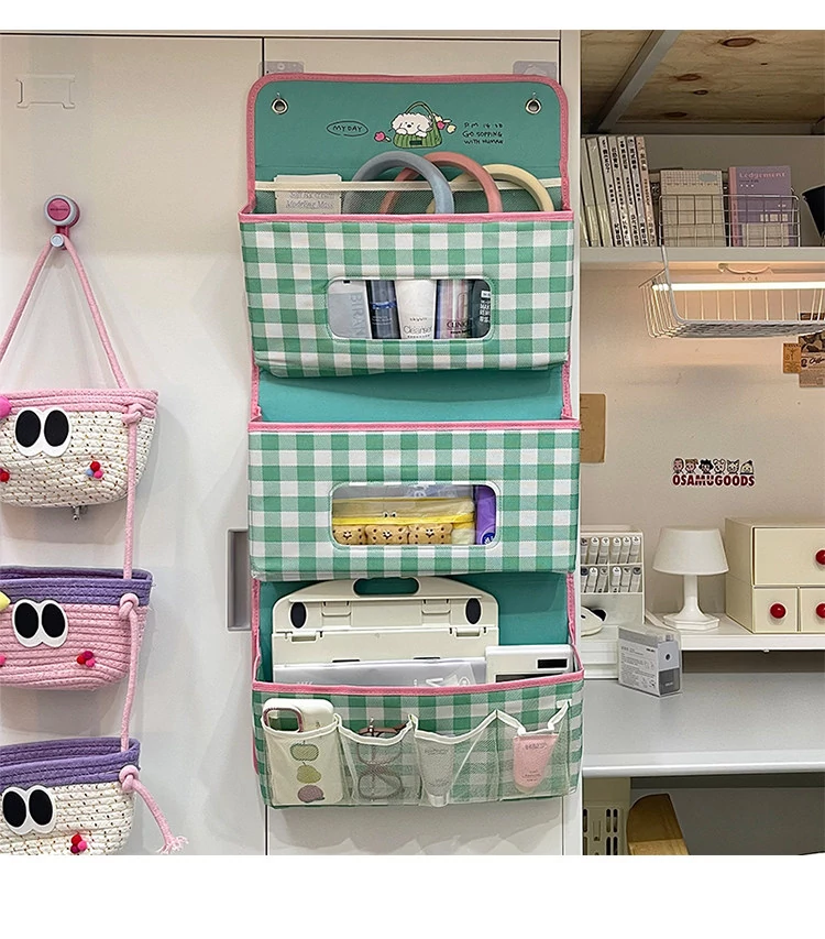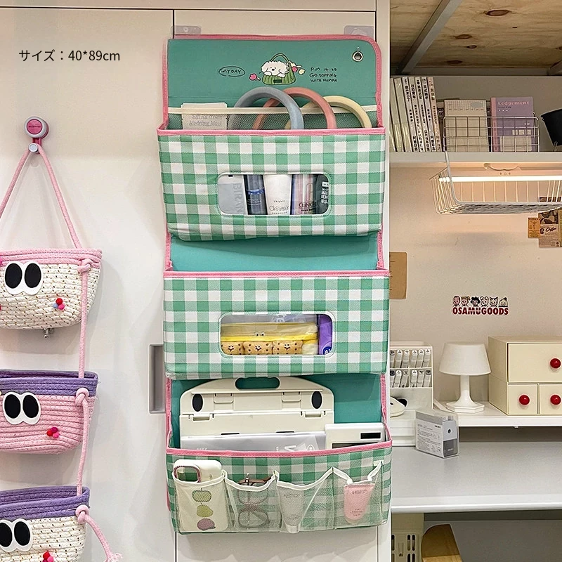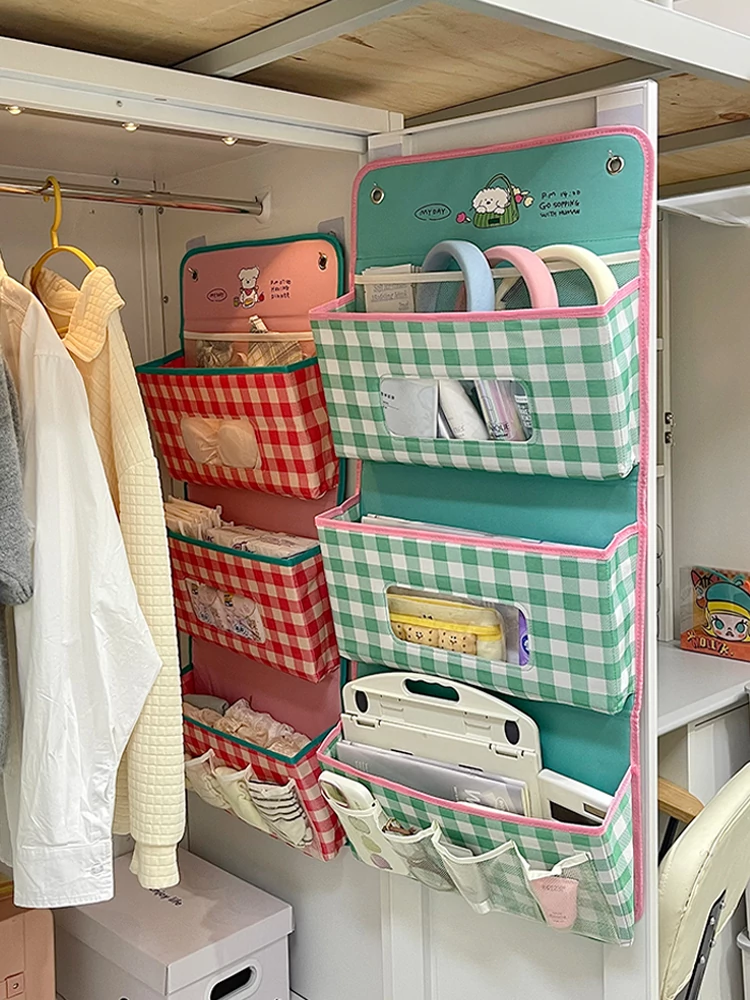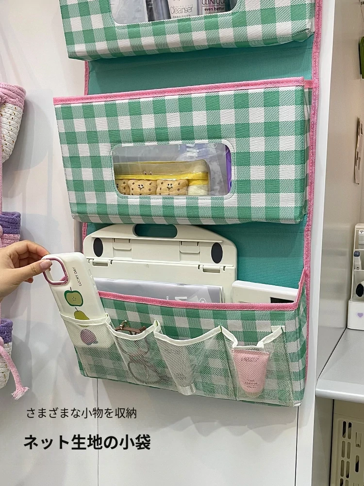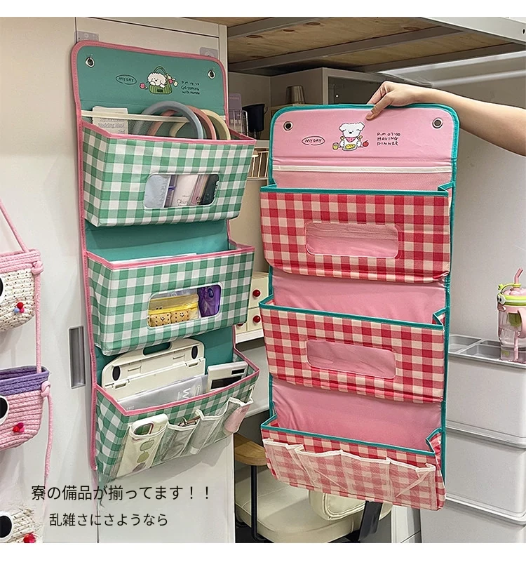 チェック柄収納ハンギングバッグ 学生寮用ベッド上置き物袋 上下段用 ドア裏に掛けられる壁掛け式 ベッドサイドネットポケットでおしゃれに整理整頓!