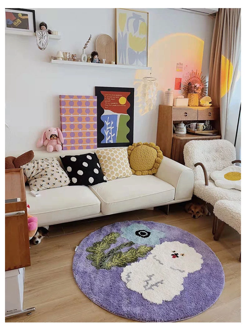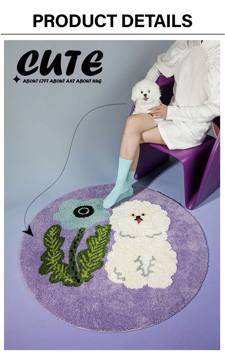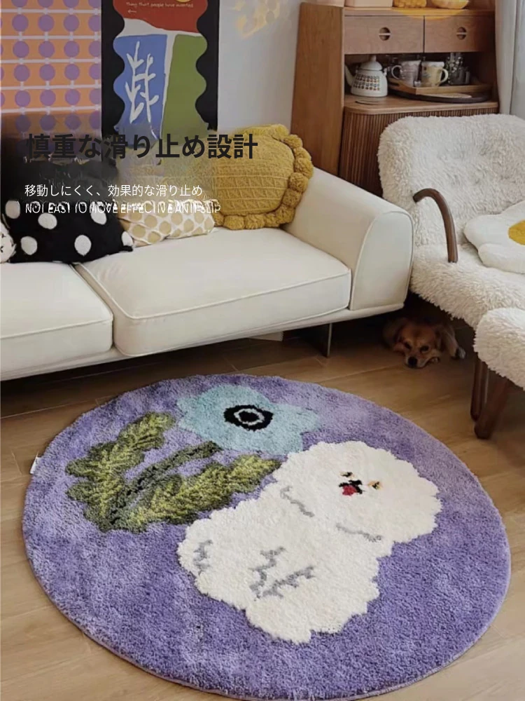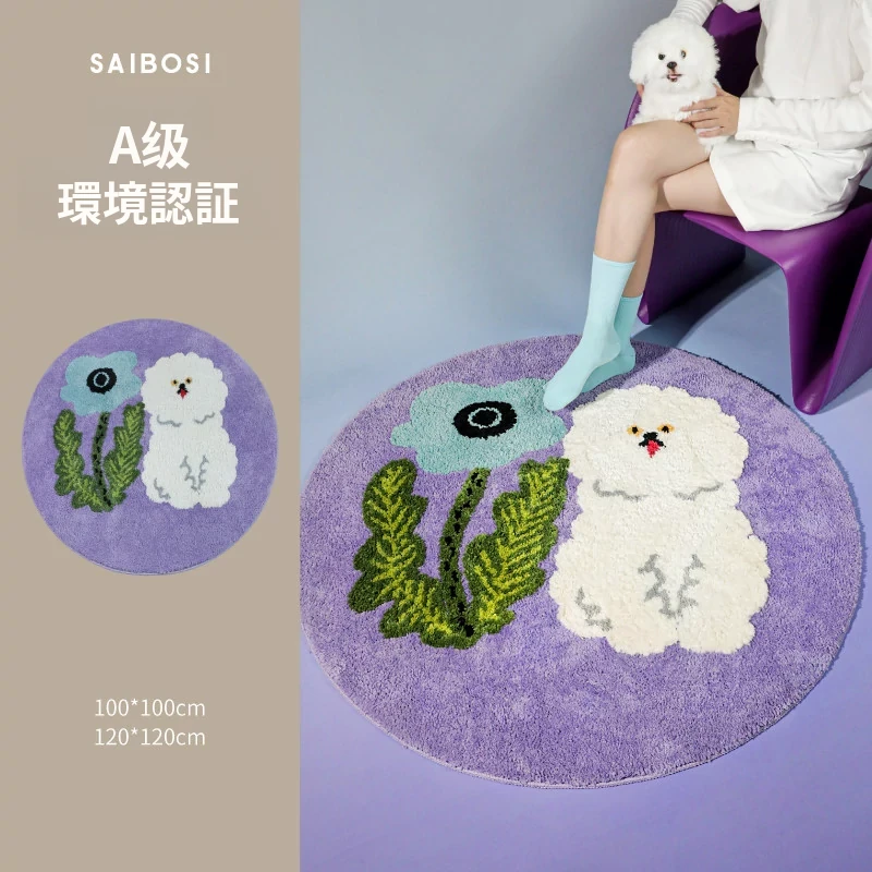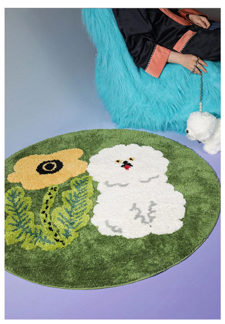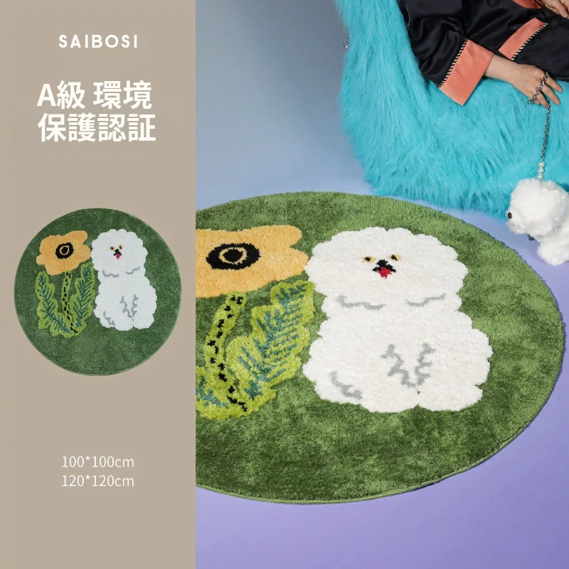 サイボスX東京アーティストデザインの可愛いビションフリーゼ型ラウンドカーペット - 子供部屋やリビングにぴったり!猫と一緒にくつろげる素敵なベッドサイドマット。