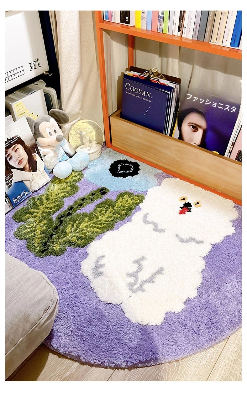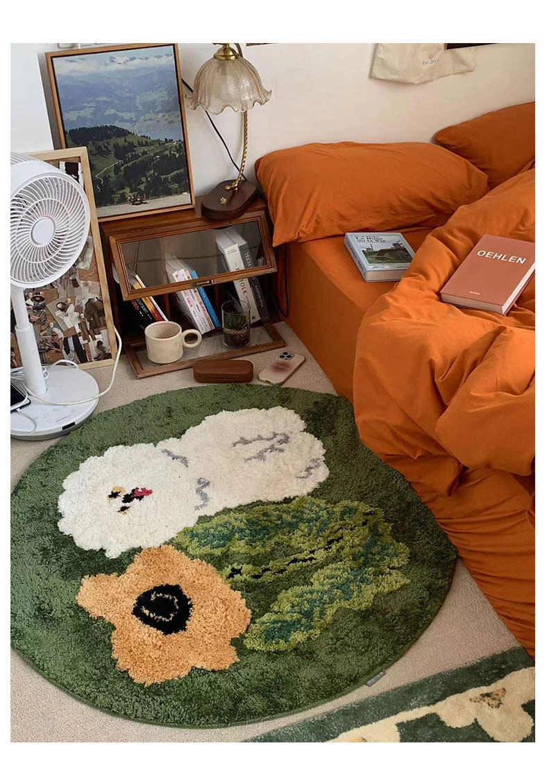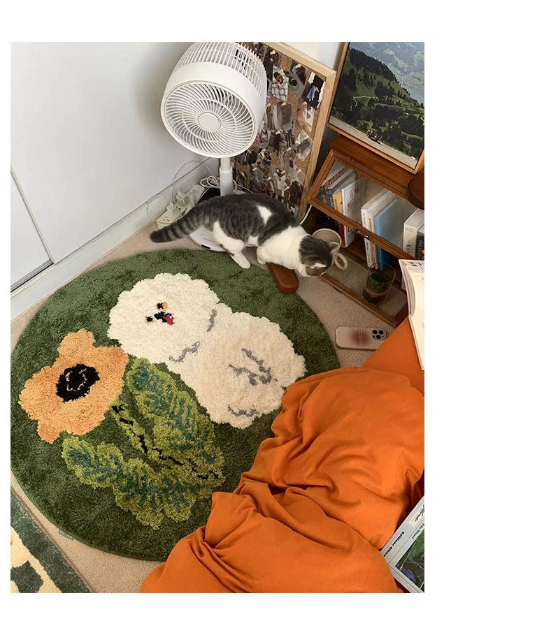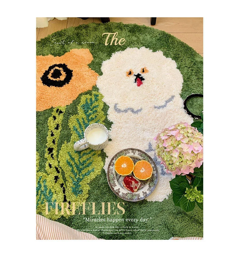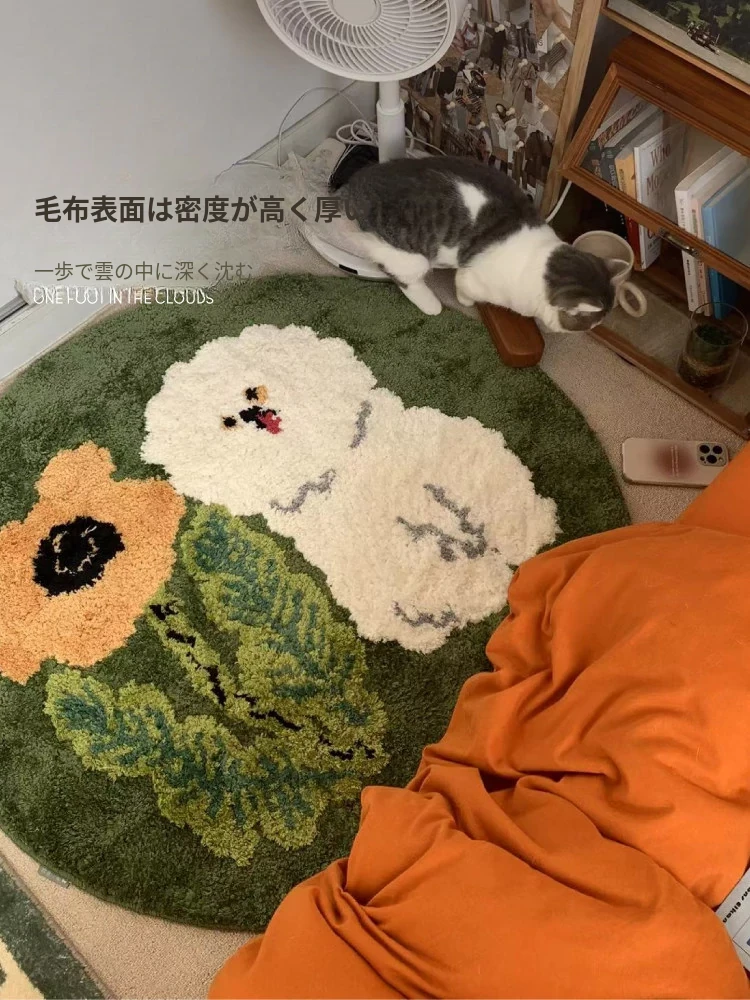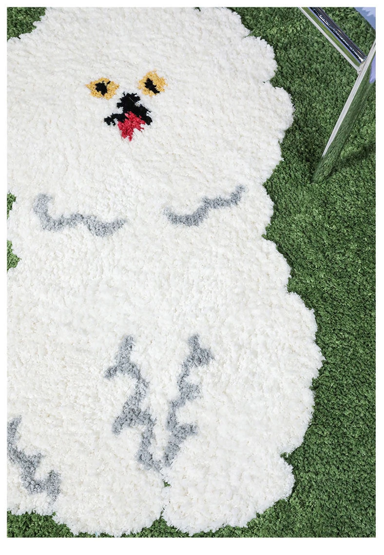 サイボスX東京アーティストデザインの可愛いビションフリーゼ型ラウンドカーペット - 子供部屋やリビングにぴったり!猫と一緒にくつろげる素敵なベッドサイドマット。