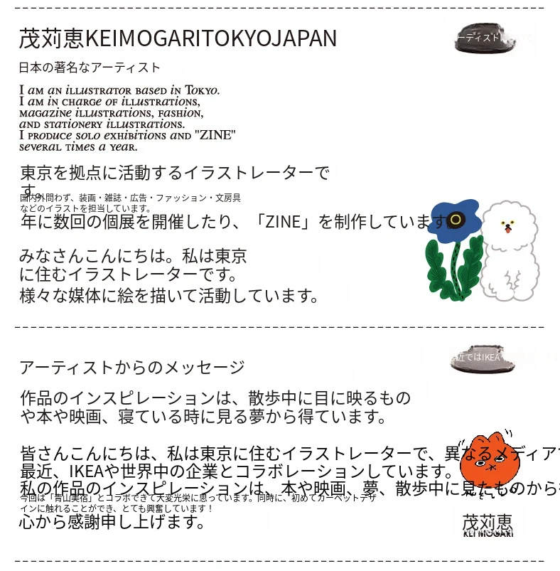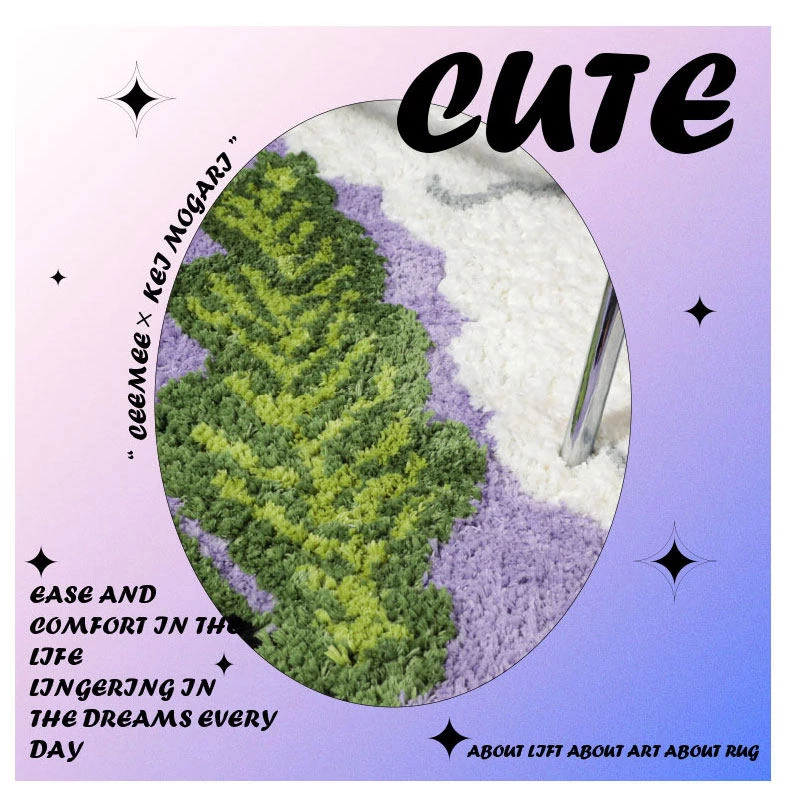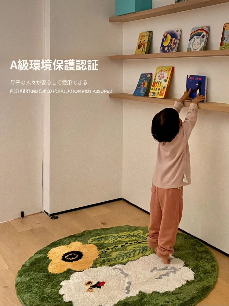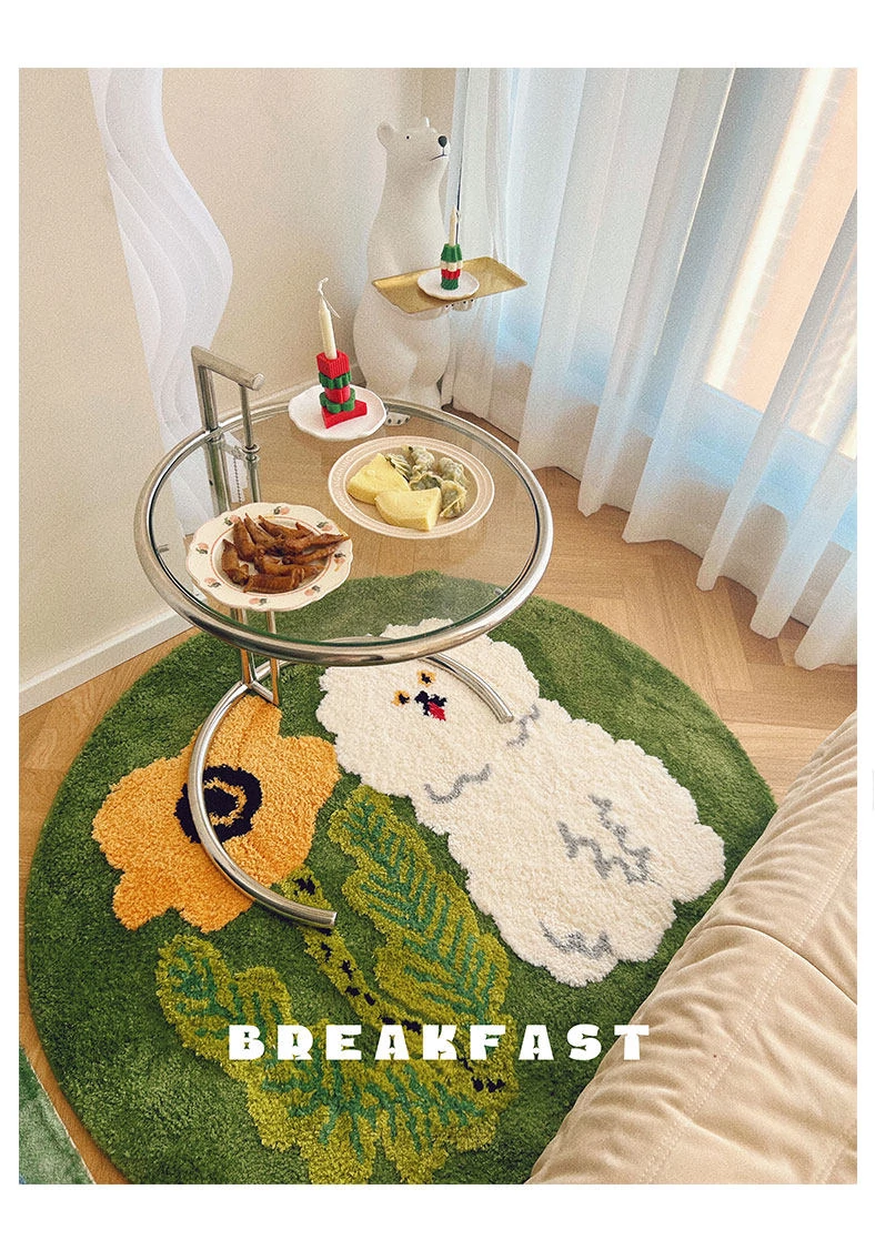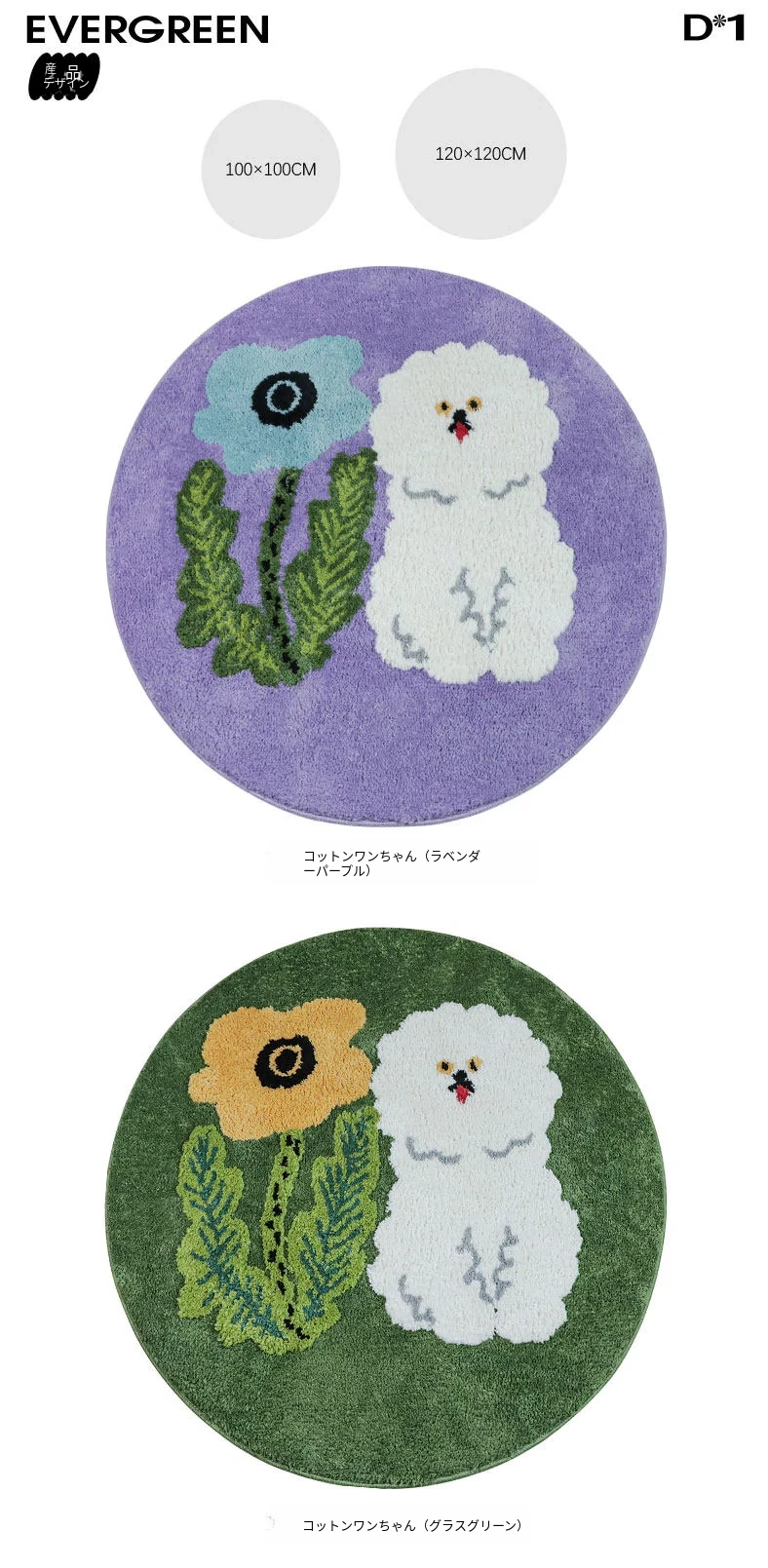 サイボスX東京アーティストデザインの可愛いビションフリーゼ型ラウンドカーペット - 子供部屋やリビングにぴったり!猫と一緒にくつろげる素敵なベッドサイドマット。
