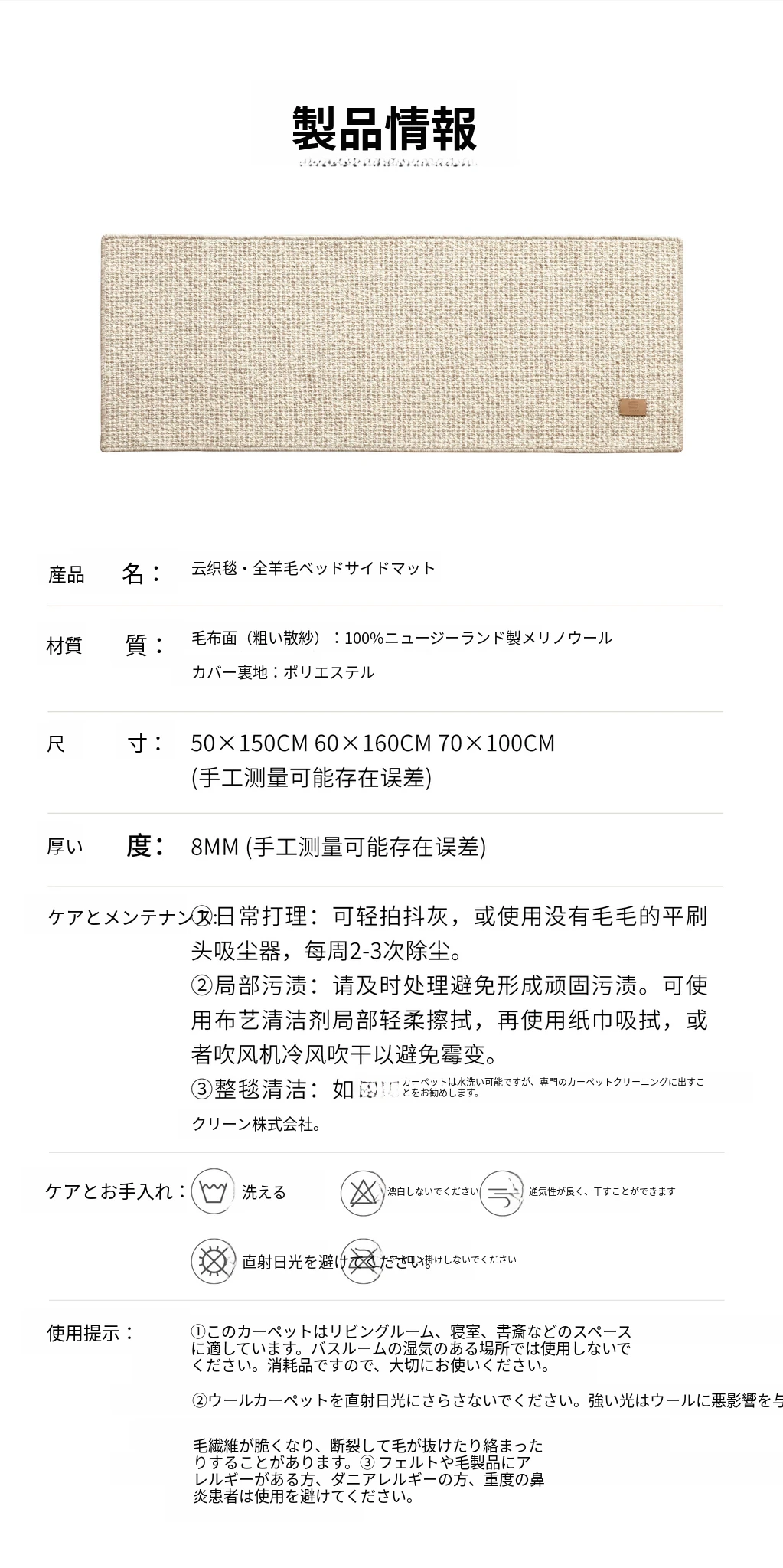 云織りカーペット ベッドサイドマット (輸入全羊毛)