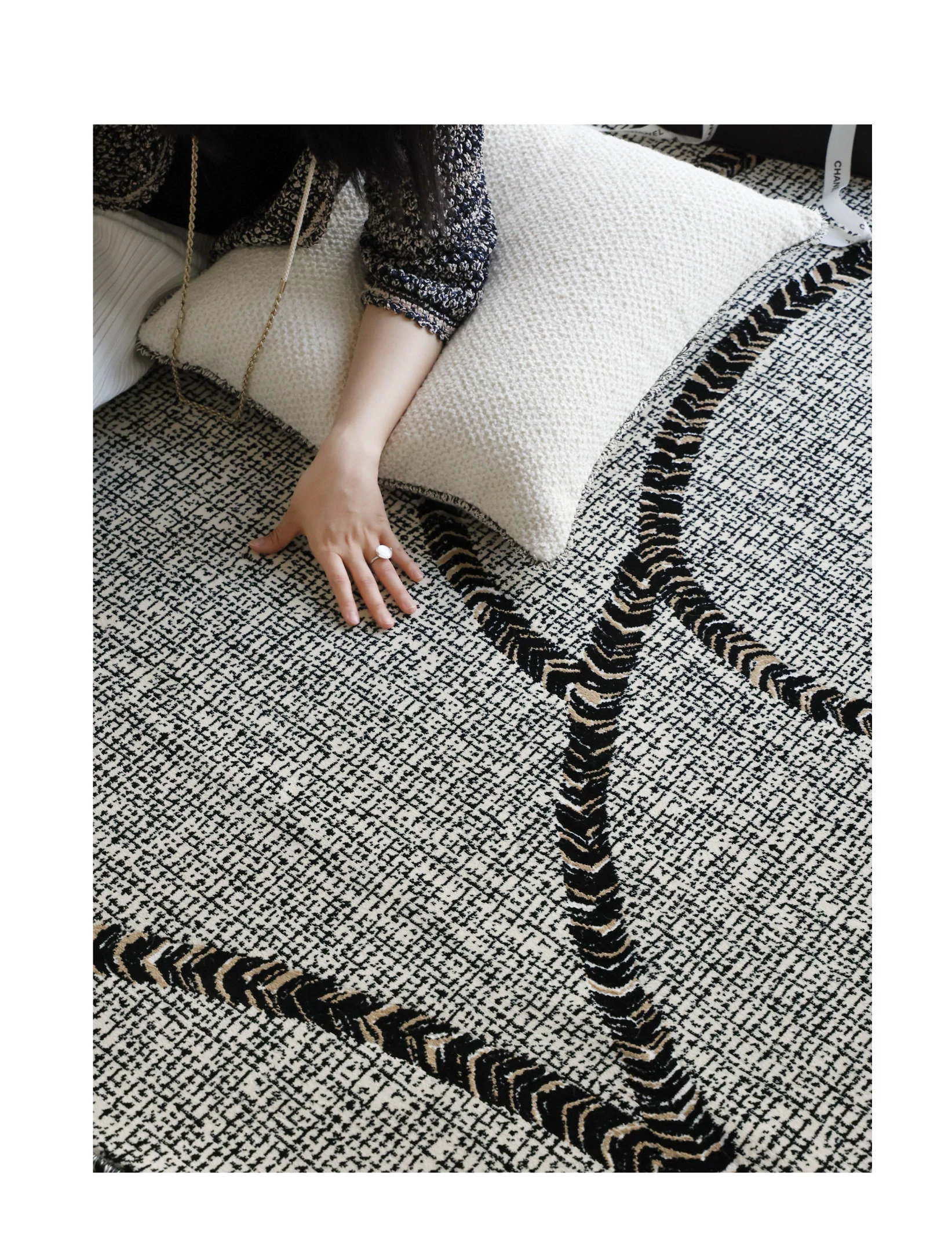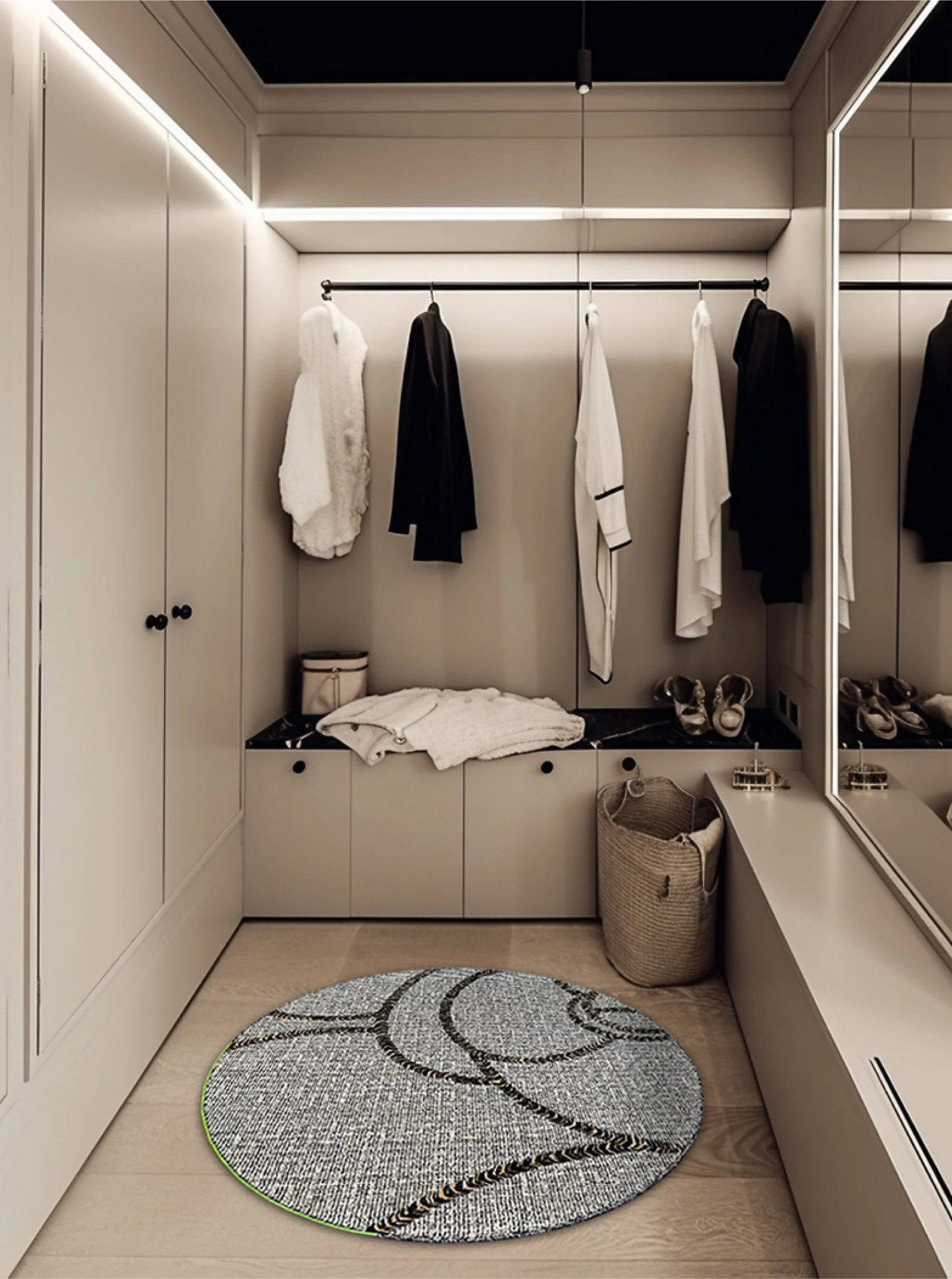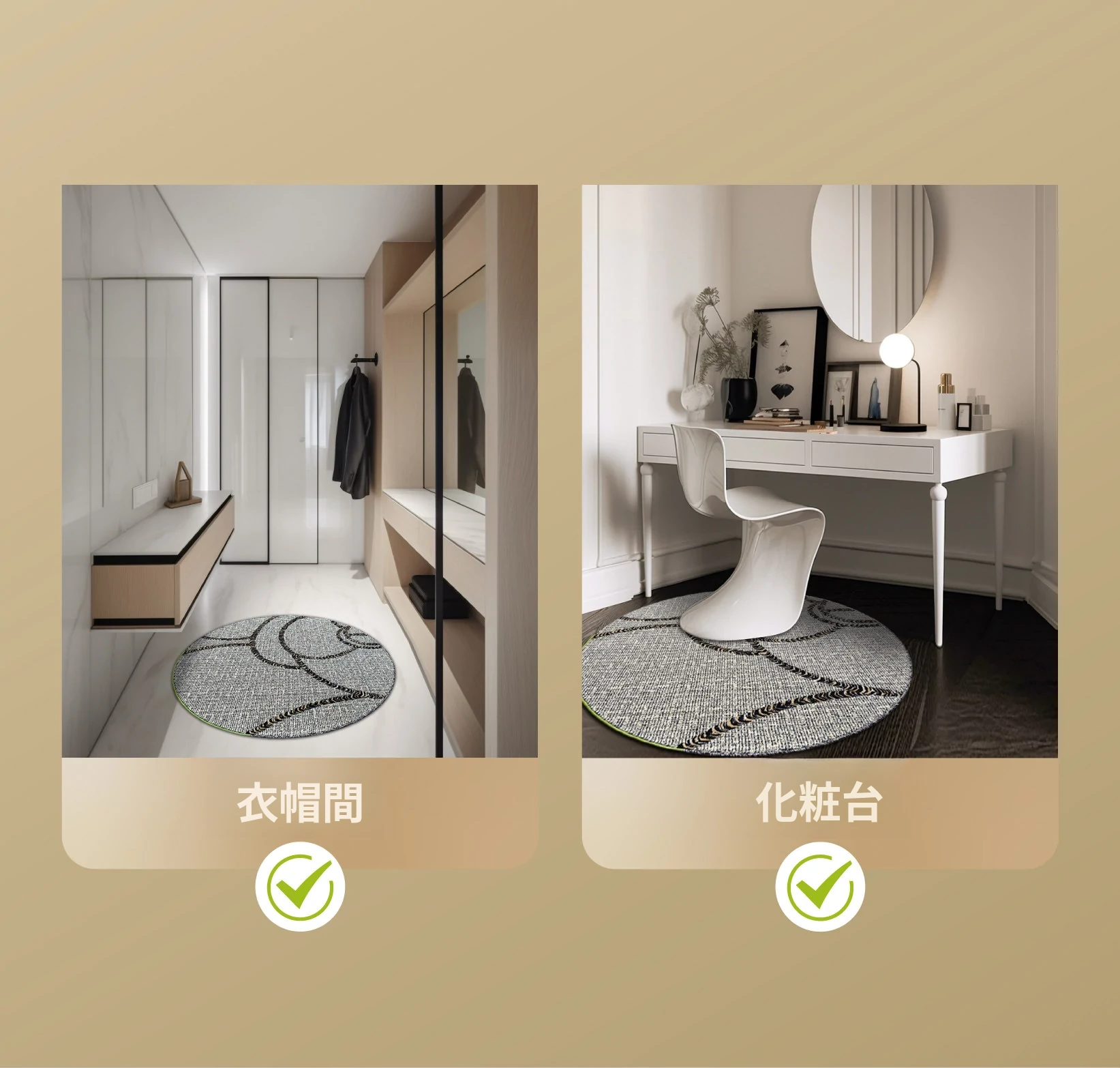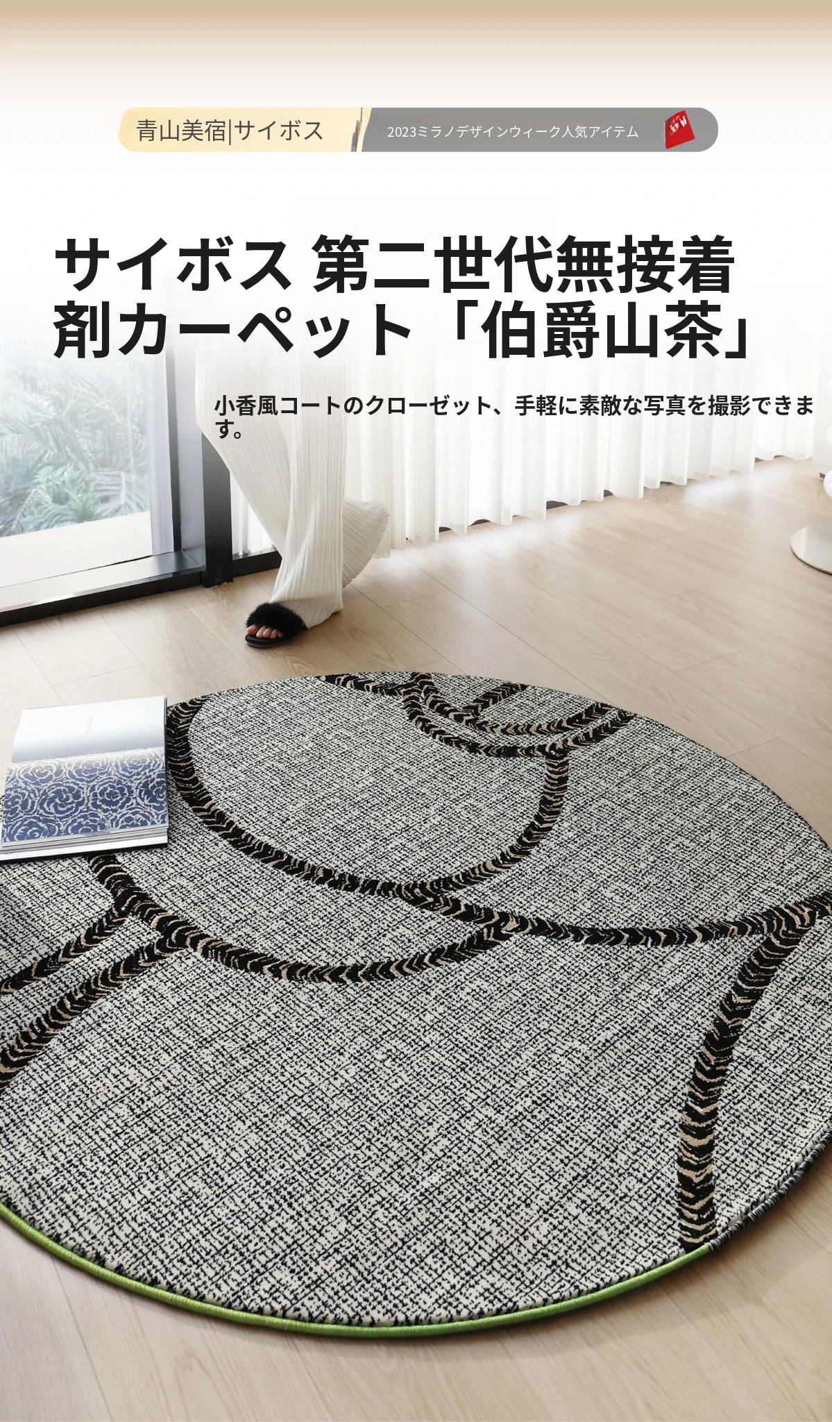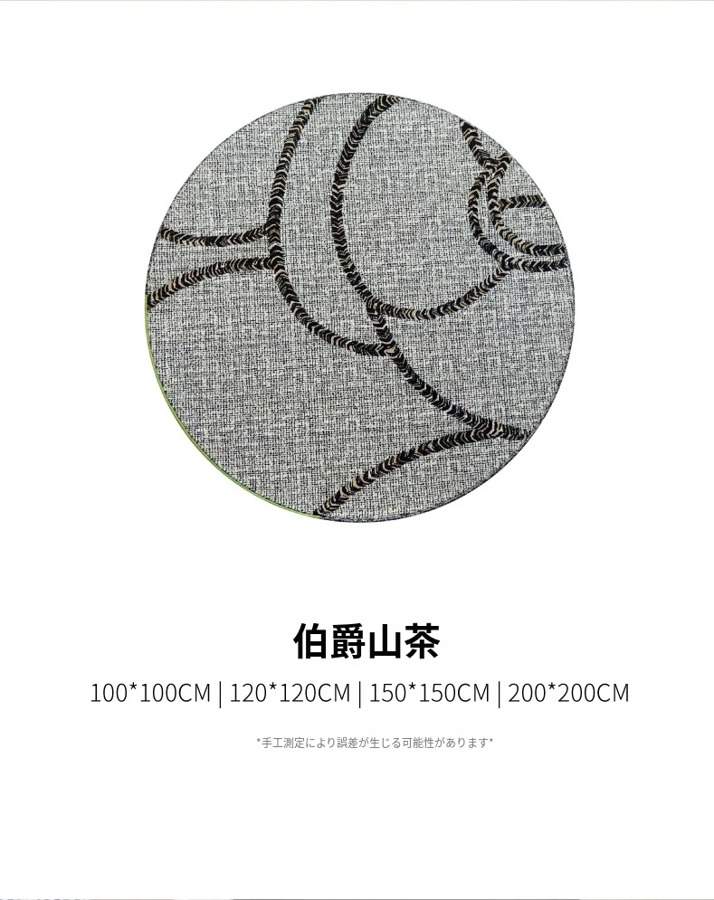 セイボス伯爵の山茶ラウンドカーペット - フォーマルで洗練されたデザイン。ホルムアルデヒドフリー、接着剤不使用で安心。フランス風の寝室や高級クローゼットにぴったりな、軽やかな贅沢感を演出します。