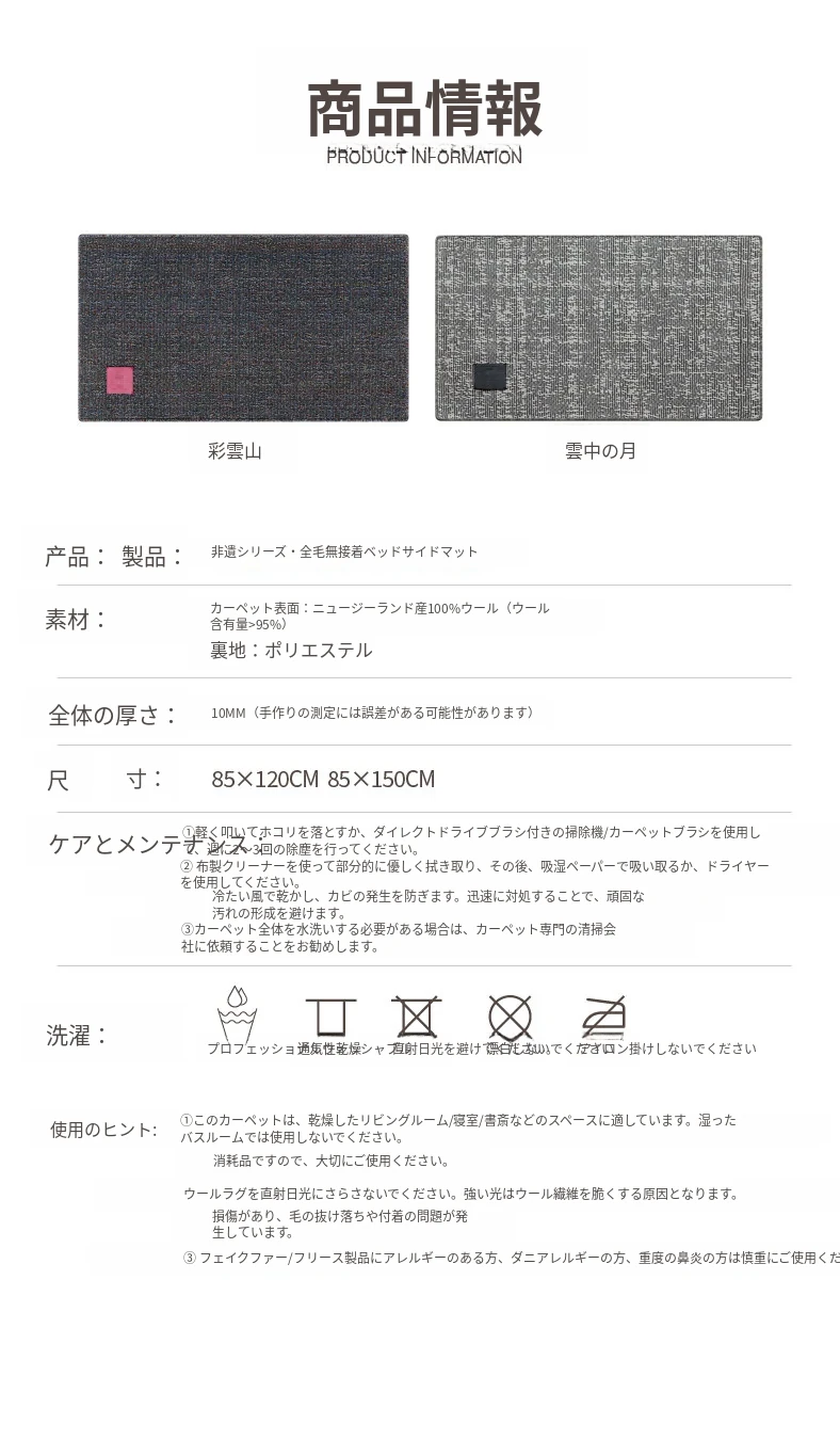 云中月ベッドサイドカーペット (輸入全羊毛)