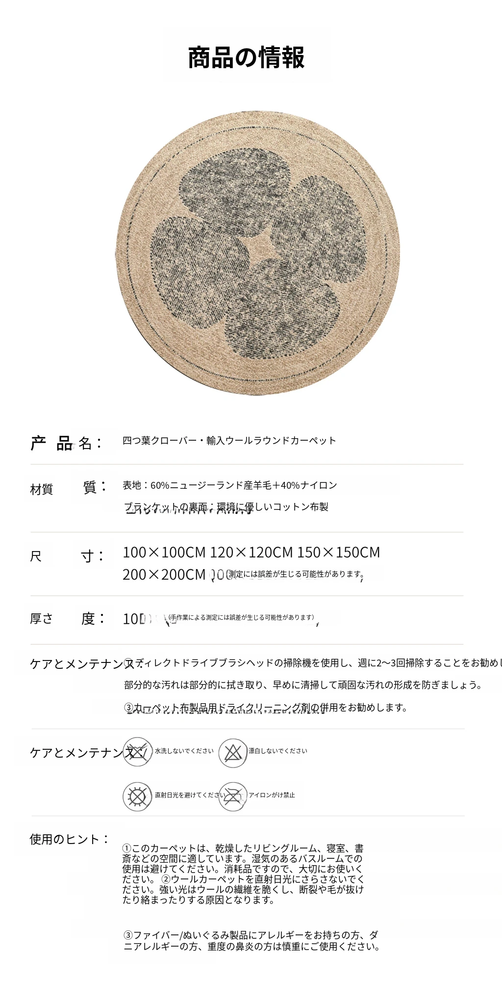 クローバー・ラウンドカーペット (ニュージーランドウール 本当に柔らかく弾力性あり)