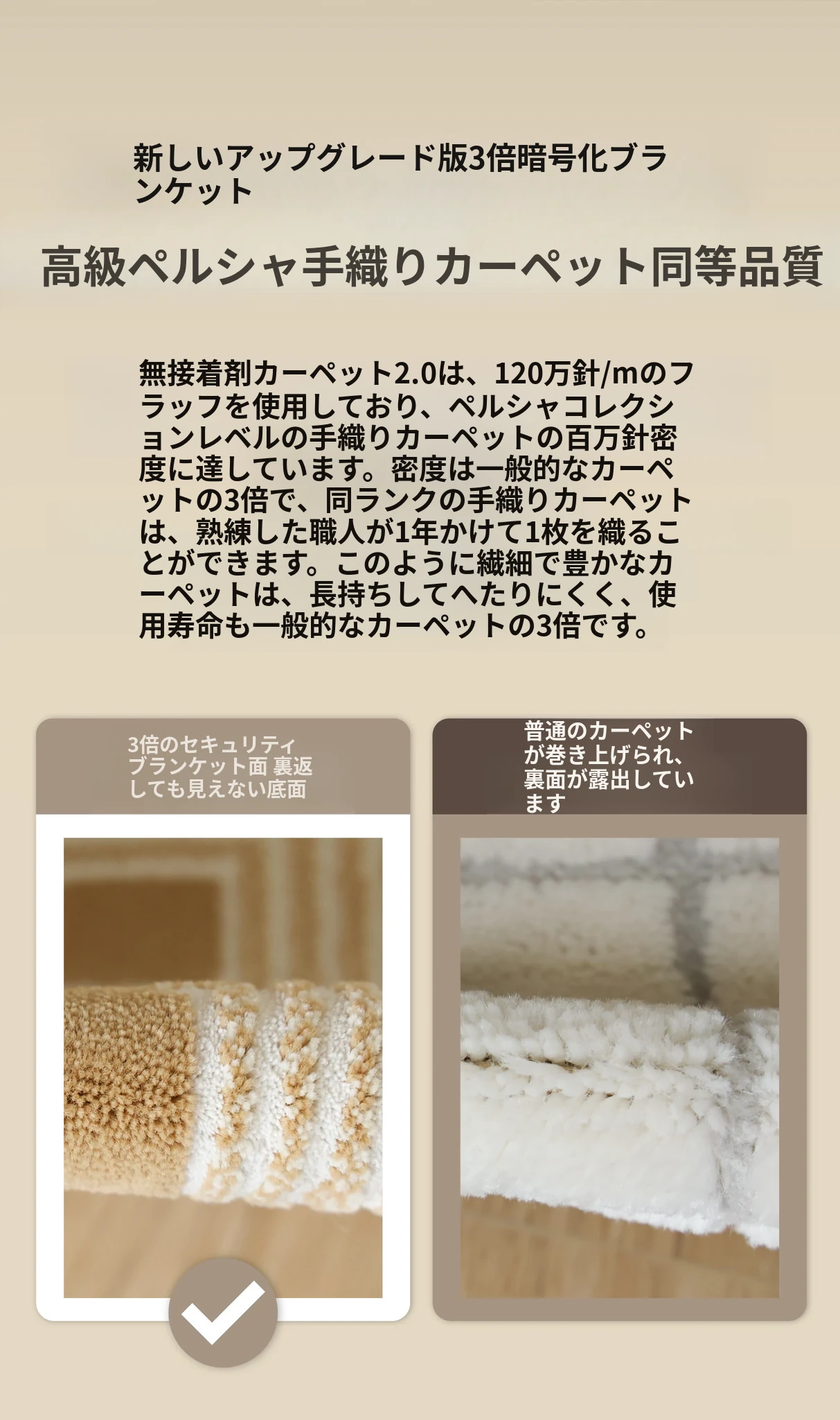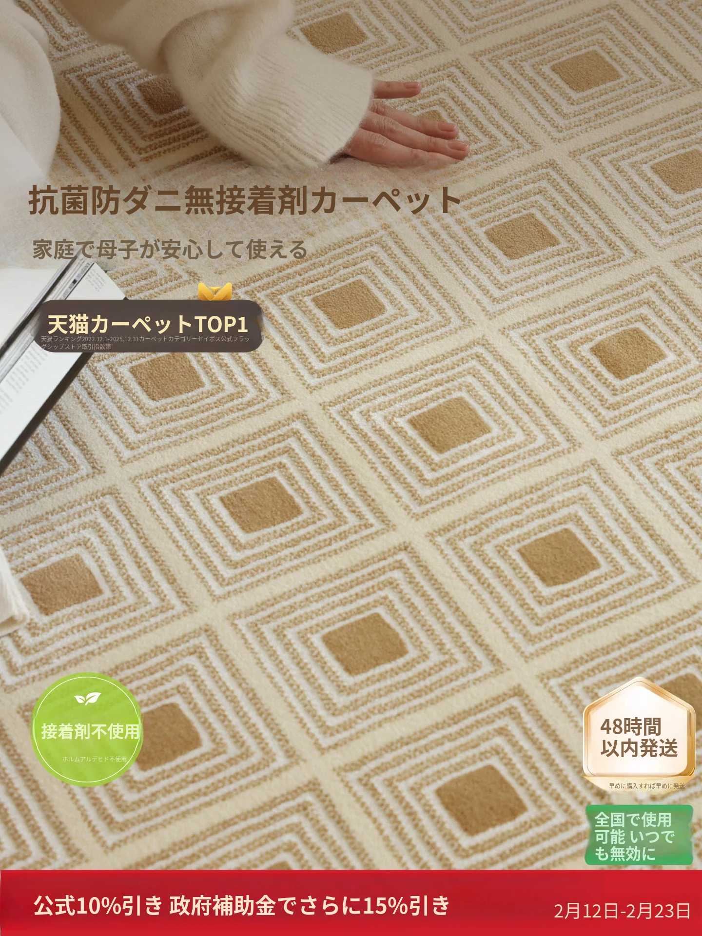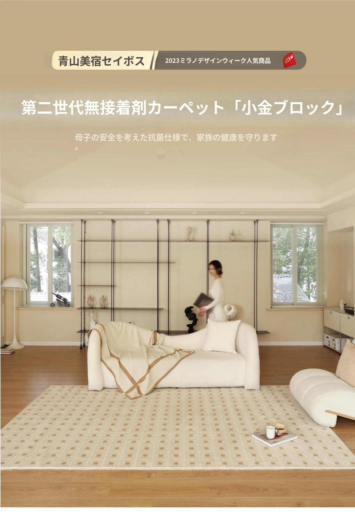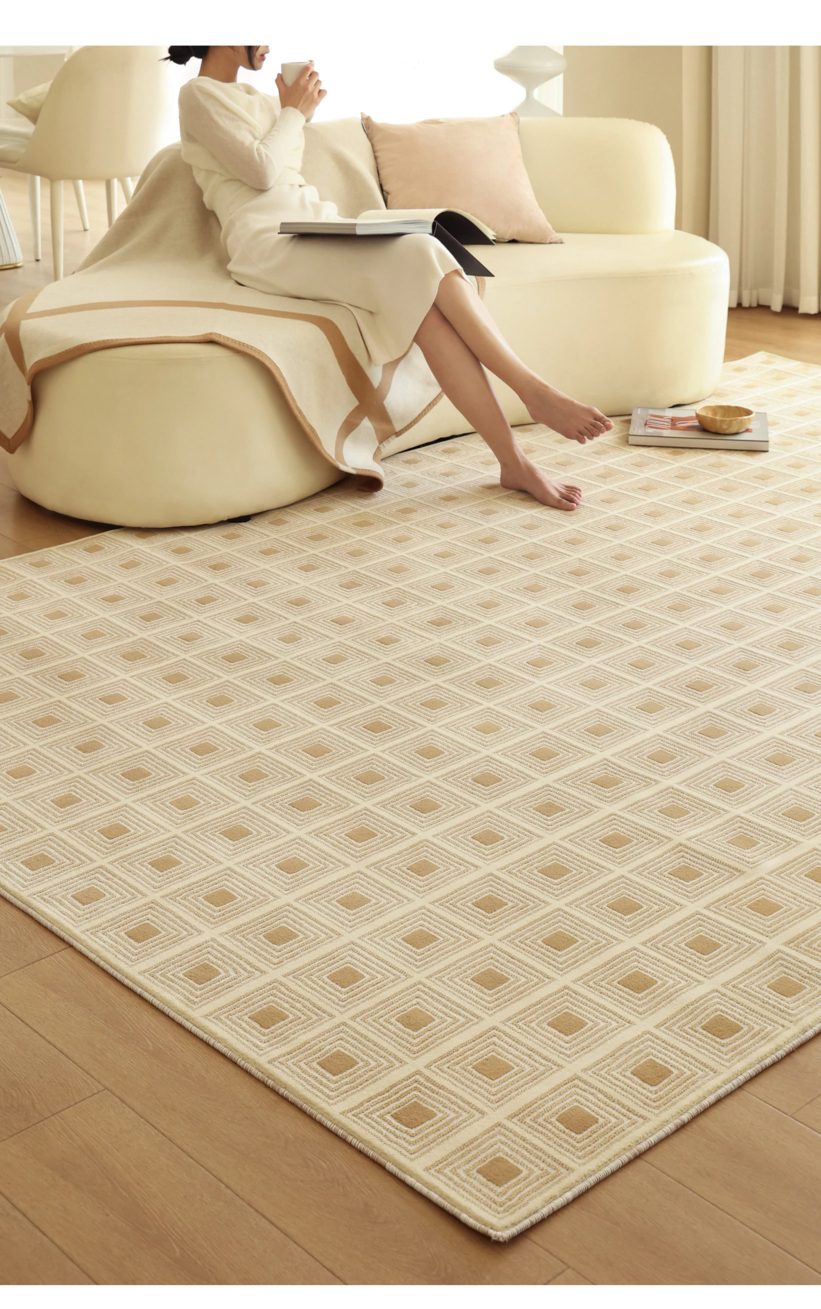 セボス 無接着剤リビングカーペット 抗菌・ホルムアルデヒドフリー 小さなゴールドタイルの高級感 軽やかなラグジュアリー フレンチクリームスタイル 寝室に最適!