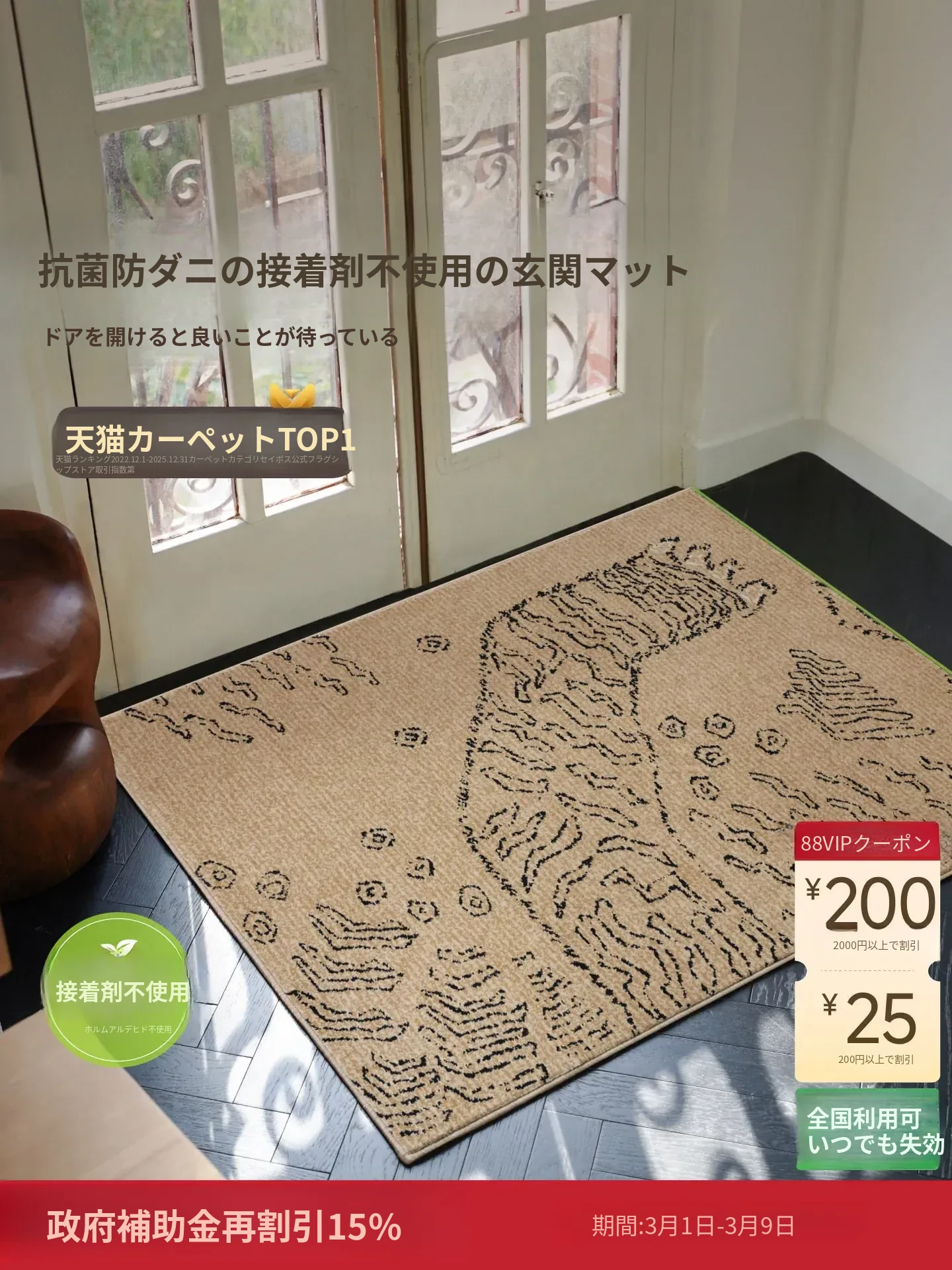 サイボス高級感あふれる防水・防汚の玄関マット|リビングに最適!接着剤不要の抗菌フットマット|青山の美宿を演出する一品!
