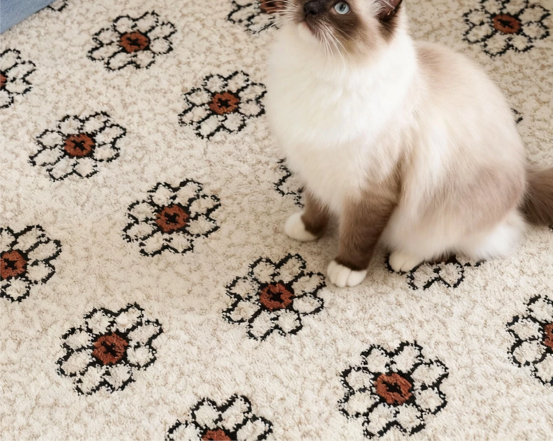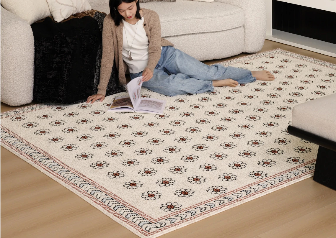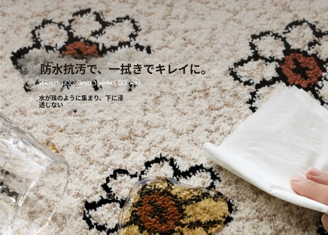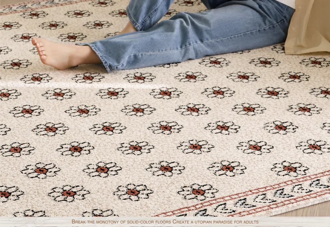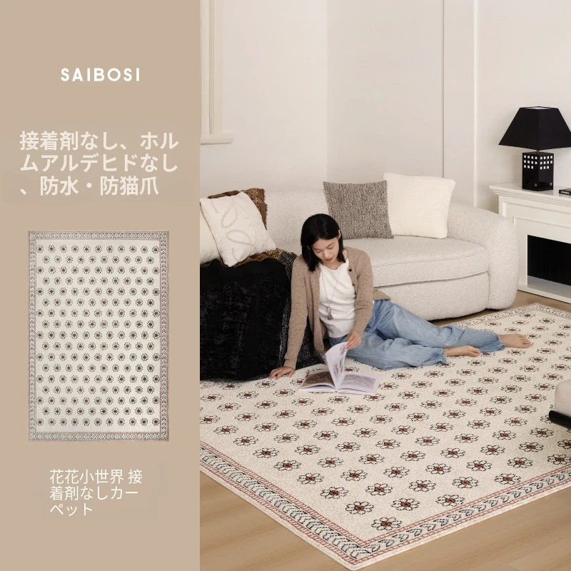 セイボスフラワーの無接着防水ラグ - モダンアメリカンスタイルのリビング&寝室にぴったり!上質な軽フレンチテイストで高級感を演出。