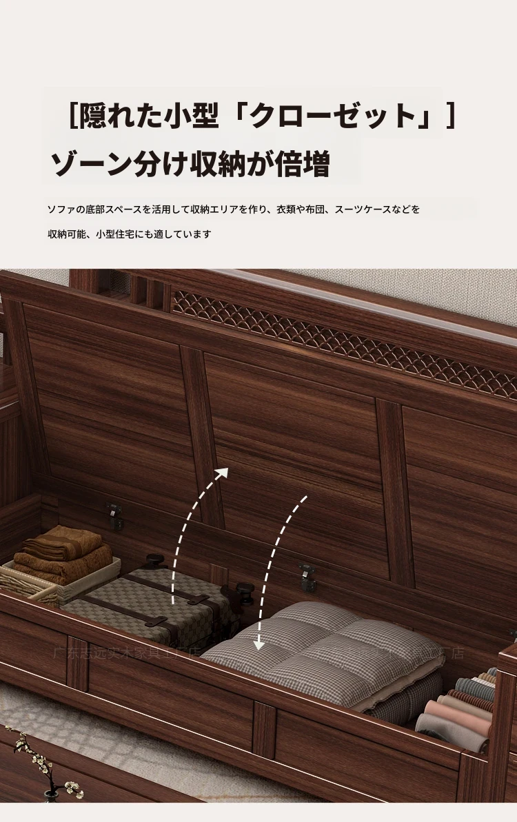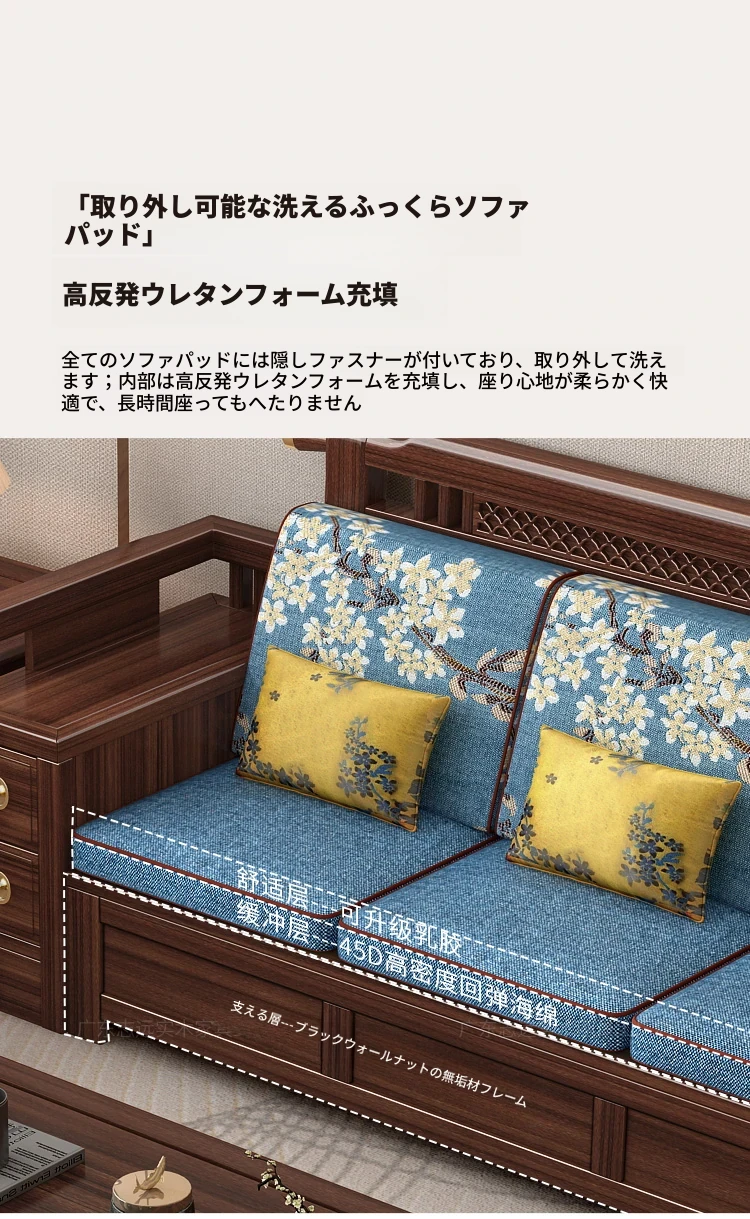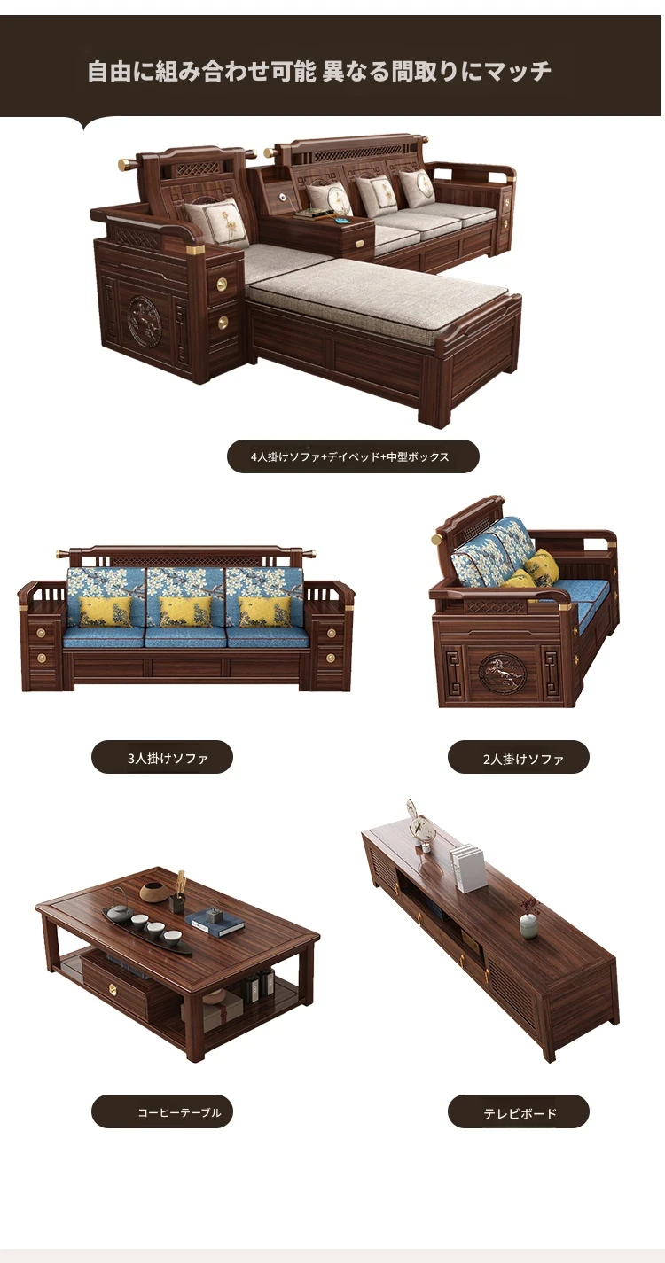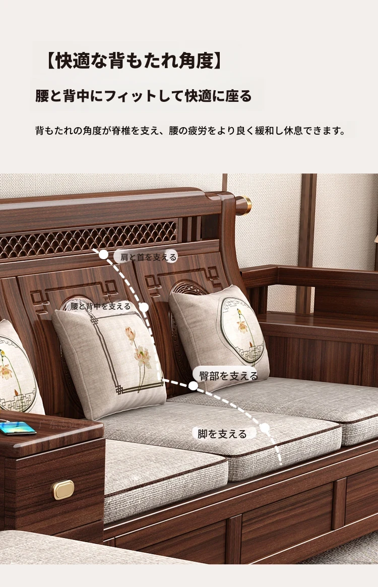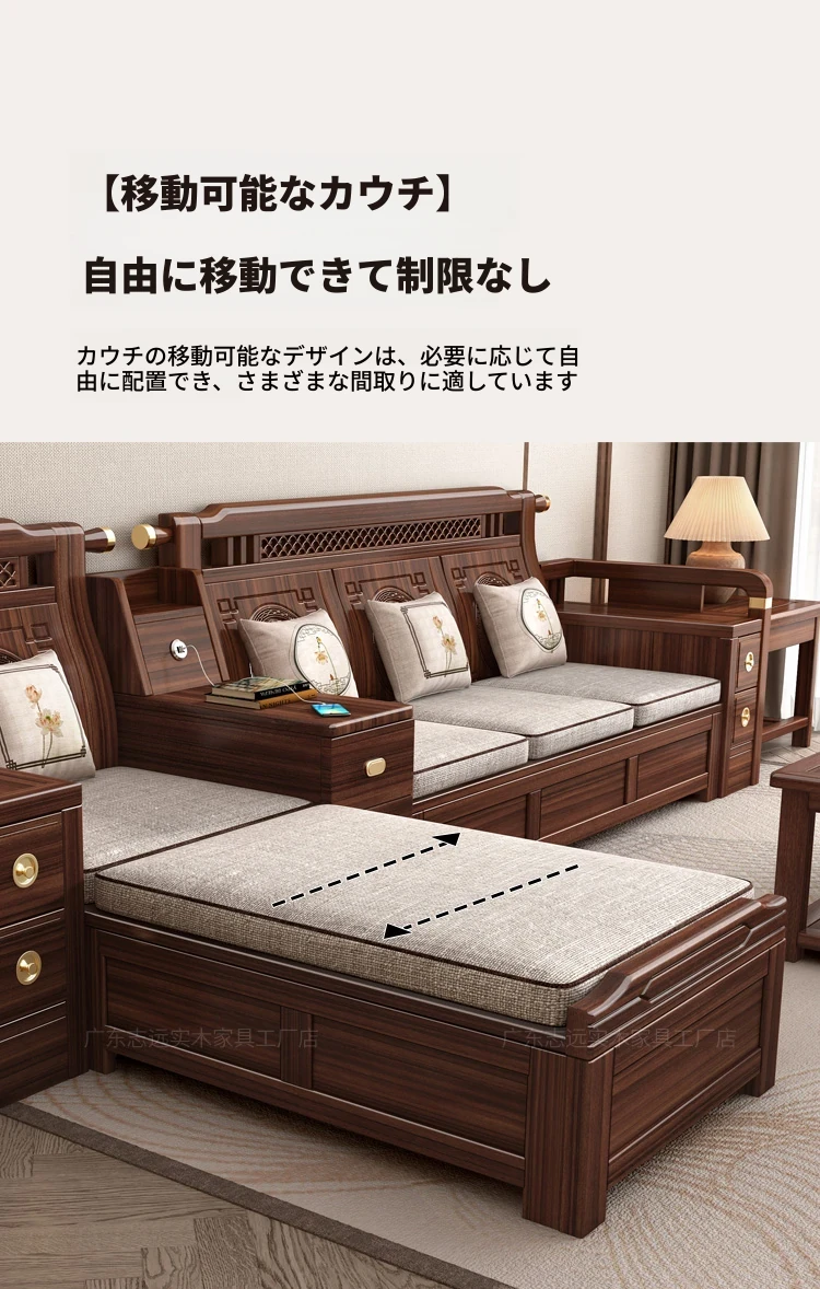 黒ウォールナット無垢材ソファ|全無垢・コーナー付き・デザイン性抜群|冬夏兼用・収納機能付き|新中式スタイルのリビングソファで、優雅な空間を演出!