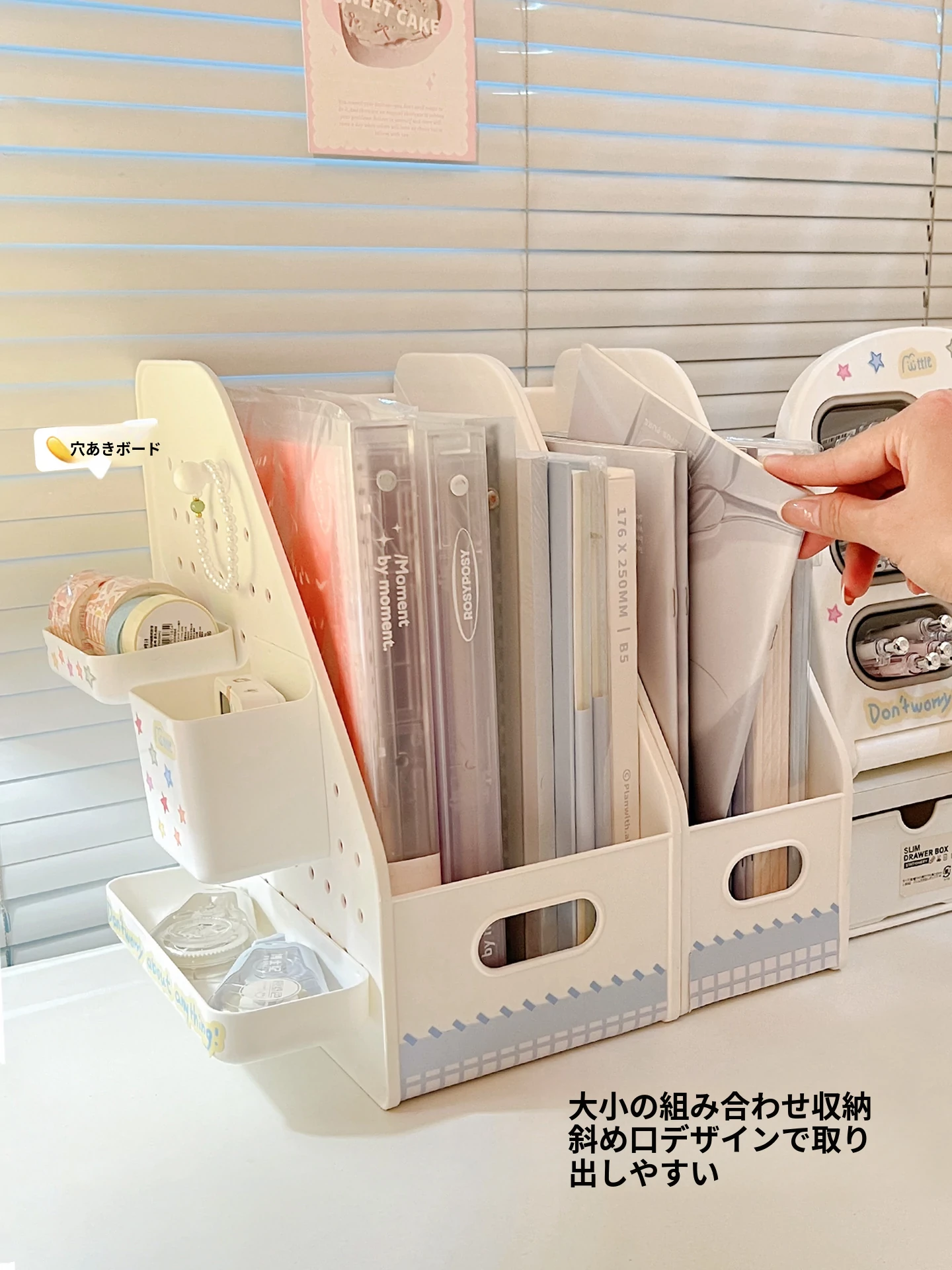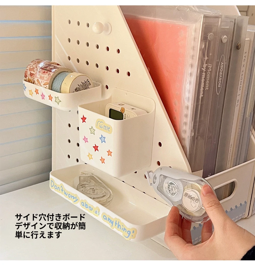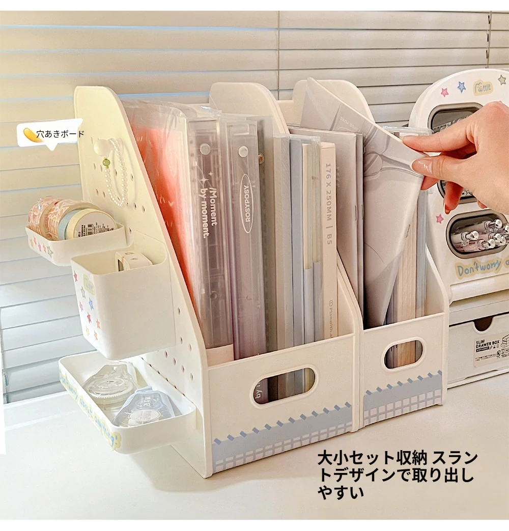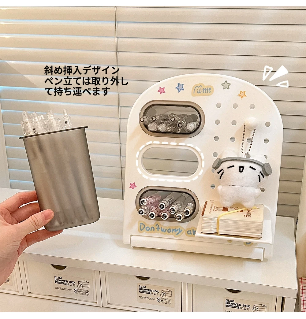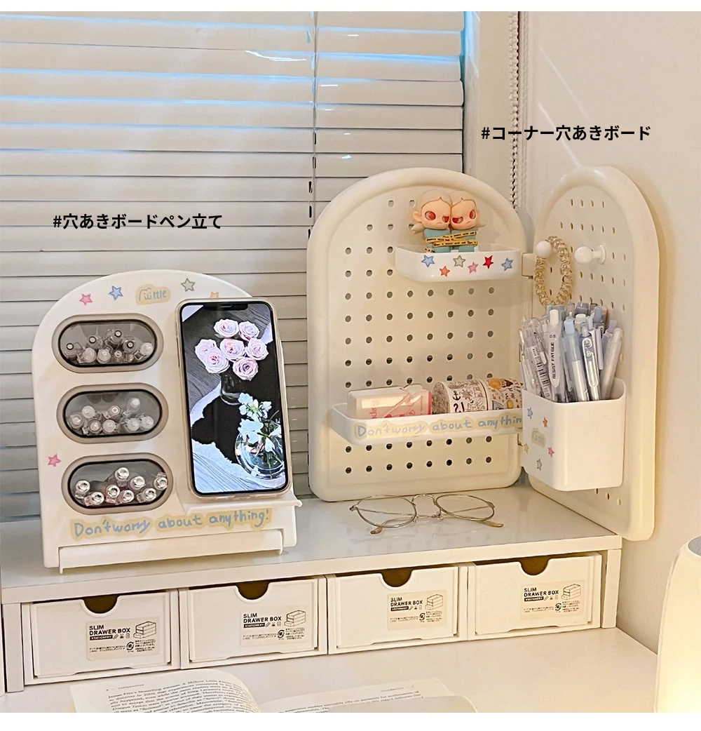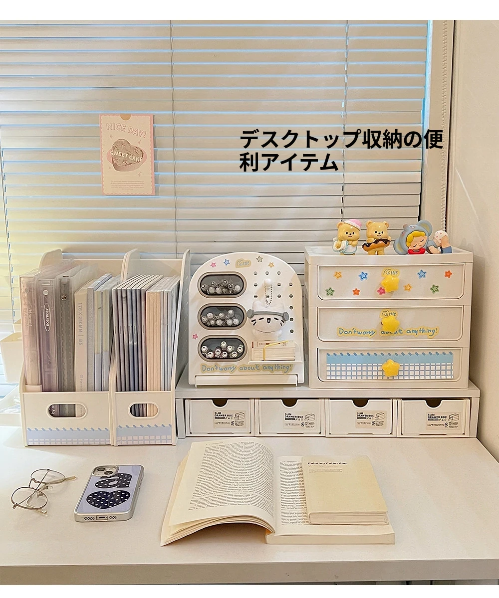 学生寮に最適!デスク上の収納ボックスセット - 書類や文具を整頓できるスタイリッシュなデザイン。引き出しや机上での斜め挿しが可能な仕切り付きペン立てで、オフィスや学習スペースをスッキリ整理!