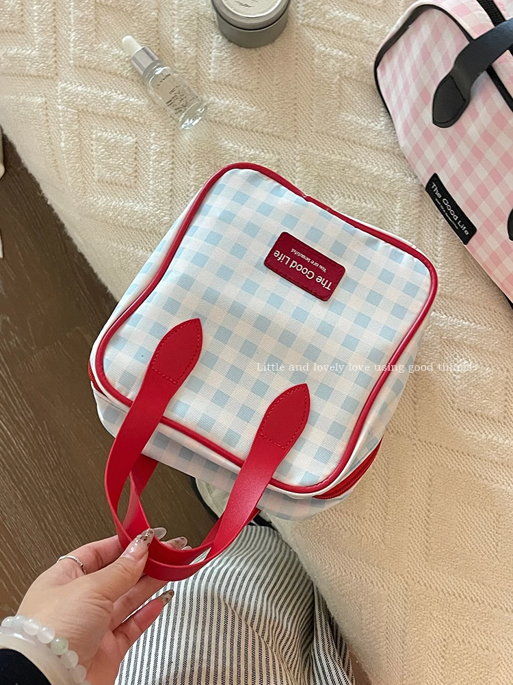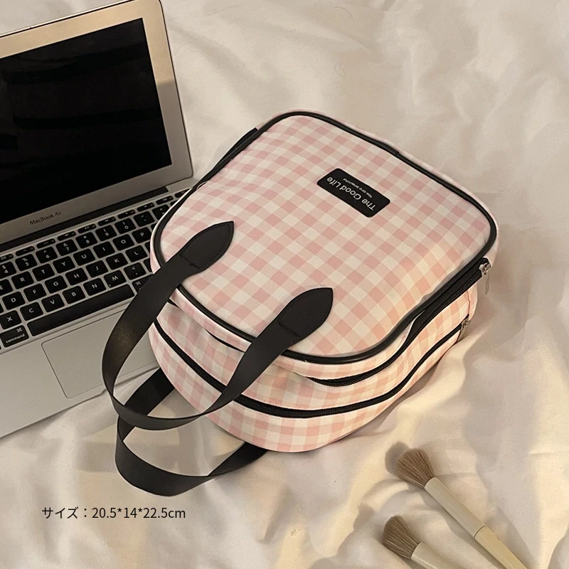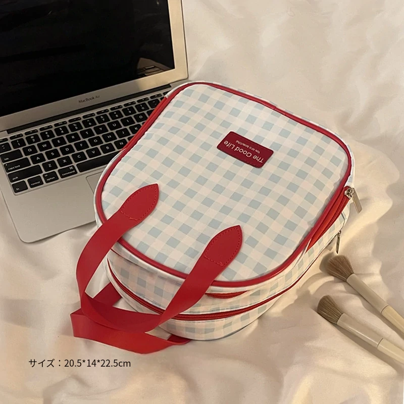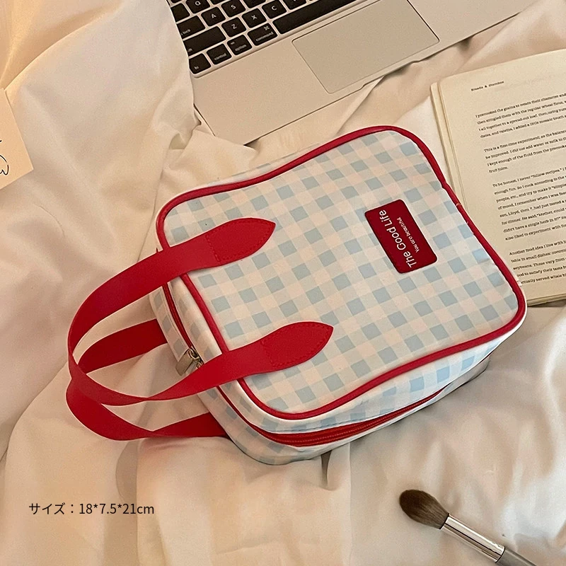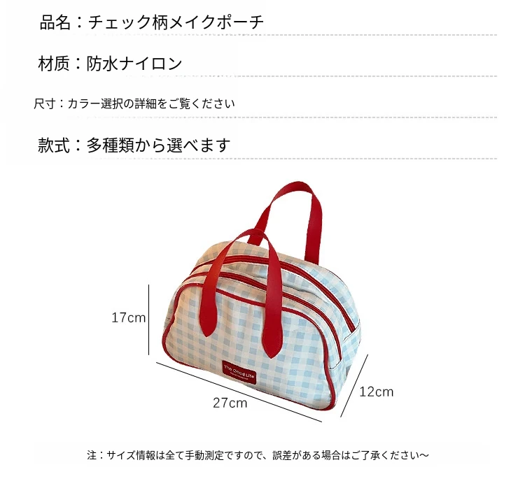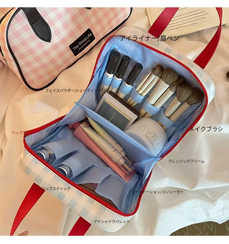 トラベル用チェック柄メイクポーチ - 大容量で機能的!スキンケアや洗面用具を整理整頓できる便利な仕分け収納バッグで、外出時もスタイリッシュに。