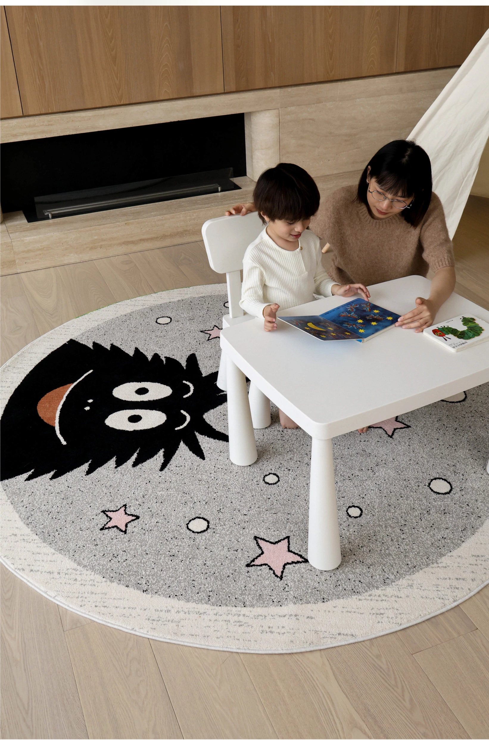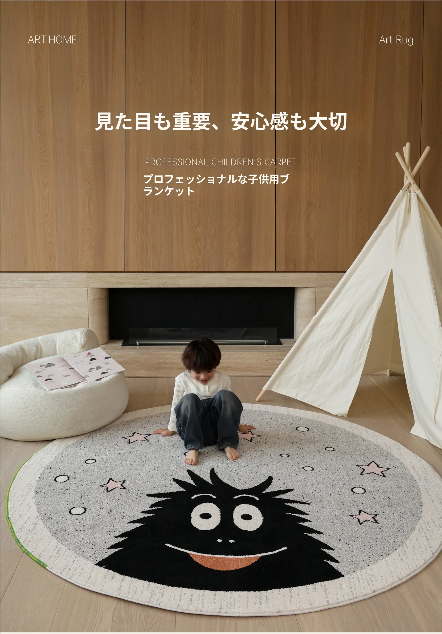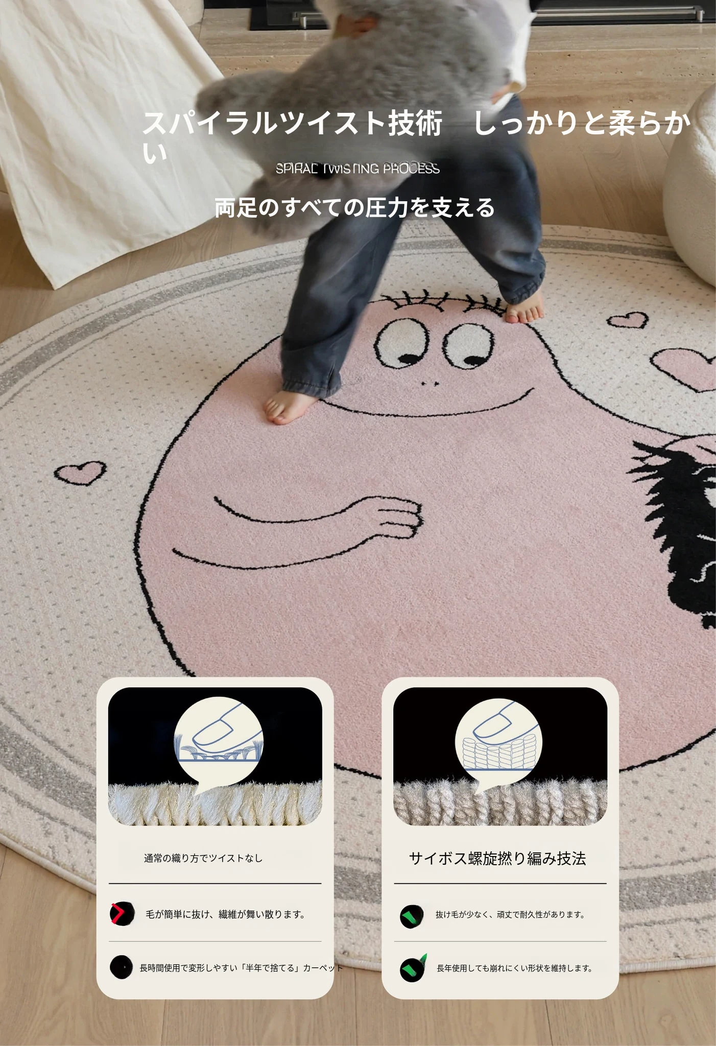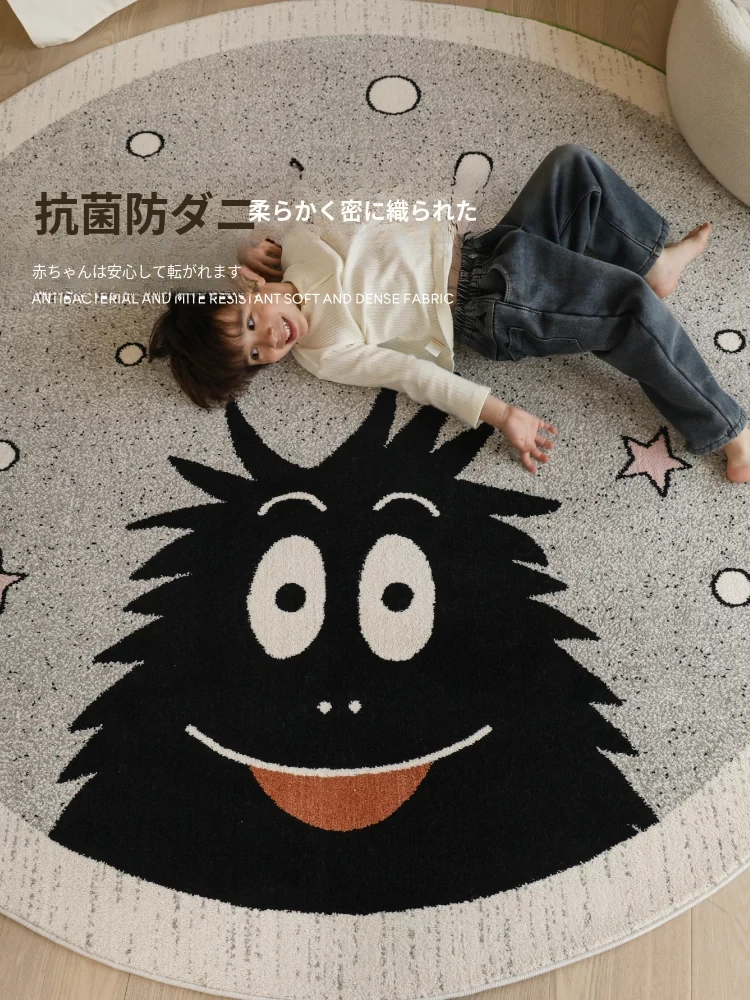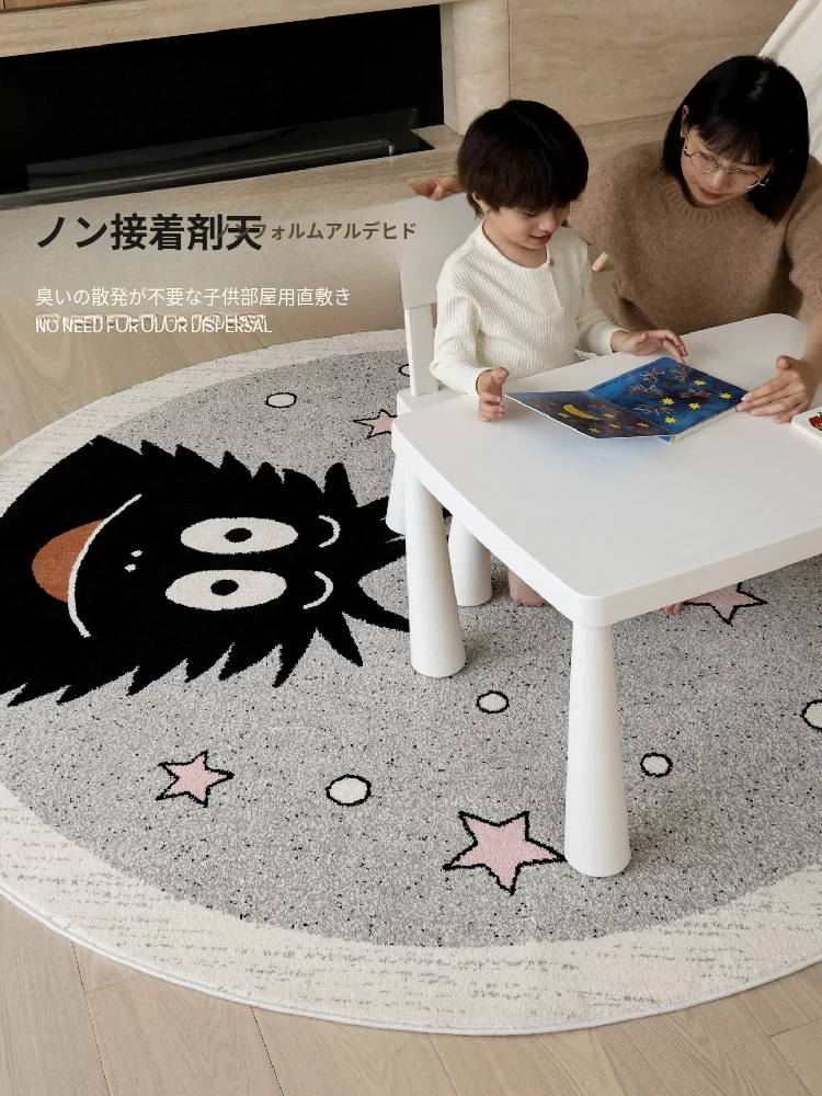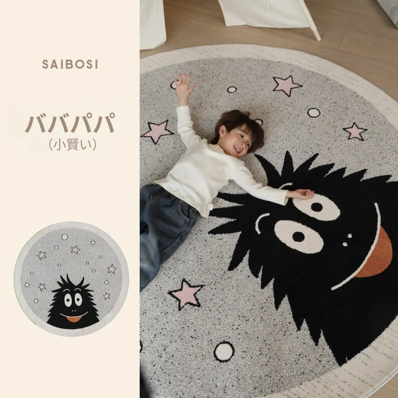 セイボス×ババパパの無接着剤ラウンドカーペット、フォーマルデザインで子供部屋やベッドサイドに最適!ホルムアルデヒドフリーで安心、安全な遊びや学びの空間を提供します。
