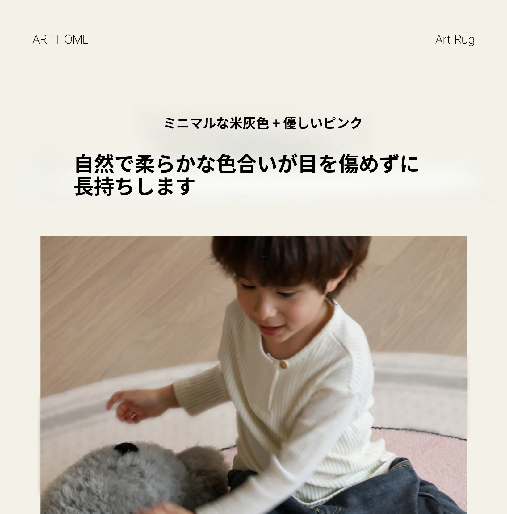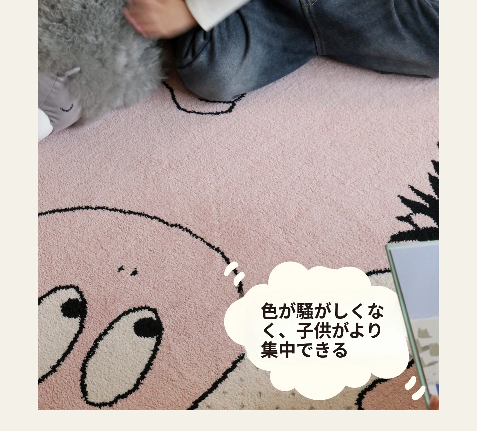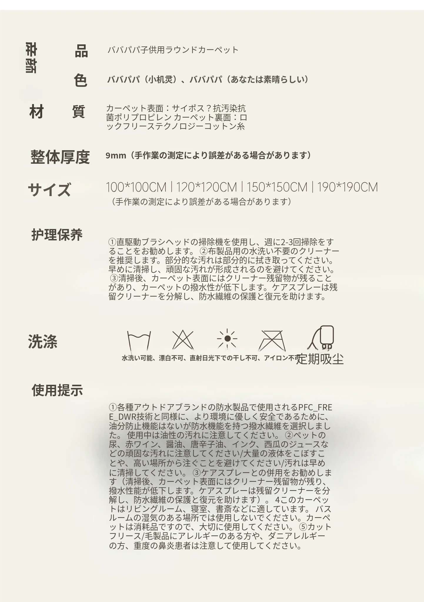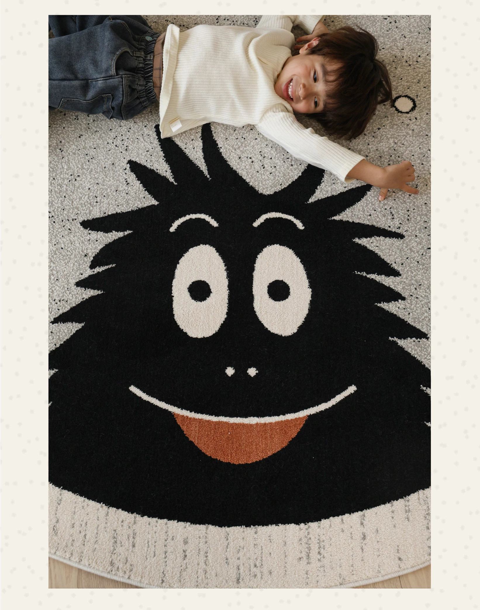 セイボス×ババパパの無接着剤ラウンドカーペット、フォーマルデザインで子供部屋やベッドサイドに最適!ホルムアルデヒドフリーで安心、安全な遊びや学びの空間を提供します。