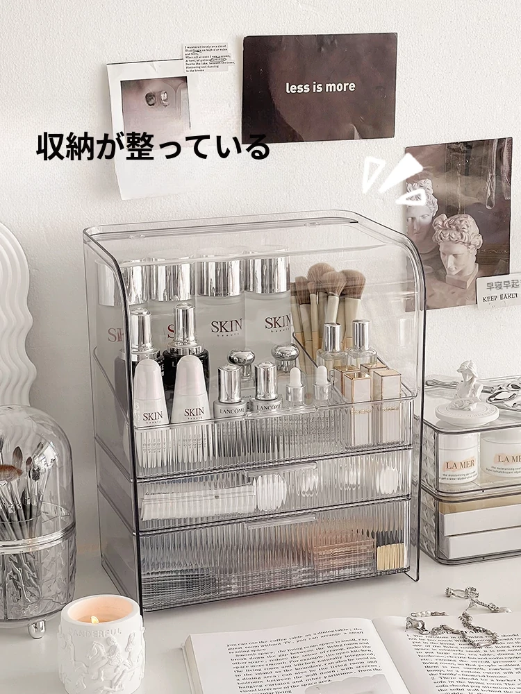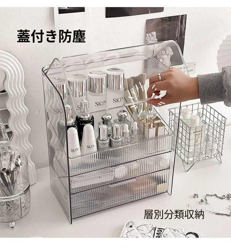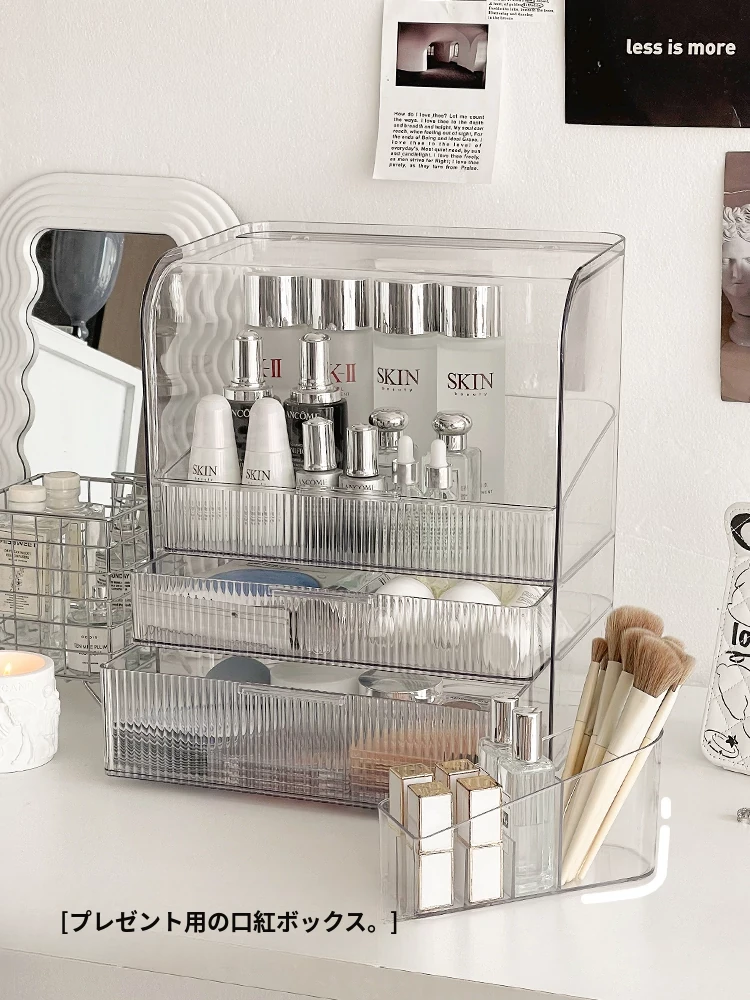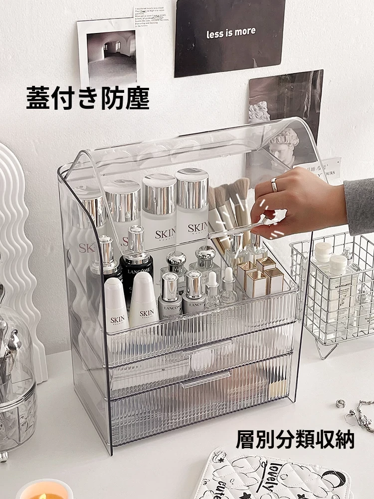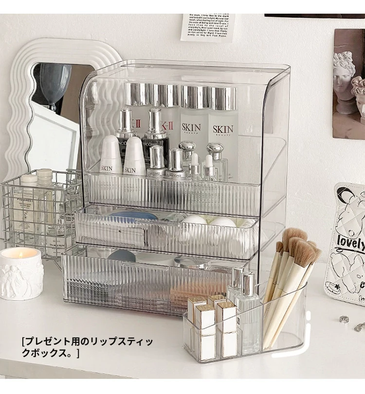 透明化粧品収納ボックス 防塵デザイン 引き出し式 デスクトップ用 リップ・化粧ブラシ収納 メイク台・スキンケア用 上質感あふれる収納ラック