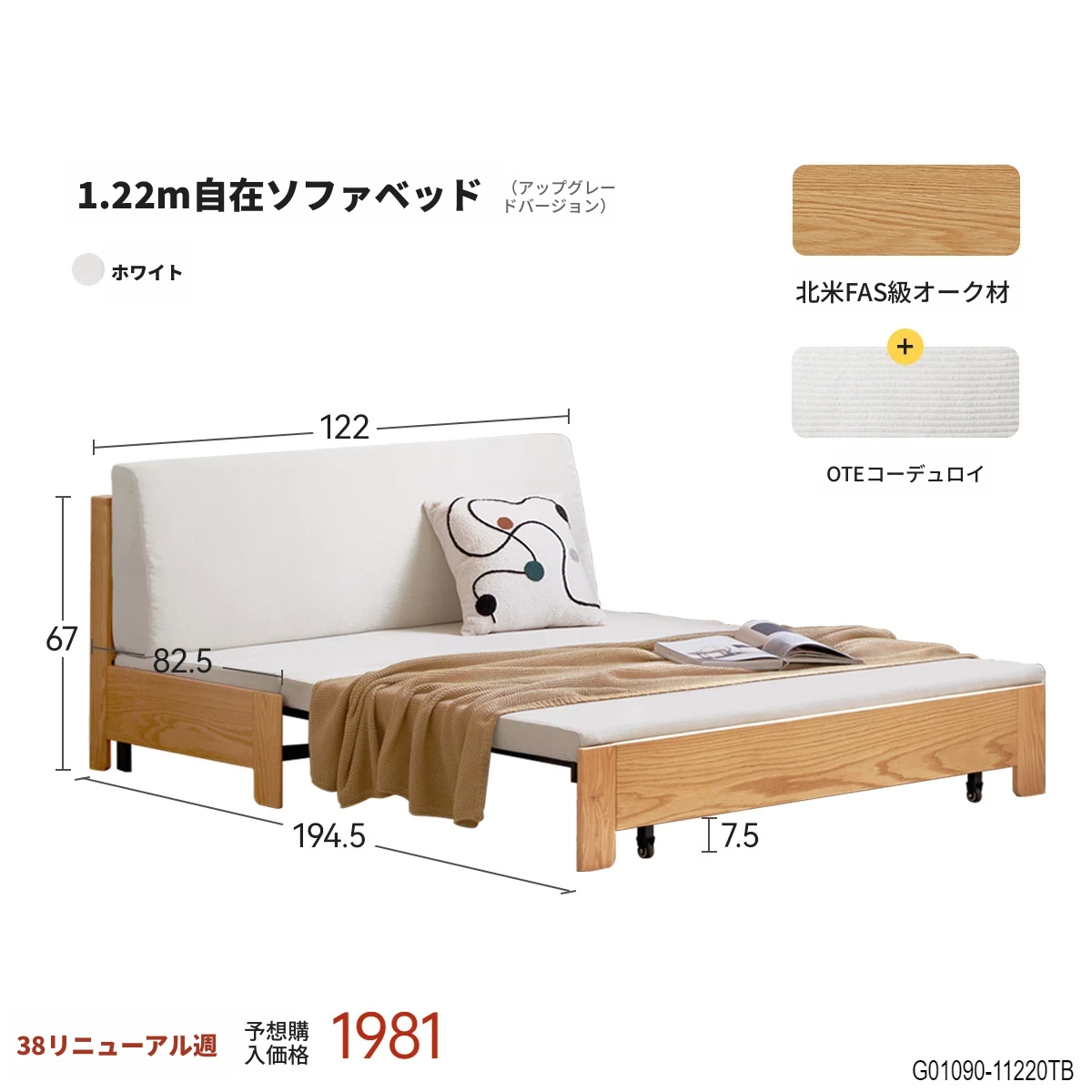 1.22mソファベッド-ホワイト(1220*840*670mm)