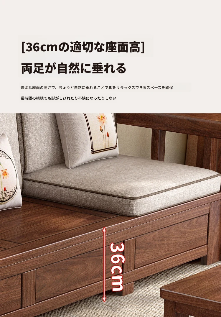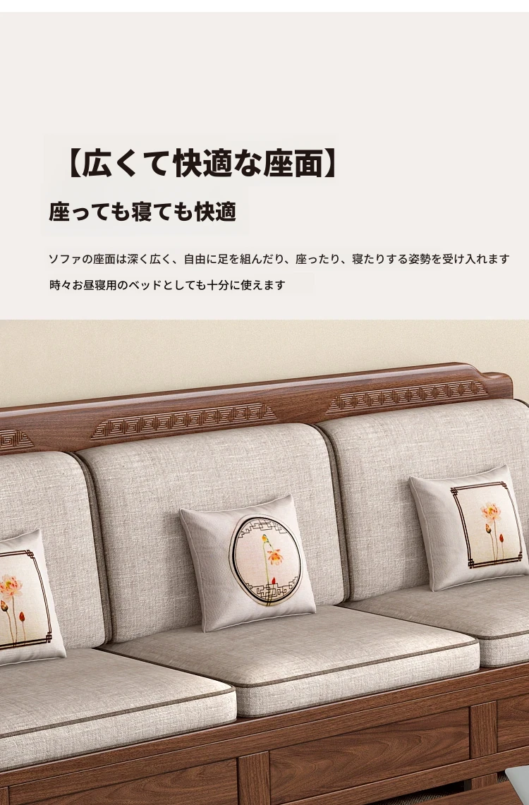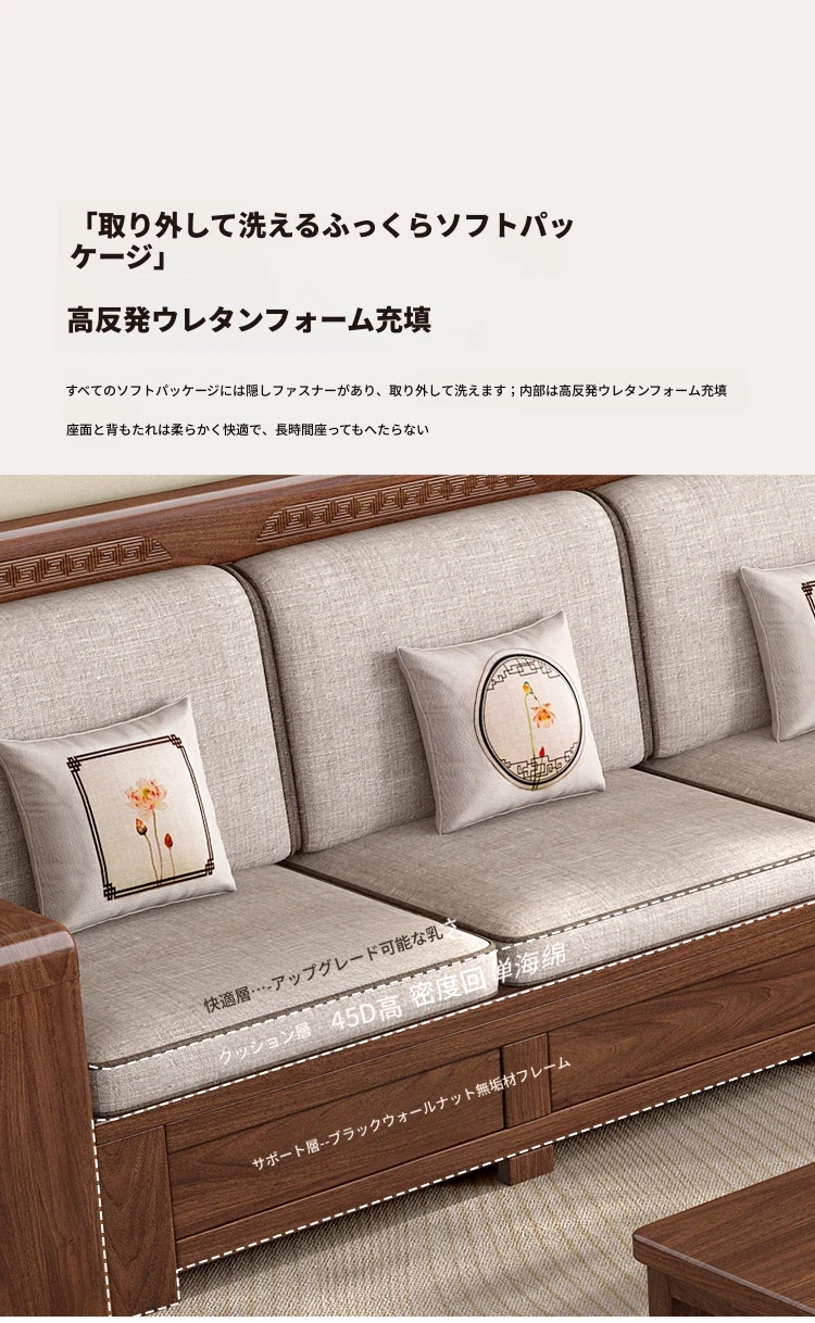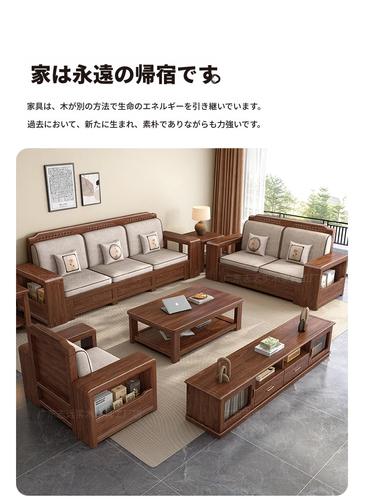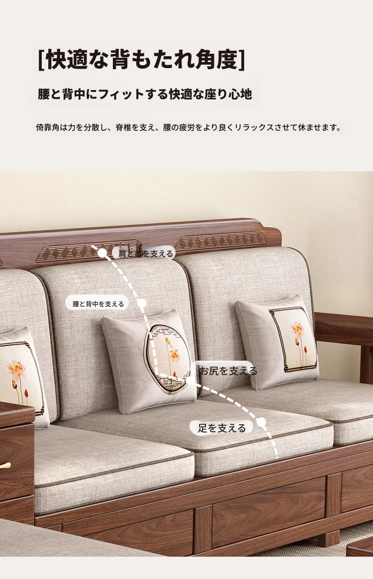 志遠家具の新中式スタイル!ブラックウォールナット無垢材使用、コンパクトなリビングに最適な2WAYファブリックソファ。冬も夏も快適にお使いいただけます!