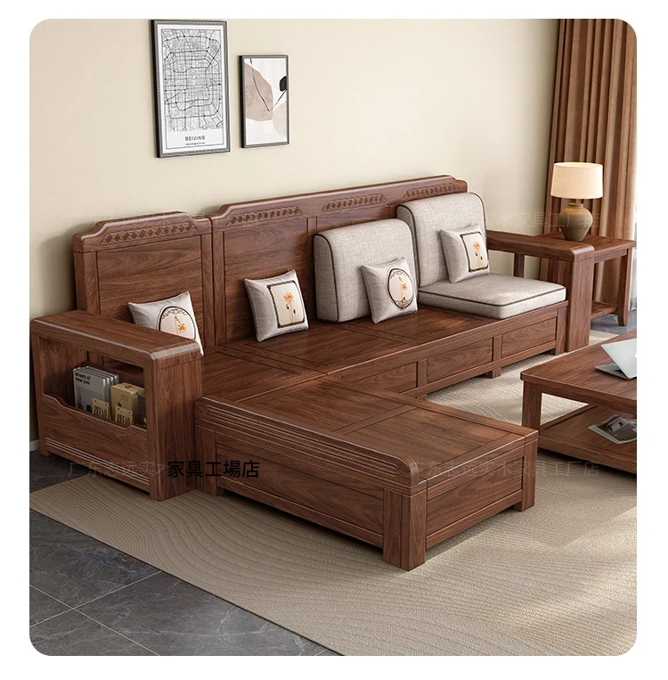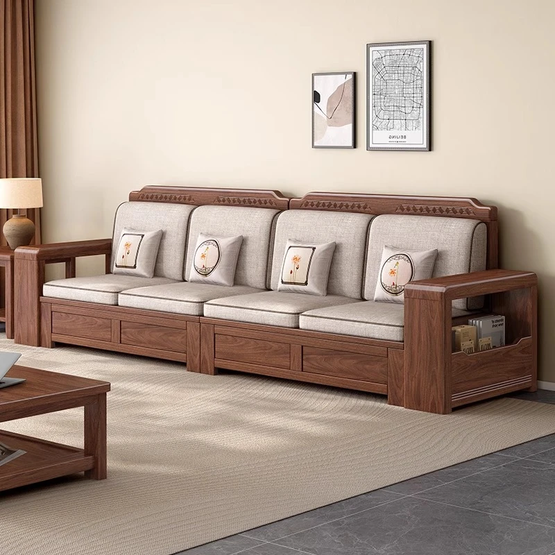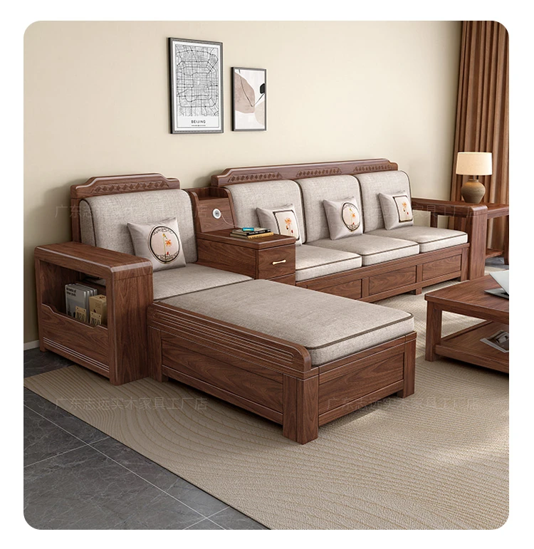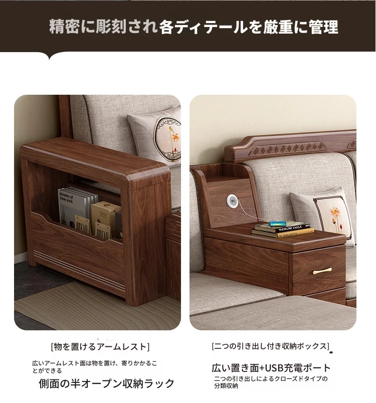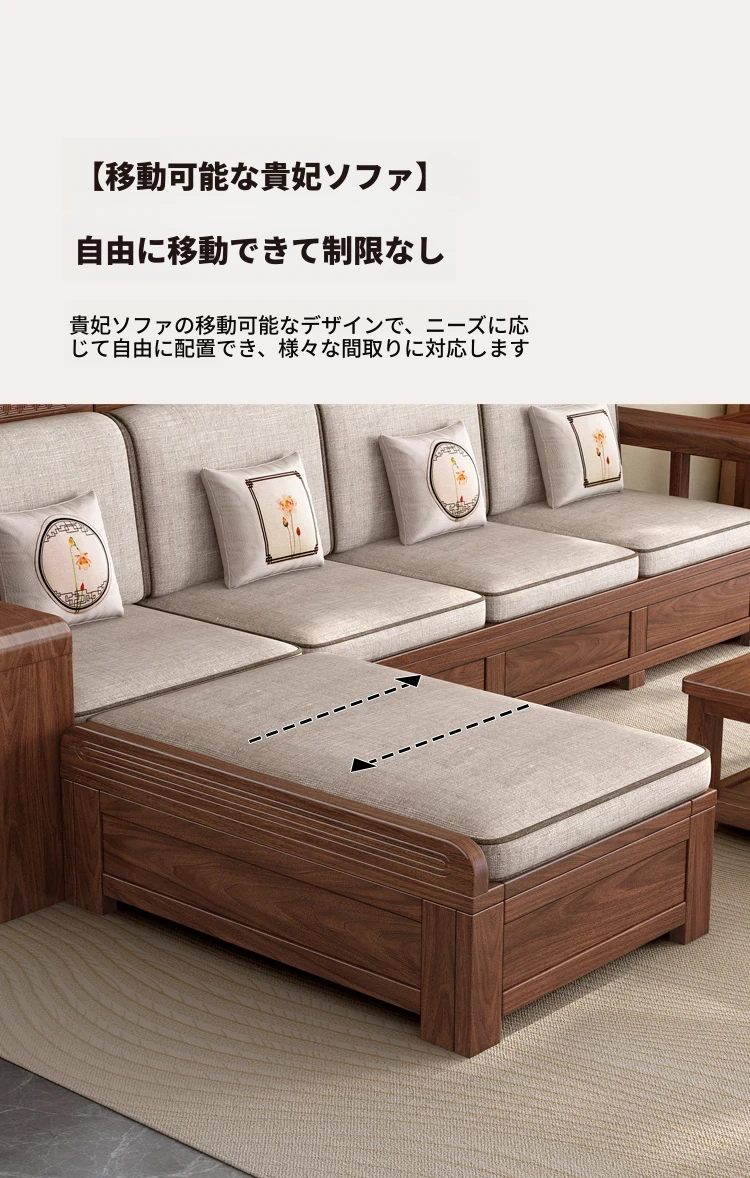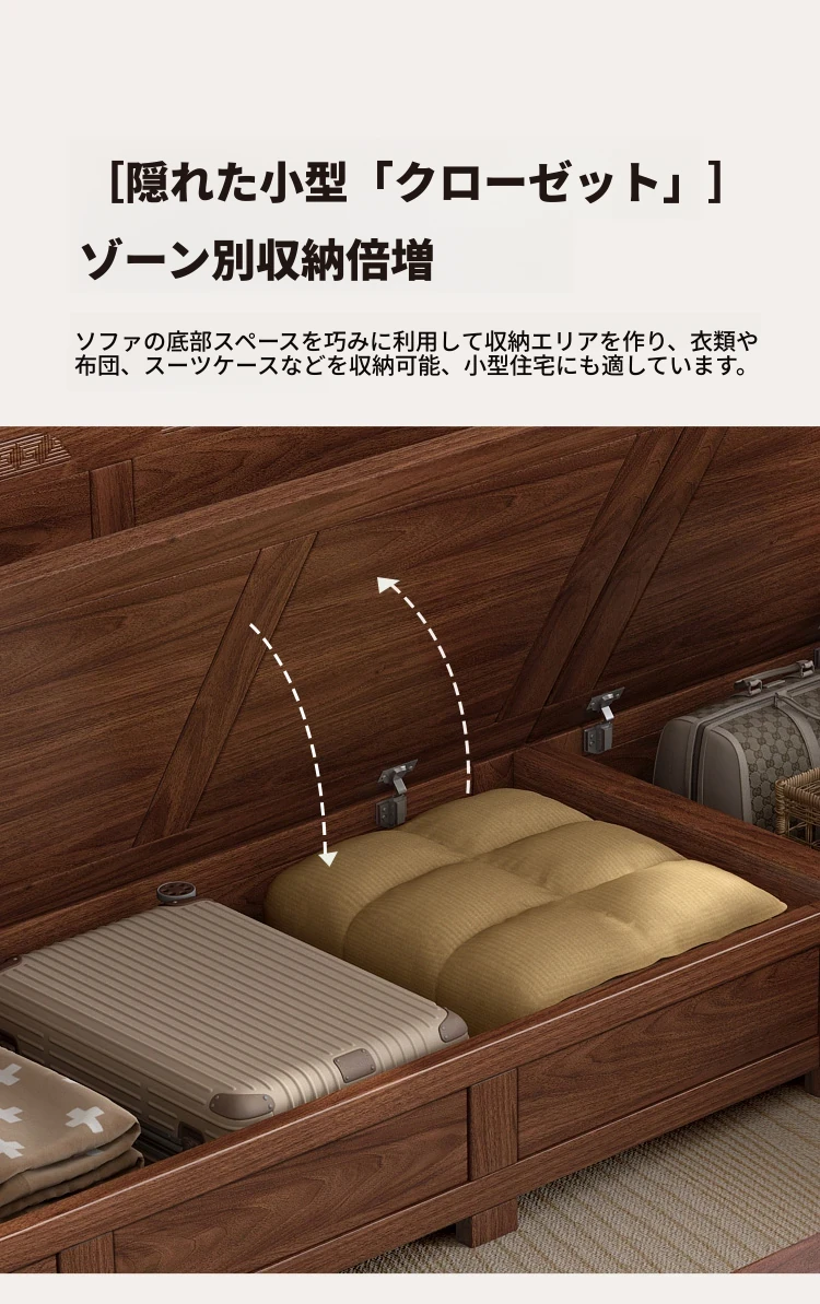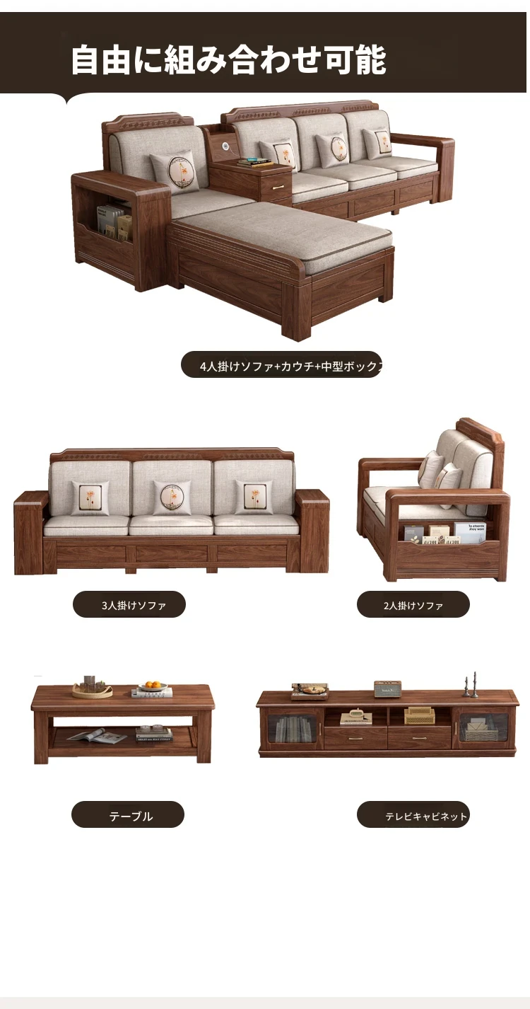志遠家具の新中式スタイル!ブラックウォールナット無垢材使用、コンパクトなリビングに最適な2WAYファブリックソファ。冬も夏も快適にお使いいただけます!