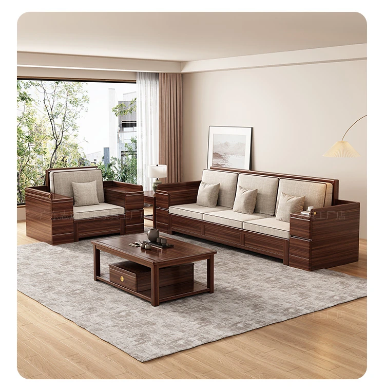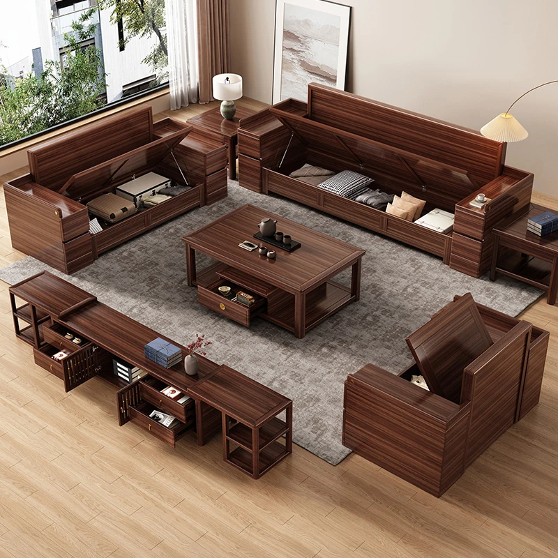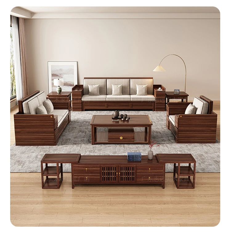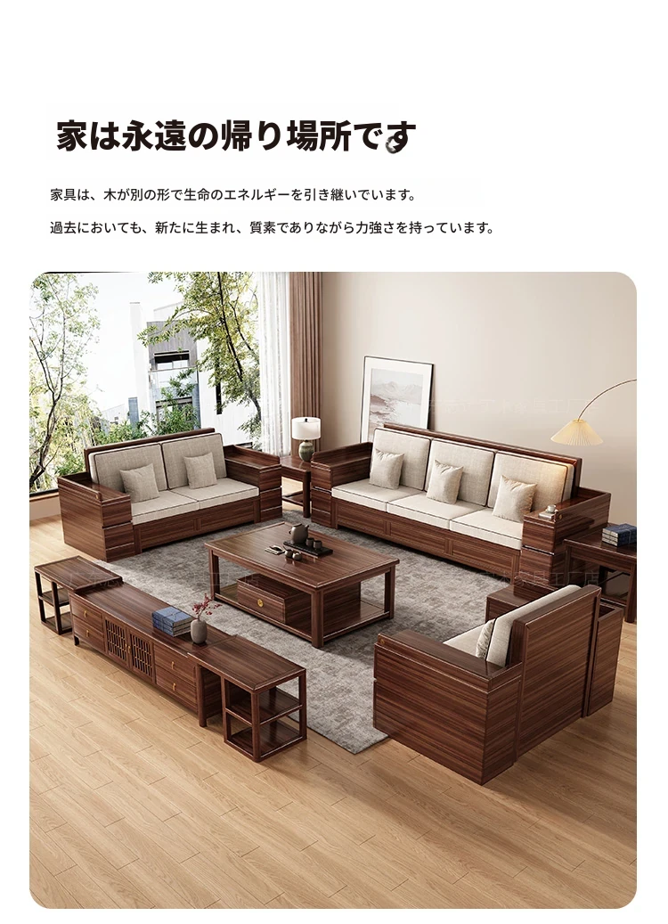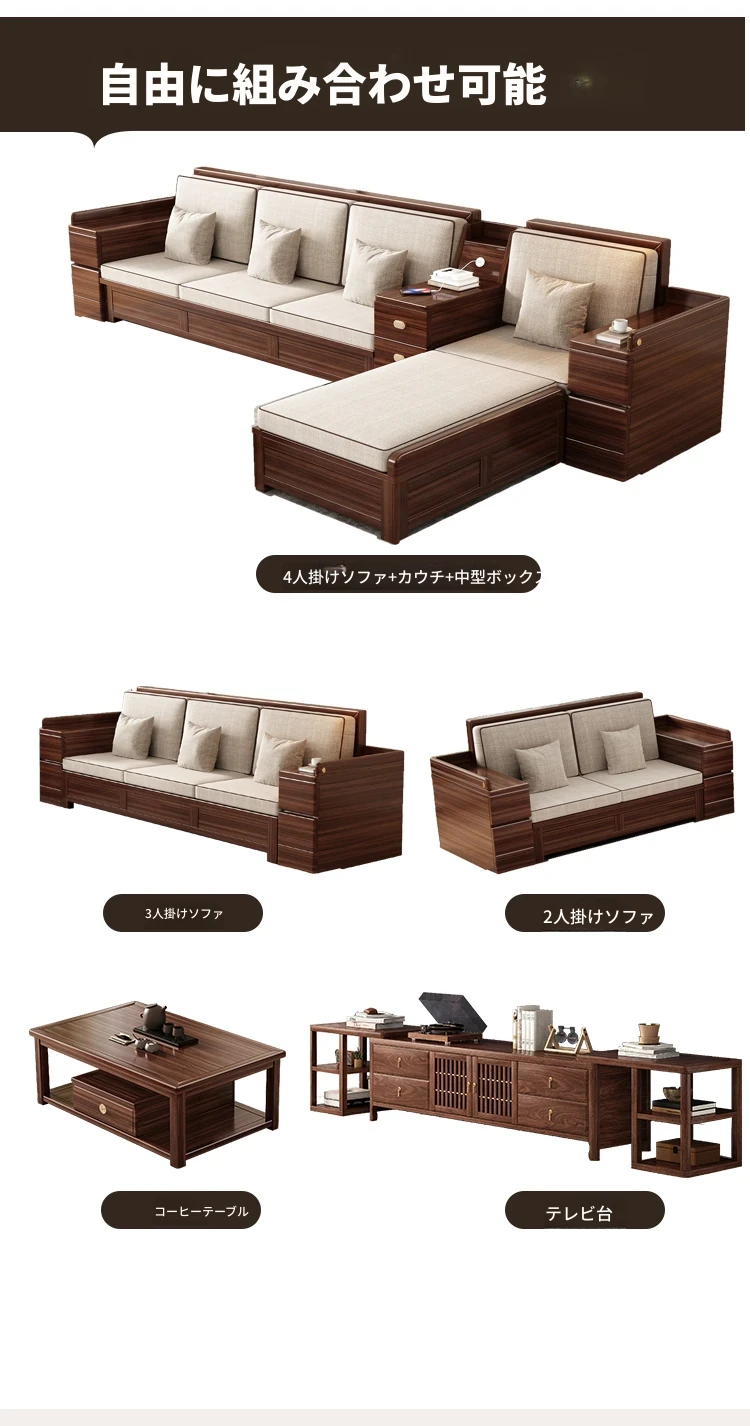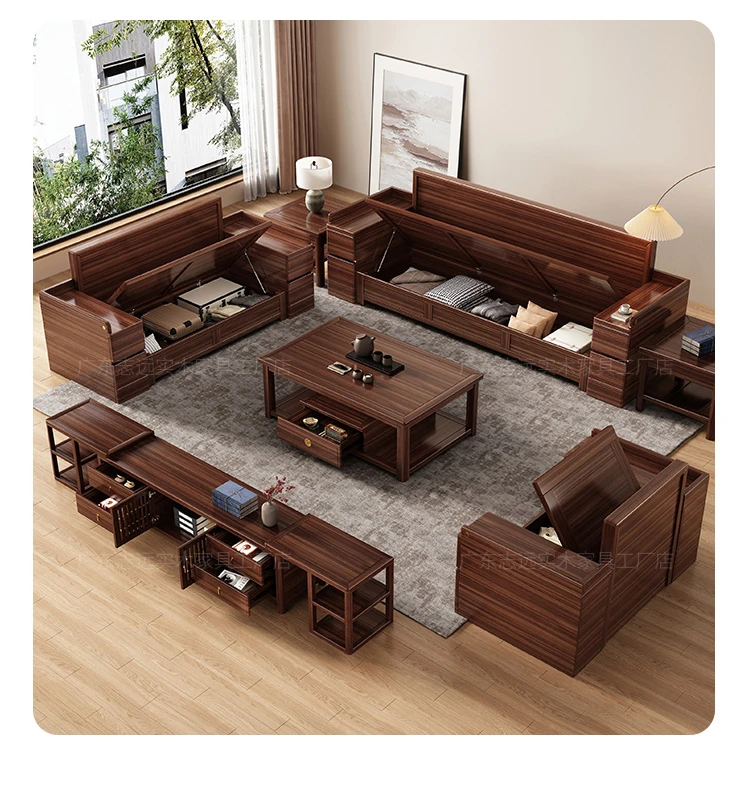 志遠家具の新中式スタイル、ブラックウォールナット製の実木ソファセット。冬は暖かく、夏は涼しい、北欧風の収納機能付きリビングソファで、快適な空間を提供します。