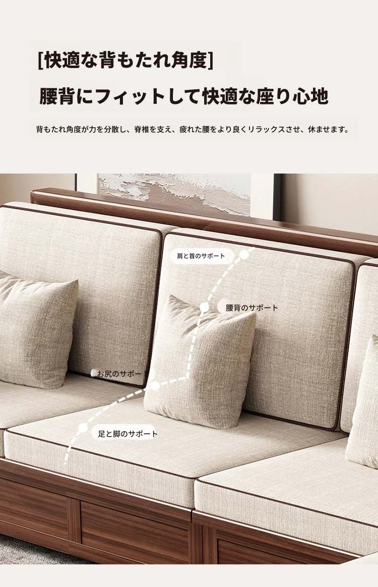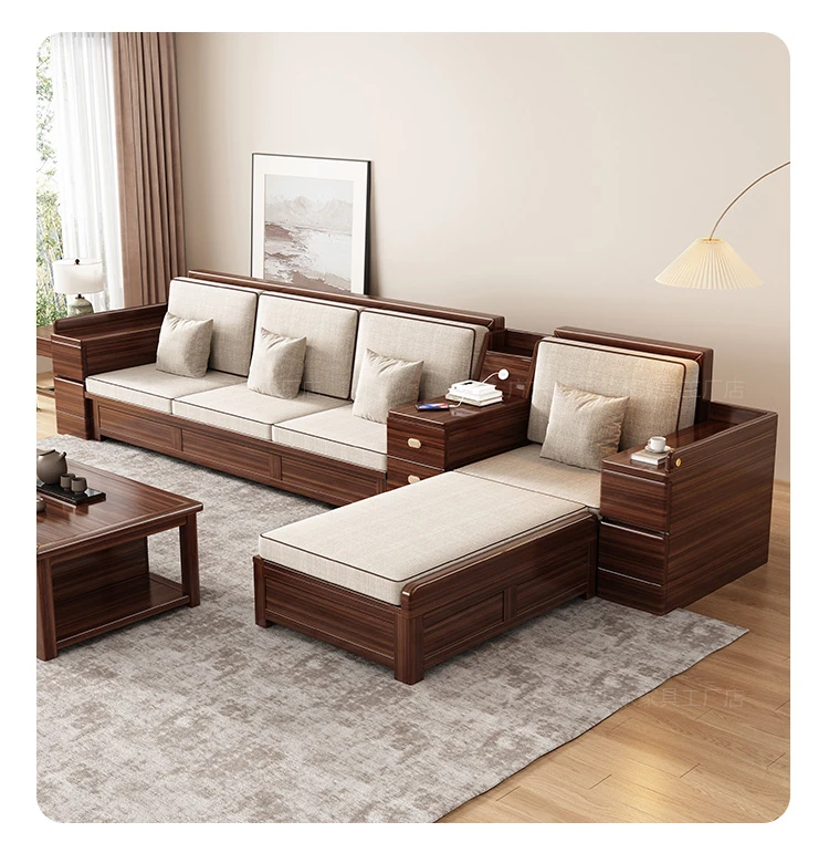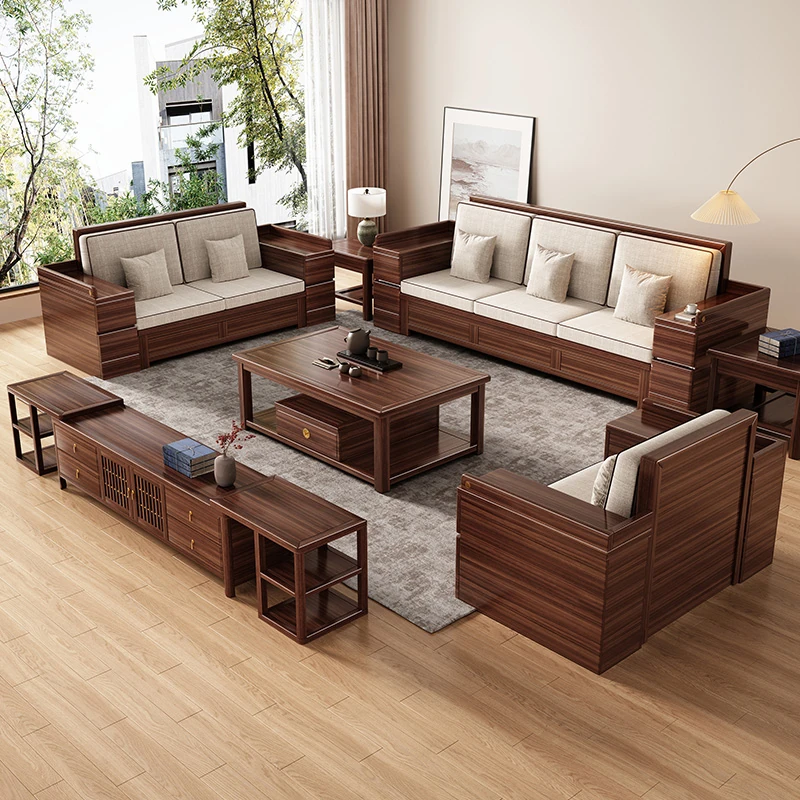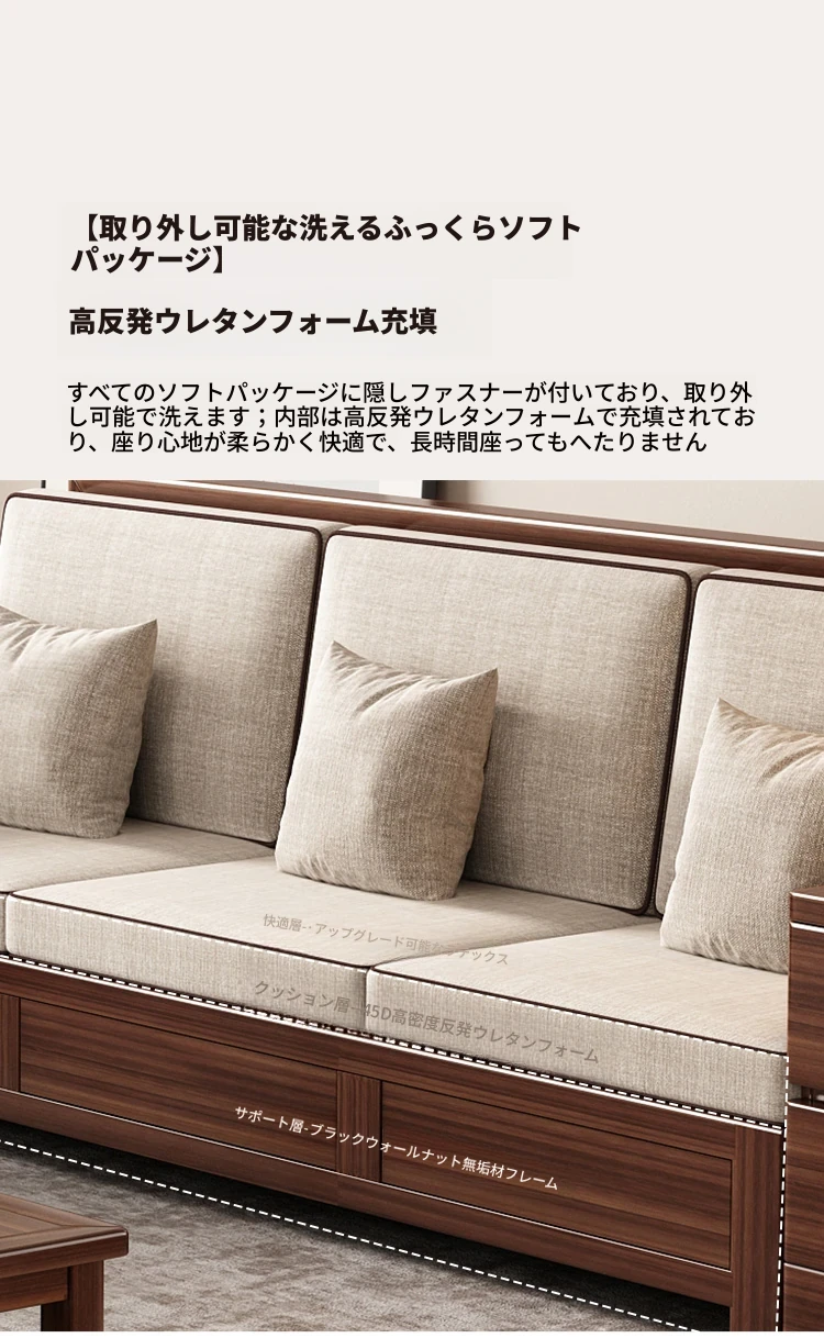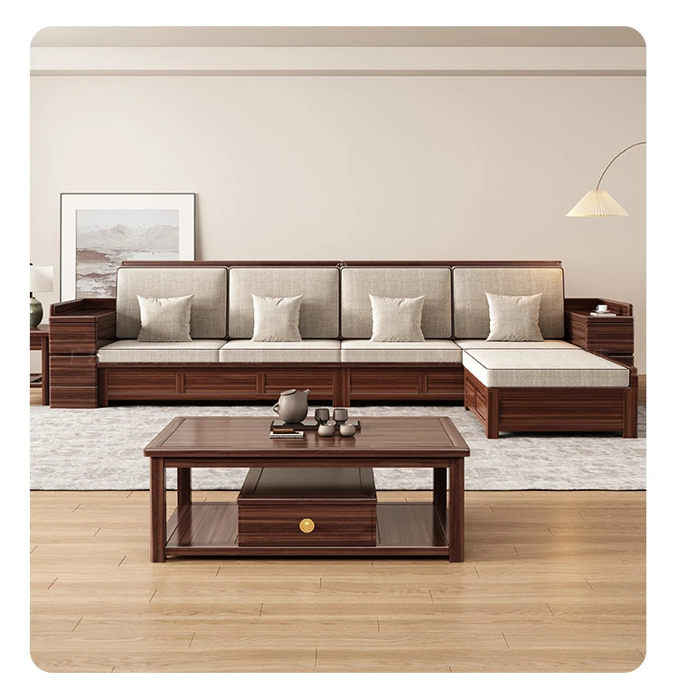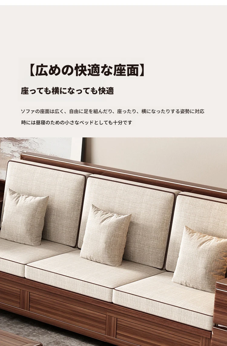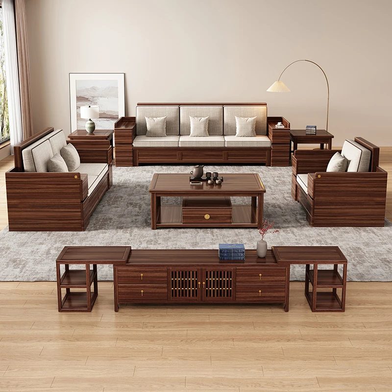 志遠家具の新中式スタイル、ブラックウォールナット製の実木ソファセット。冬は暖かく、夏は涼しい、北欧風の収納機能付きリビングソファで、快適な空間を提供します。