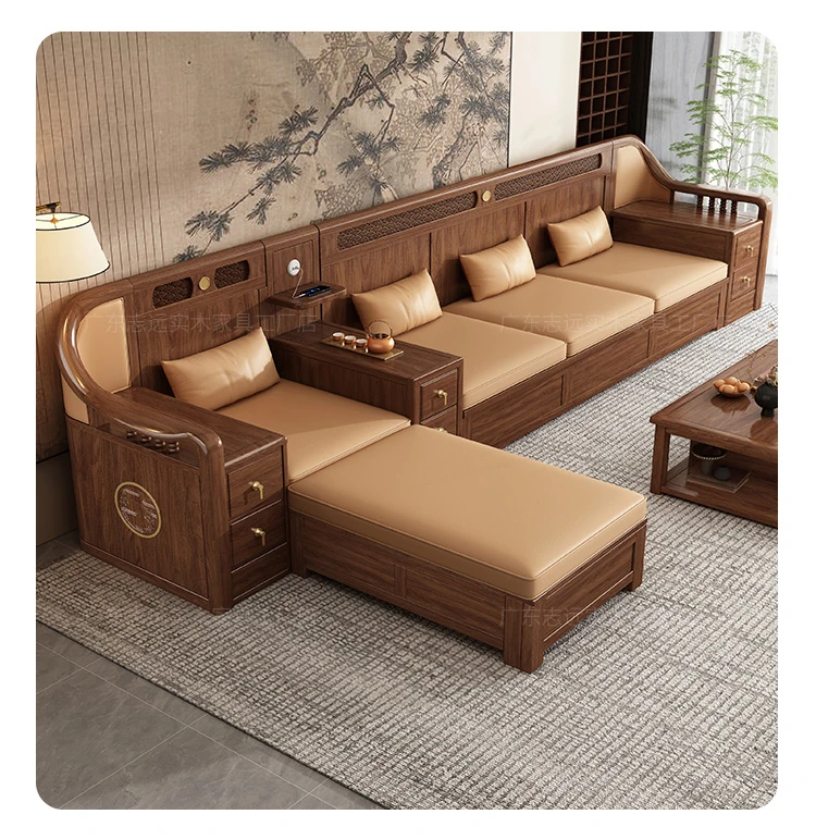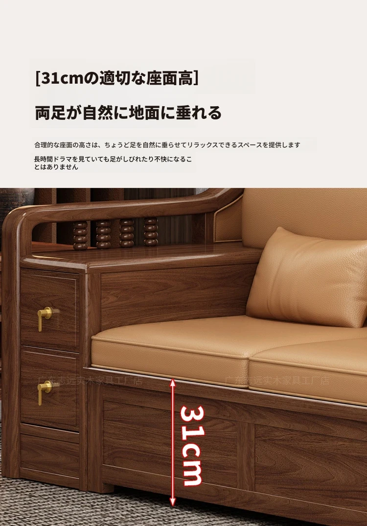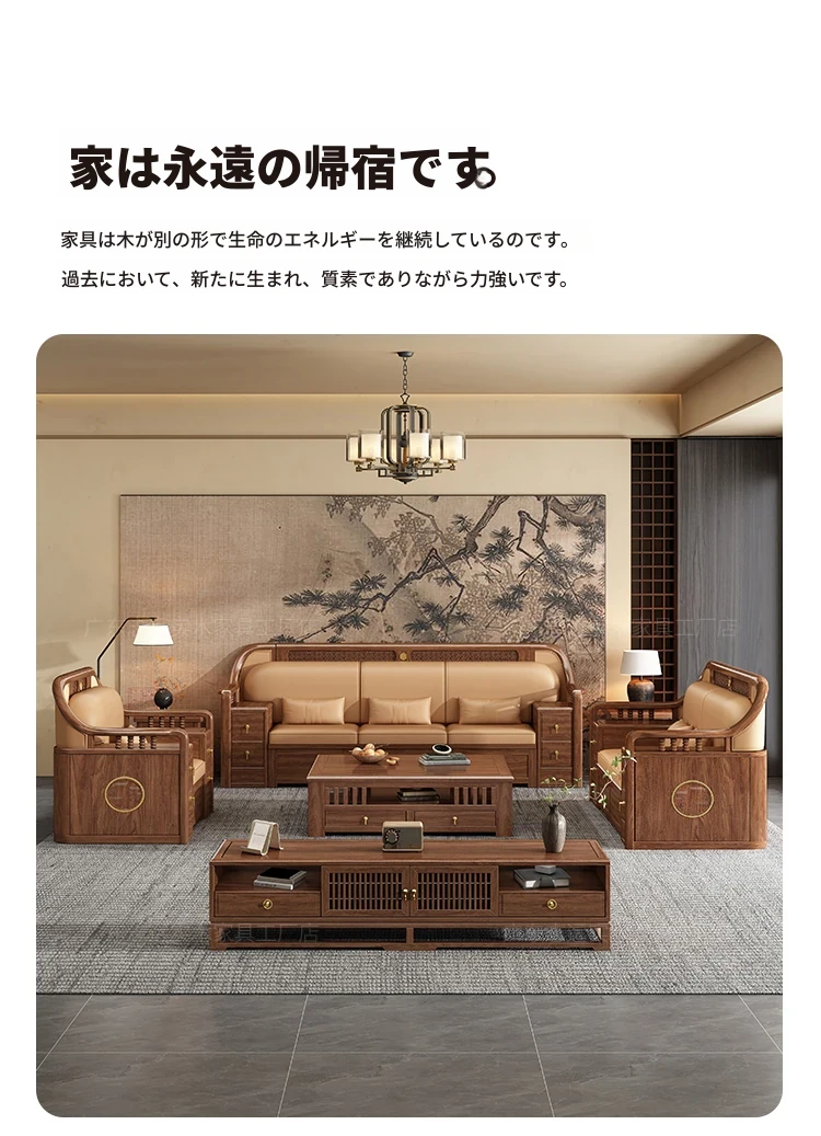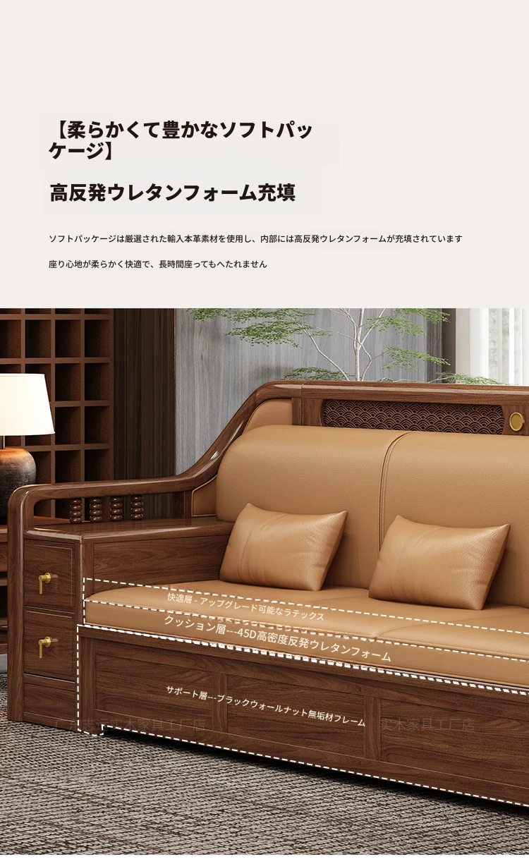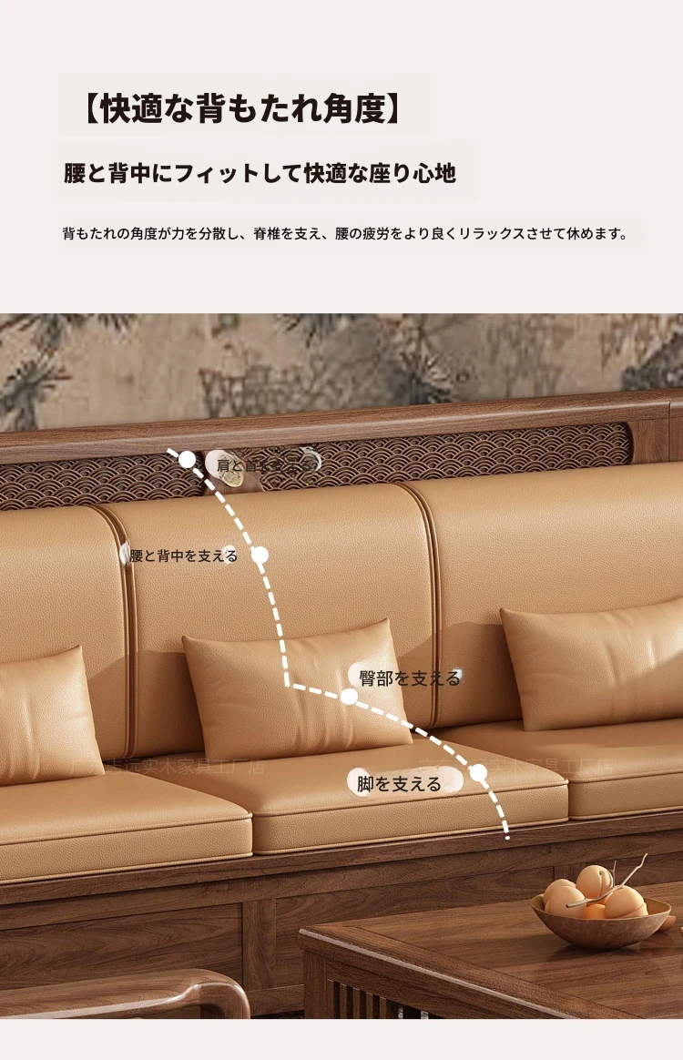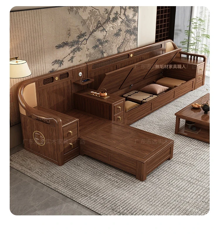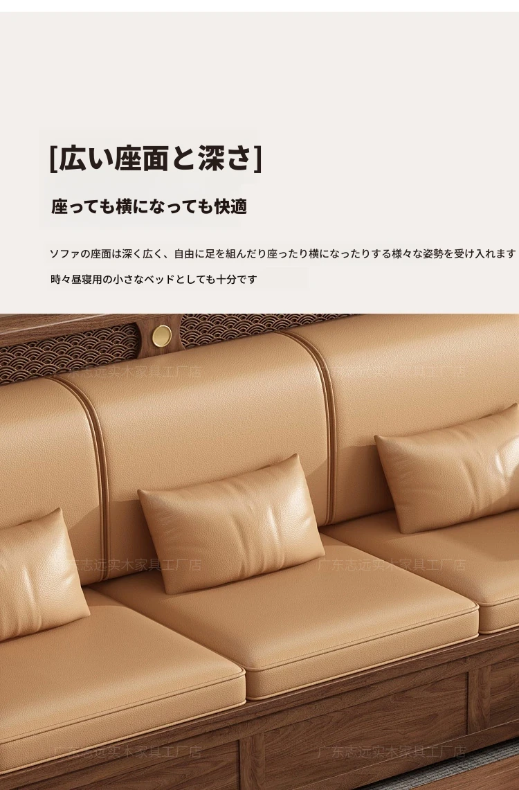 志遠家具の新中式スタイルの無垢材ソファ、ウォールナット製。冬も夏も使えるコンビネーションデザインで、リビングの収納にも最適。猫の爪研ぎにも強い、スタイリッシュで機能的なソファです。