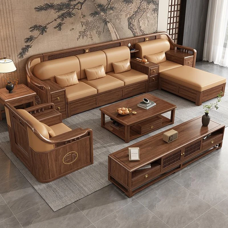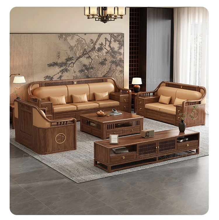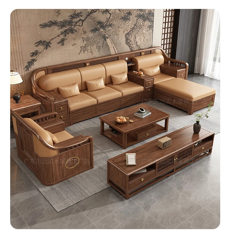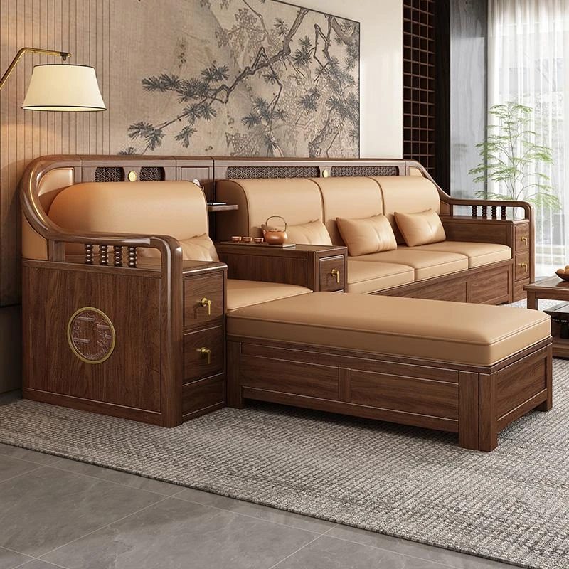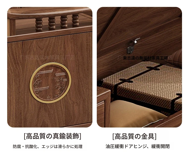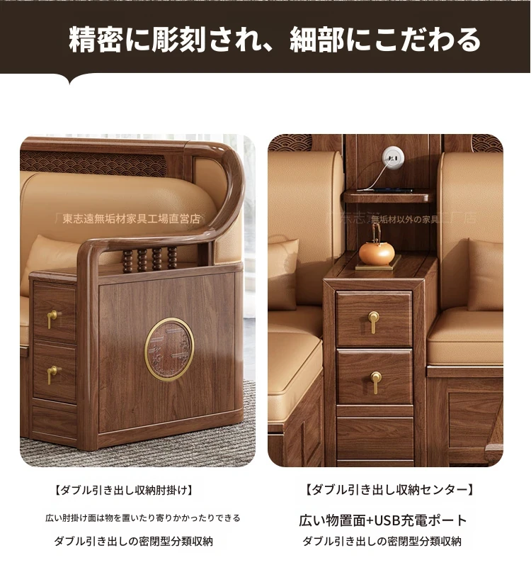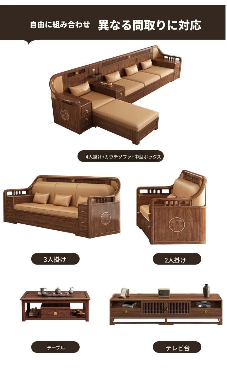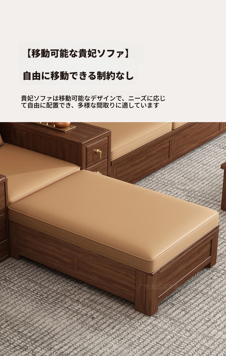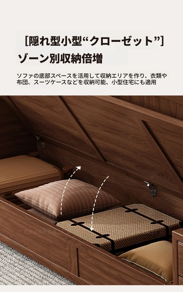 志遠家具の新中式スタイルの無垢材ソファ、ウォールナット製。冬も夏も使えるコンビネーションデザインで、リビングの収納にも最適。猫の爪研ぎにも強い、スタイリッシュで機能的なソファです。