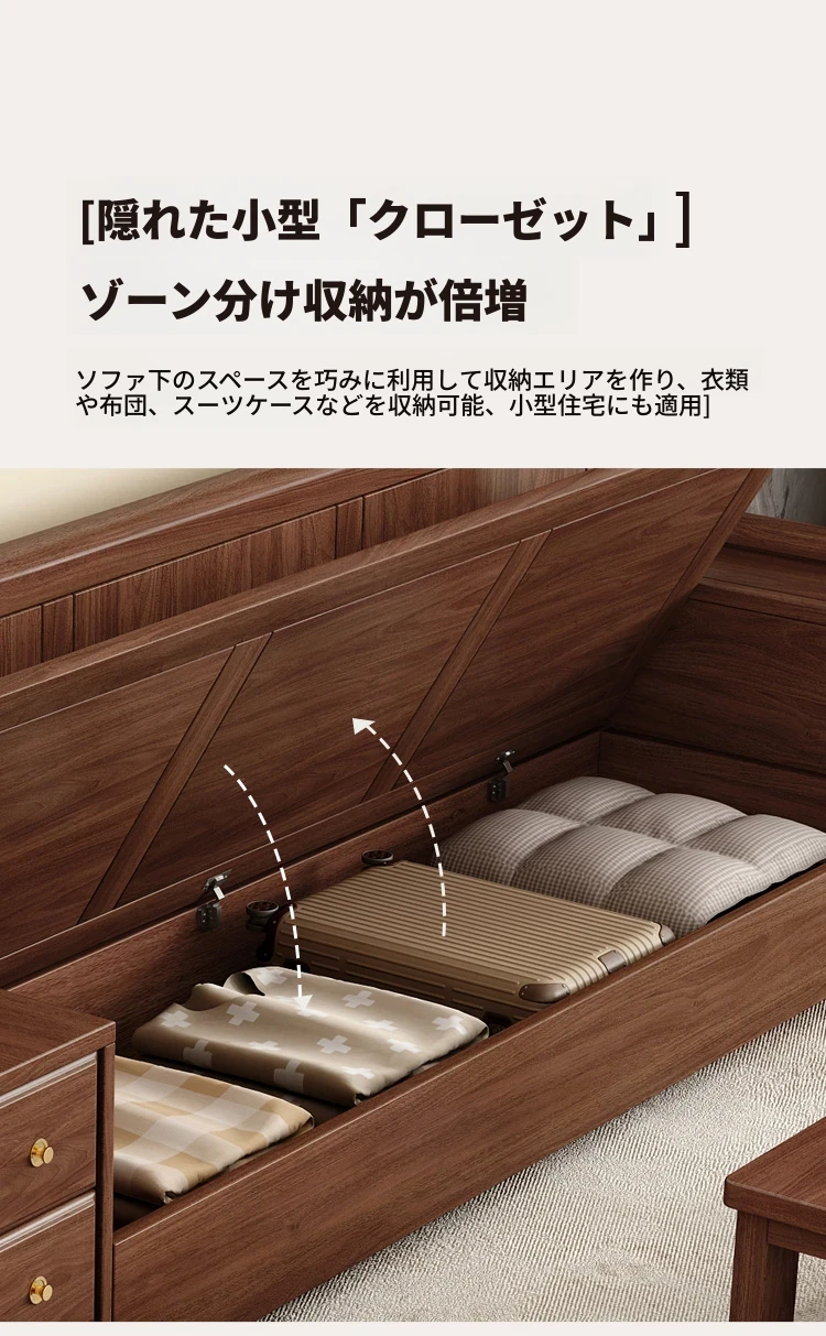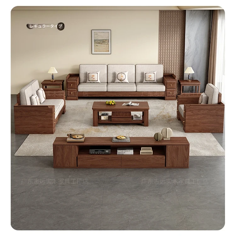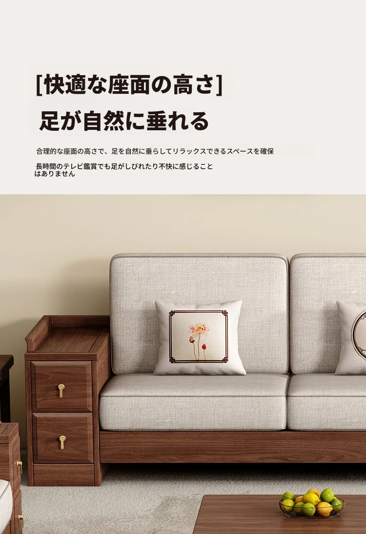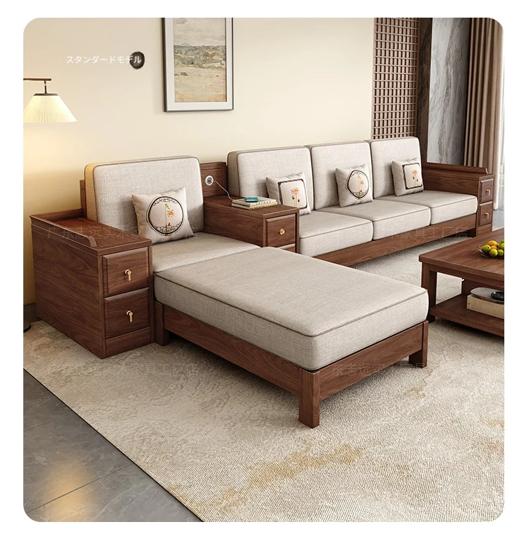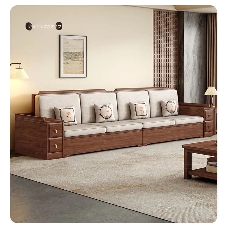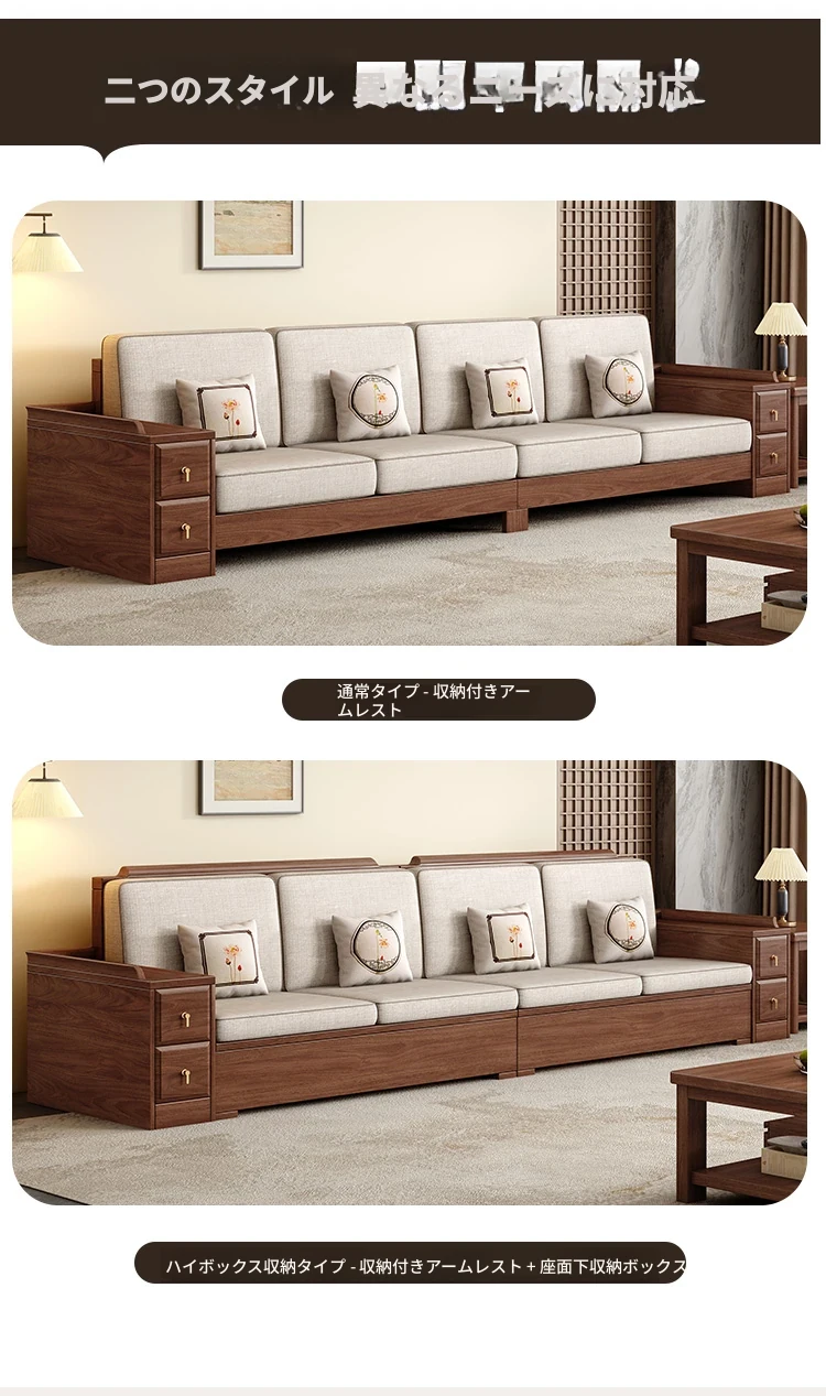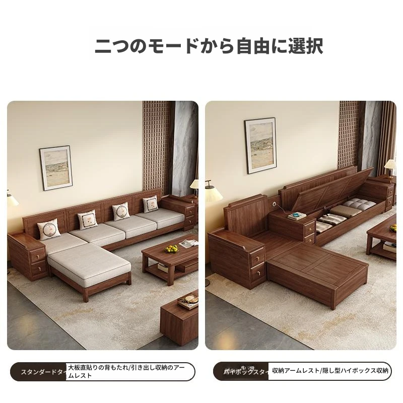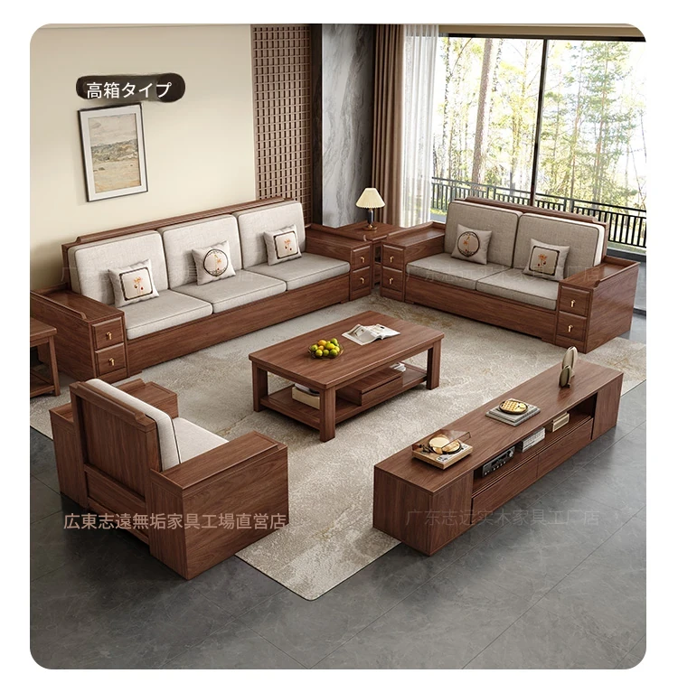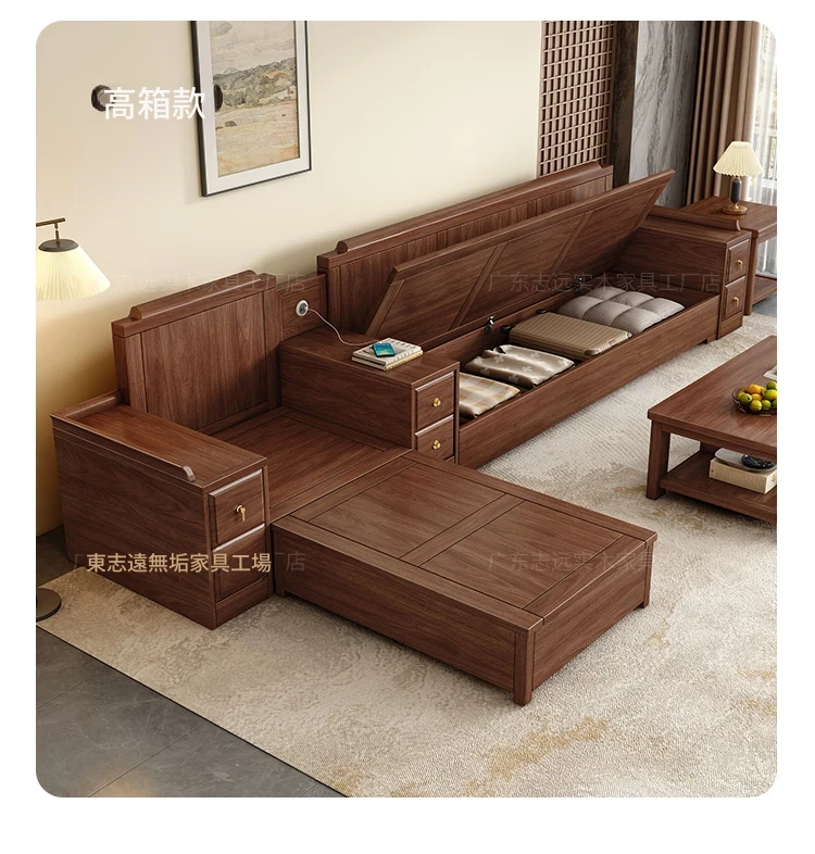 志遠家具の黒胡桃無垢材を使用した収納ソファセット - 新中式デザインで、広いお部屋にも小さなお部屋にもぴったり!収納機能付きで、スッキリとしたリビング空間を実現します。