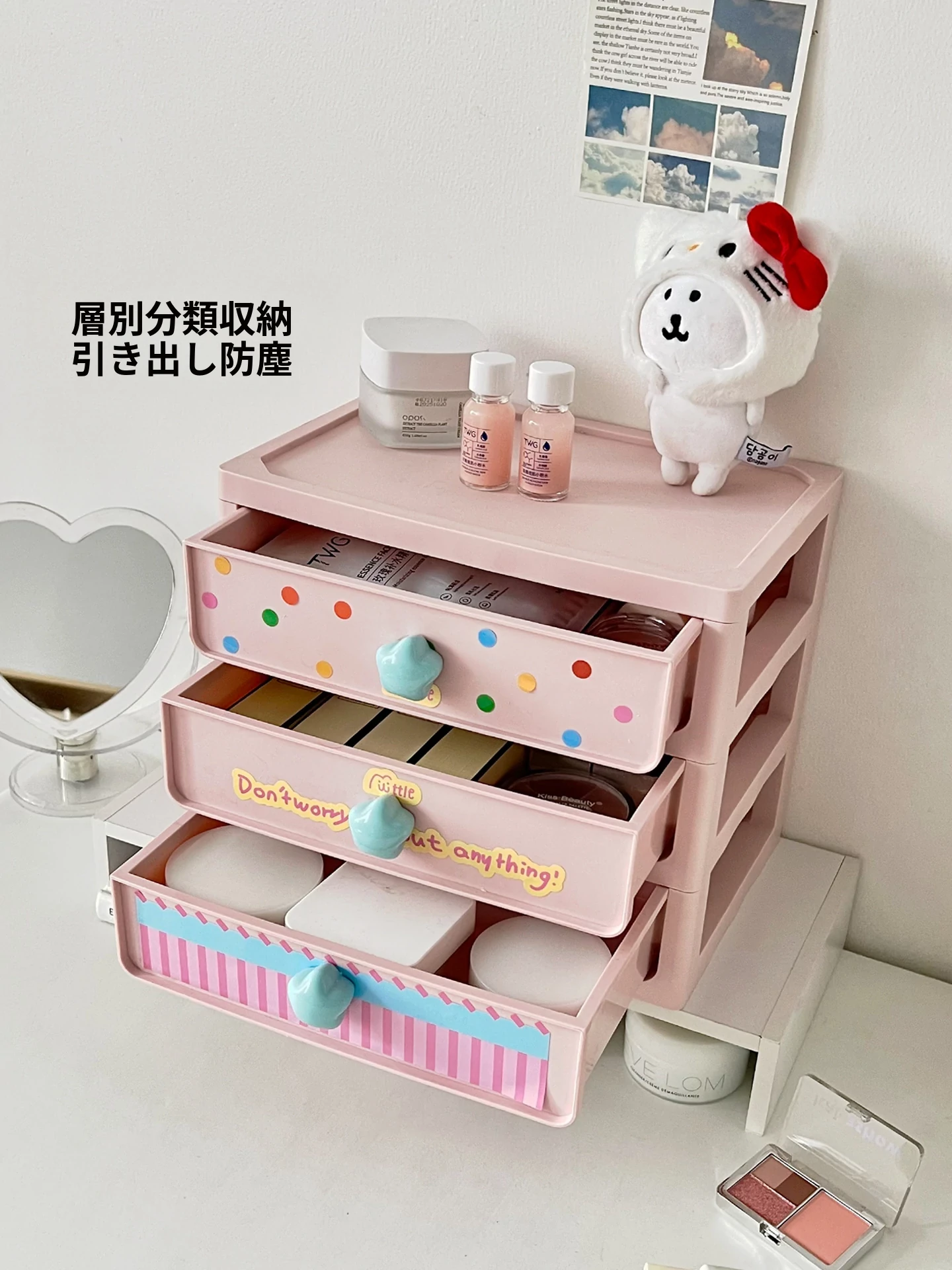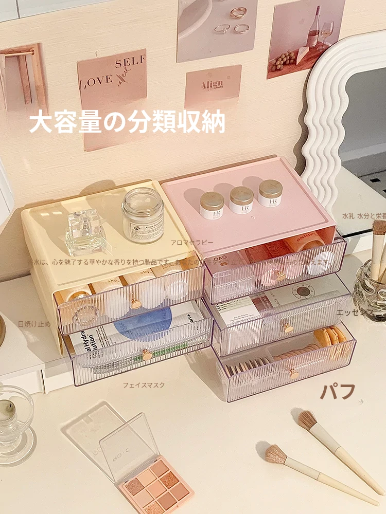 透明な引き出し式メイクボックス - デスク上の整理整頓に最適!学生にもぴったりの化粧品収納ボックスで、スッキリしたデスク環境を実現します。おしゃれで使いやすい収納アイテム!
