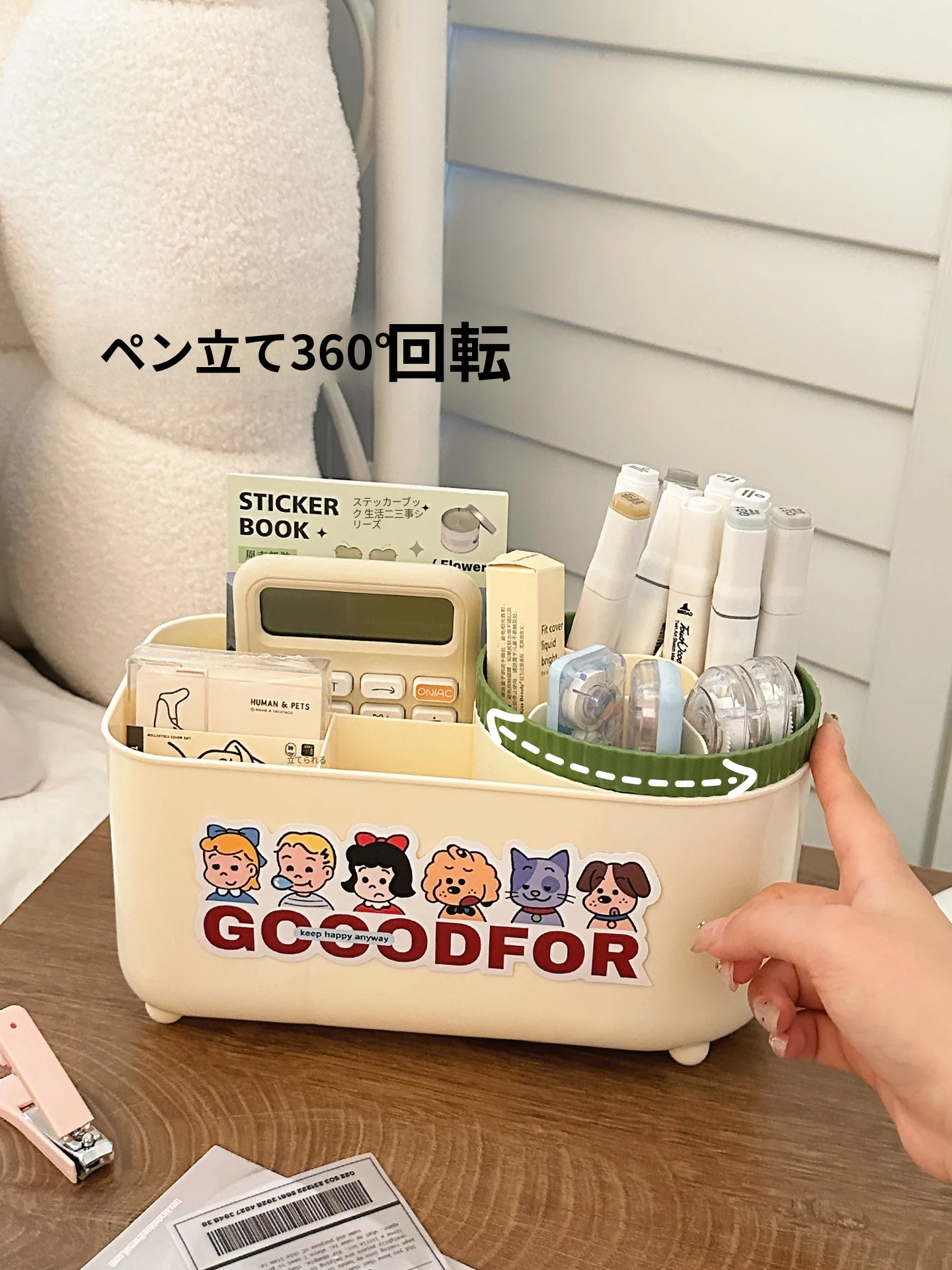 デスク上の整理整頓に最適!大容量回転ペン立て付き文房具収納ボックス - 学生寮やオフィスにぴったりな小物整理に。使いやすい仕切り付きで、すっきりとしたデスク環境を実現!