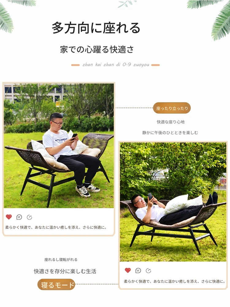 リラックスできるバルコニー用ラタン製ロングチェア!シンプルでスタイリッシュなデザイン、家庭用にもぴったりな二人掛けアウトドアソファ。快適なひとときをお楽しみください。