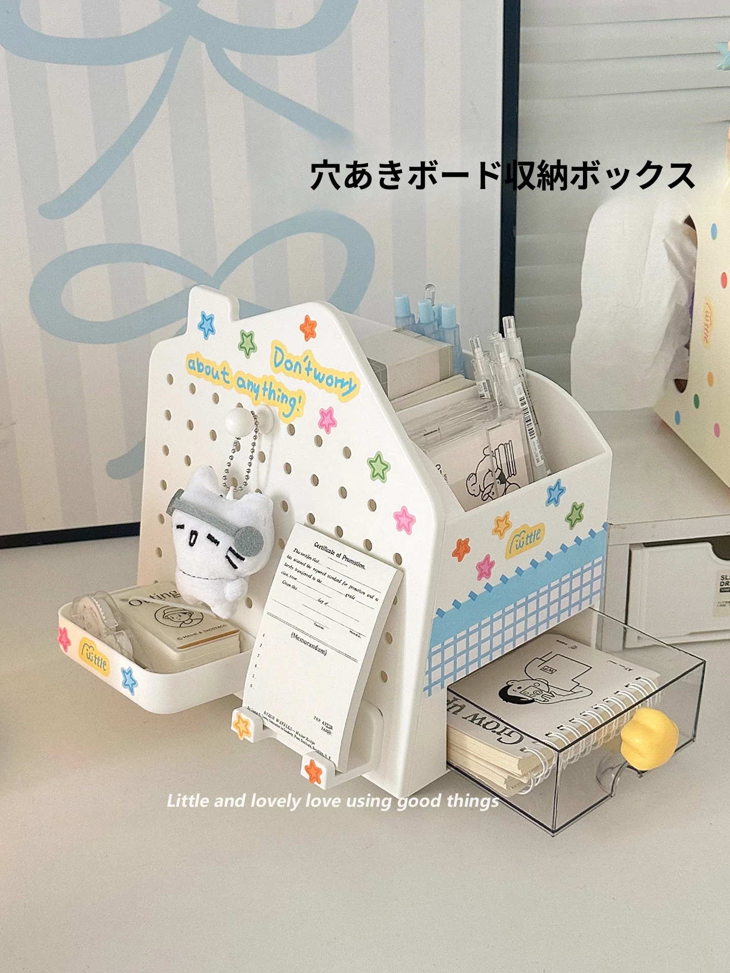 小さな家のデスク用穴あき収納ボックス - ティッシュボックス&スマホスタンド機能付き!多用途文房具&雑貨整理棚で、デスクをすっきり整頓!