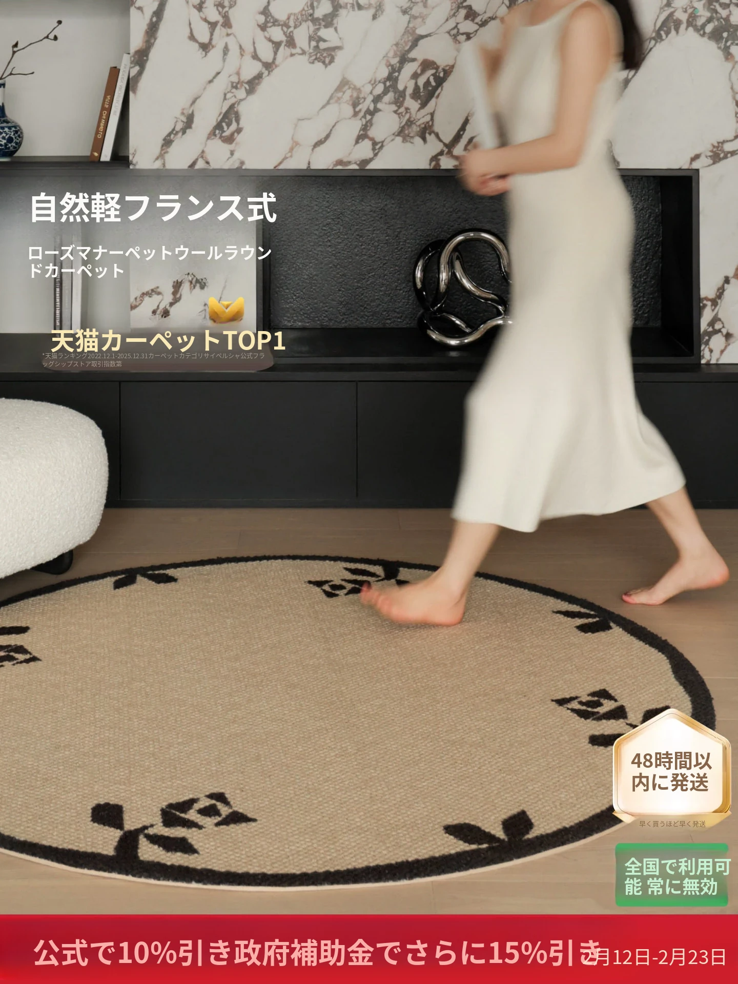 人気のサイポススタイル!フレンチラグジュアリー円形カーペット、防水・ノーグルー仕様でリビング・寝室・ベッドサイド・クローゼットに最適!おしゃれで機能的な空間を演出します。