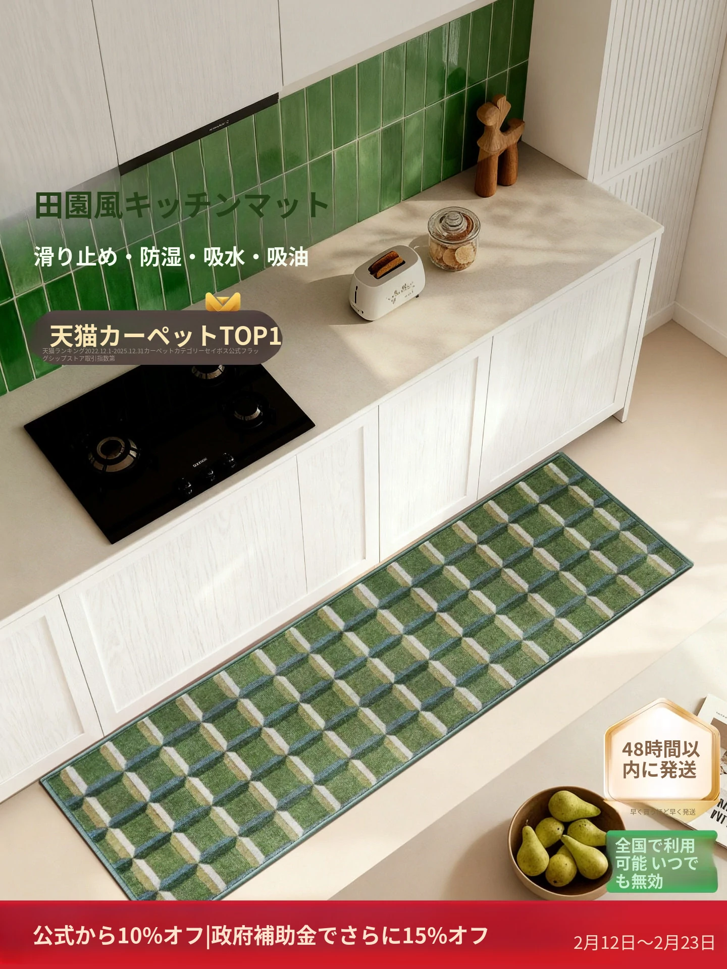セイボス キッチンマット - 中古風デザインの吸水・吸油機能付き、洗える玄関マット。汚れに強く、幾何学的アートの長方形ラグで、あなたの空間をスタイリッシュに演出します。