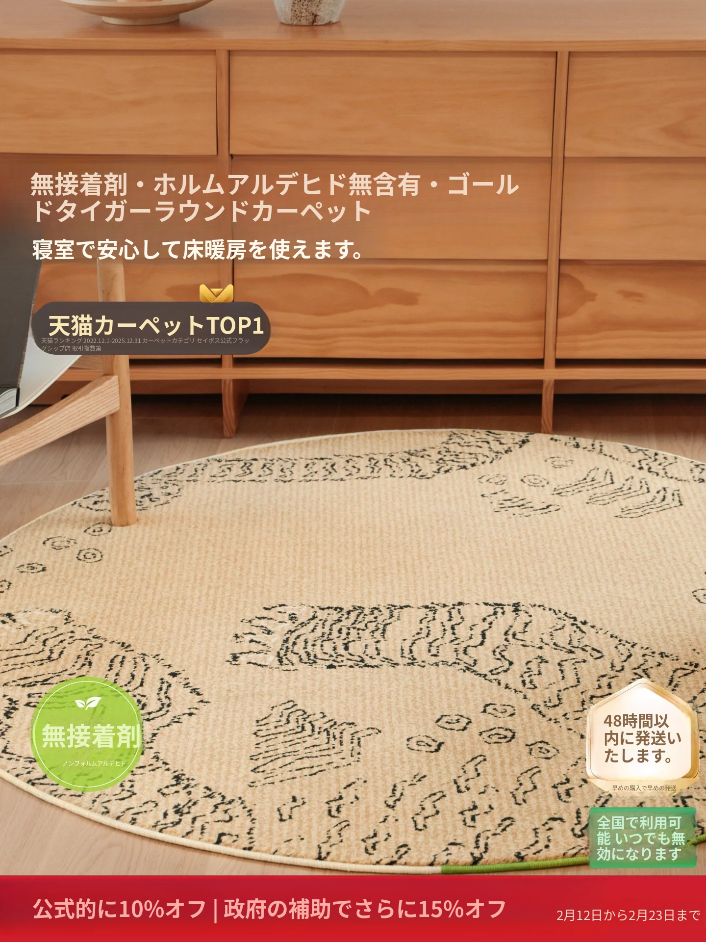サイボス無ホルムアルデヒド抗菌ノーグルー虎柄ラウンドカーペット - 寝室やリビングに最適な軽やかなラグで、中古青山の美宿での特別な体験を演出します!