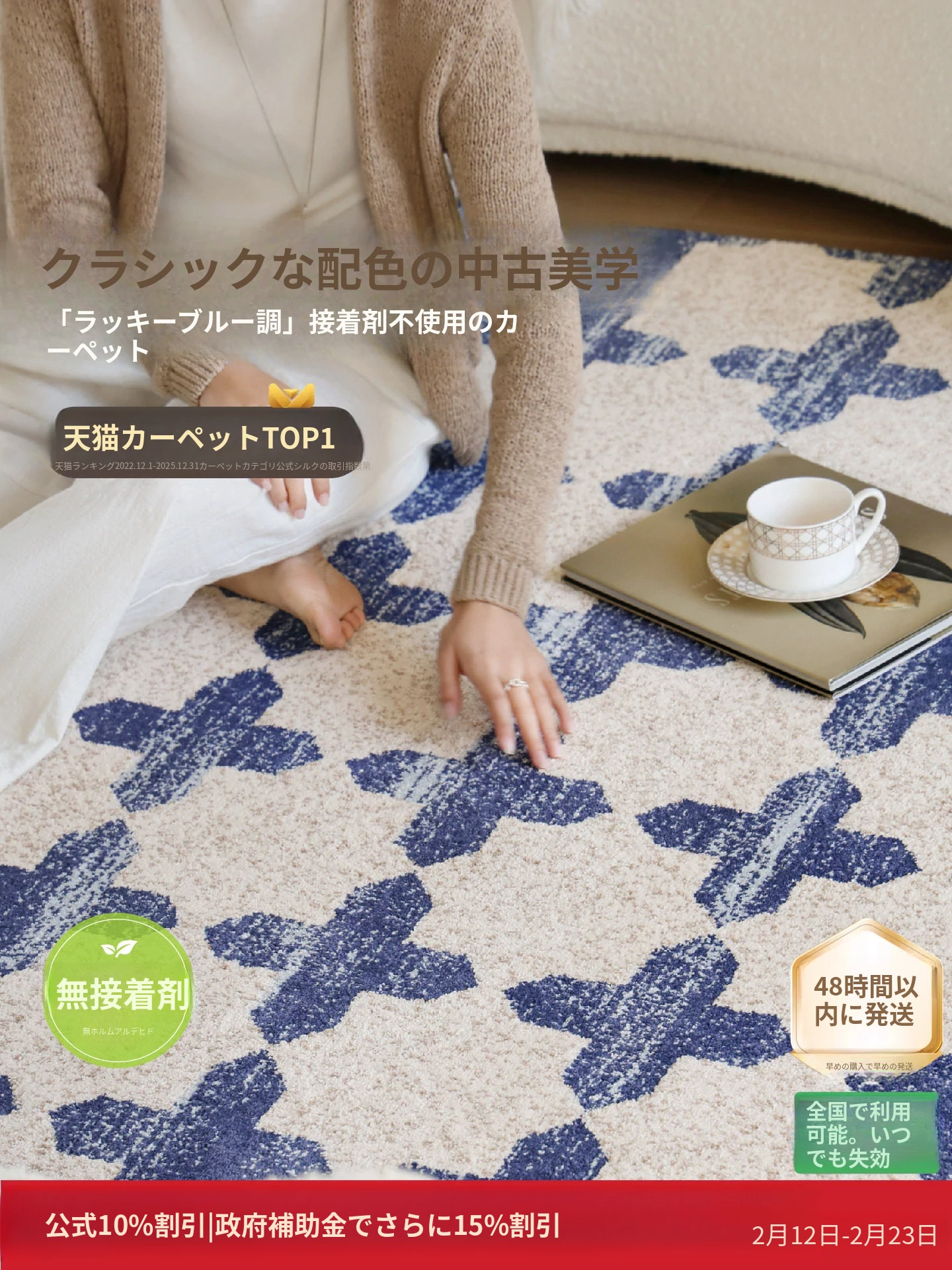 サイボスのラッキーブルー調中古風無接着剤カーペット、防水仕様!フレンチスタイルのリビングルームにぴったりな、軽やかで上質な高級寝室用2026年新作。