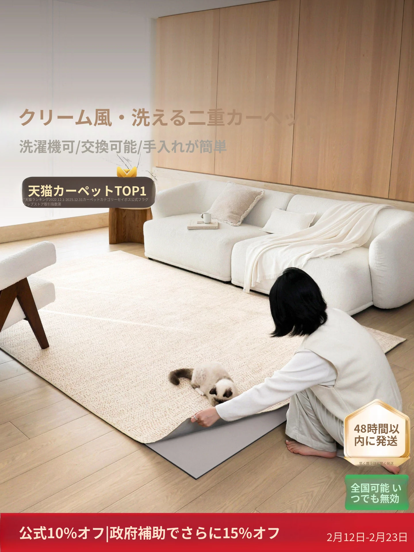 セイボスホワイトマウンテンティー ダブルレイヤーカーペット おしゃれで洗えるリビング用 シンプルでクリーミーな風合い 高級感のある寝室に最適
