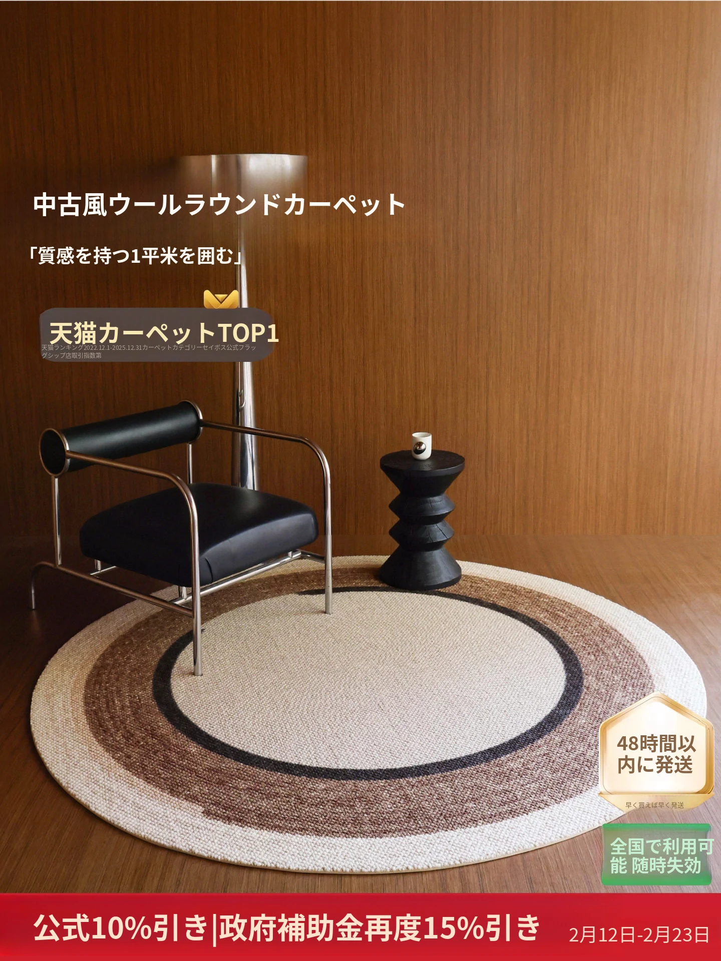 サイボス云回の輸入ウールラウンドカーペット - 無垢材のヴィンテージ風で、軽やかなラグジュアリー感を演出!寝室やクローゼット、リビングに最適な高級感溢れるアイテムです。