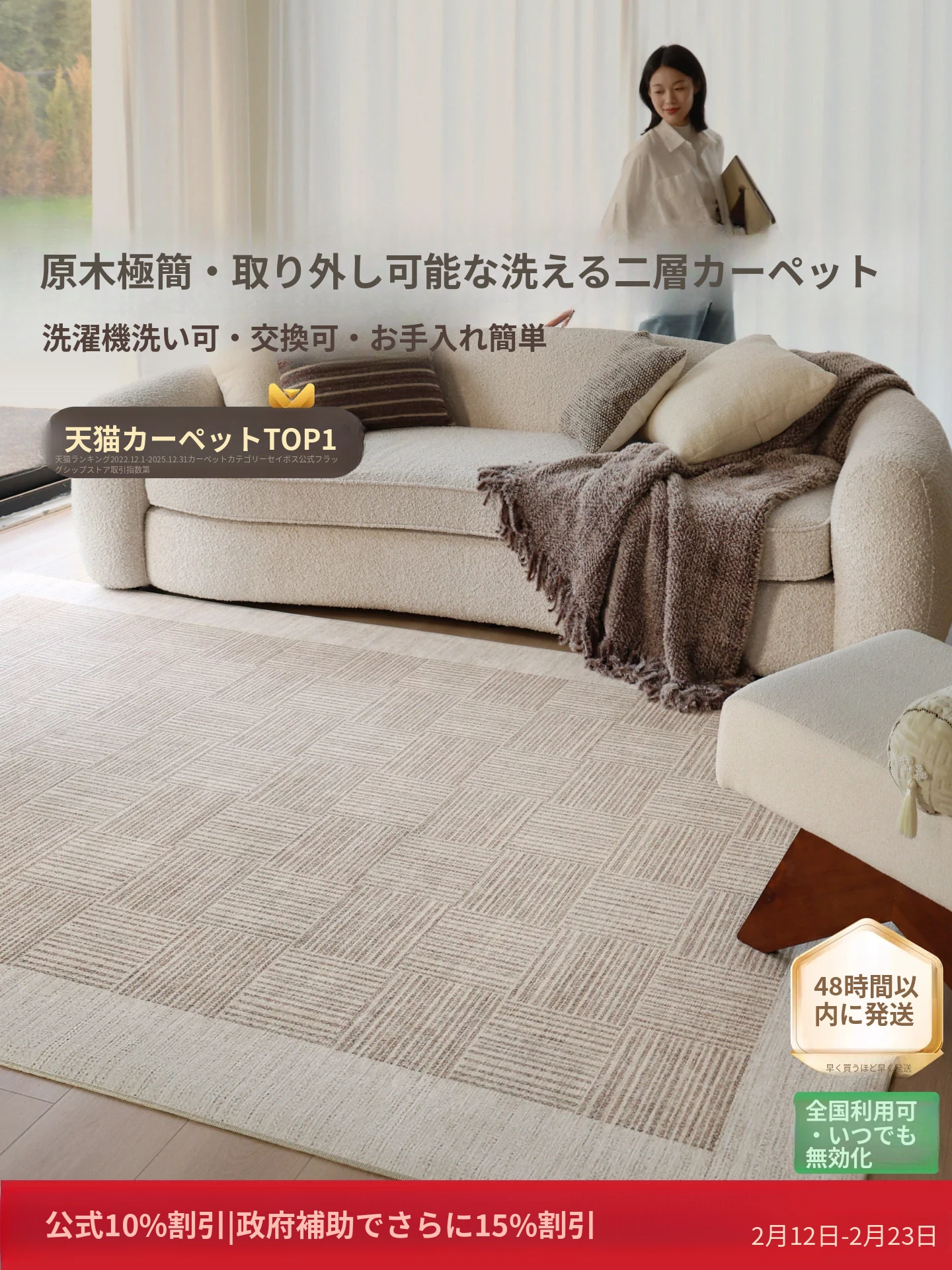 サイボス麦田デザインの洗える二重層ラグ - リビングルームやソファにぴったりの軽奢で高級感あふれる原木風ミニマルスタイル!手軽に洗えて、いつでも清潔に保てます。