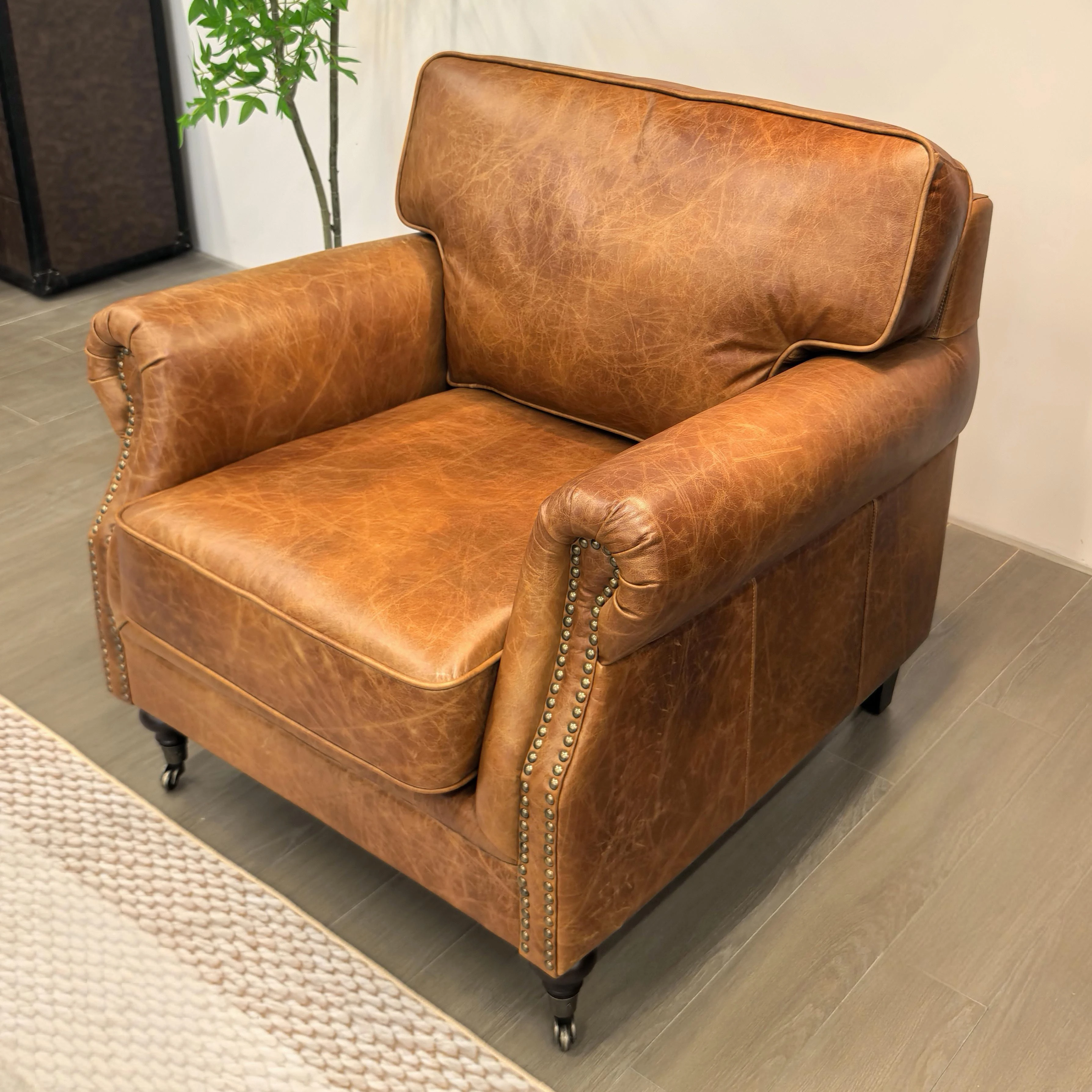 アメリカンヴィンテージ本革ソファ - 高級トップグレイン牛革使用!キャラメルカラーの一人掛けリクライニングチェア、レトロなデザインでおしゃれな虎椅子。シガーバーでのくつろぎタイムに最適!