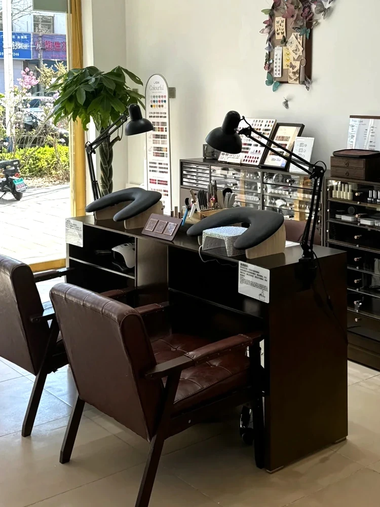 おしゃれなネイルテーブル&チェアセット!お客様専用のリラックスソファチェア付き。ヴィンテージ風の本格的なネイルサロン体験を実現する、木製ネイル師用椅子とテーブルのコンビネーション。あなたのサロンを格上げしましょう!