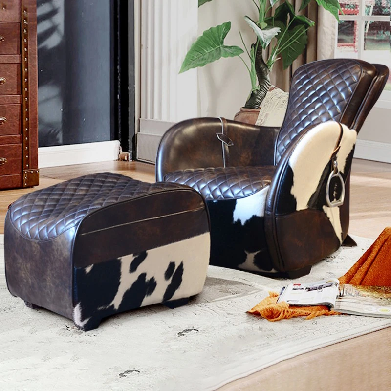 アメリカンスタイルのシガーアームチェア - 本革の牛革製、リビングにぴったりのウイスキー&シガーバー用。ユニークなサドルデザインとレトロな雰囲気で、寛ぎのひとときを演出します。